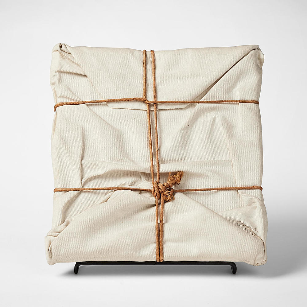 "Wrapped book", book wrapped in canvas and with string.