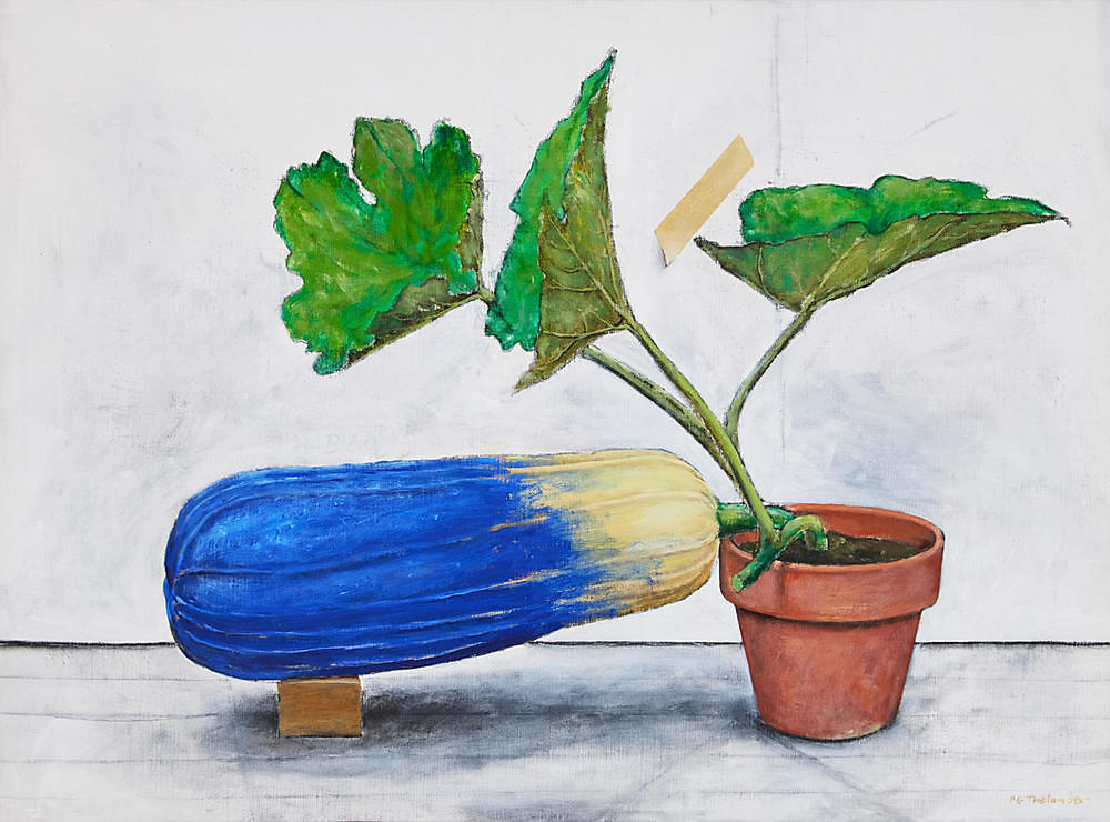 Thelander’s work is instantly recognisable for its playful, enigmatic and often humorous style. He effortlessly blends motifs from classical art with his own imaginative inventions, creating compositions that surprise and delight viewers. His paintings, prints, and sculptures are populated by unexpected objects – nuts, bolts, patches, ribbons, and everyday items – placed in seemingly ordinary scenes featuring animals such as penguins, turtles, ostriches and frogs. Occasionally, these are joined by abstract elements like blue cubes, orange carrots or polka-dotted mushrooms, all contributing to a sense of whimsy and visual intrigue.