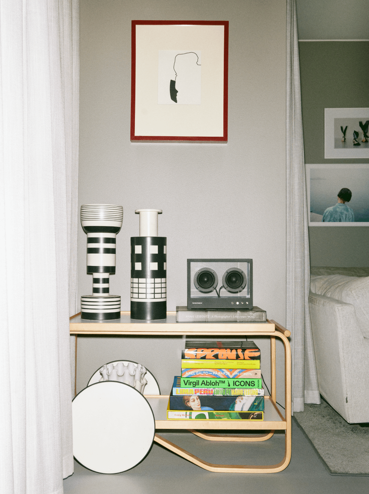 På serveringsvagnen av Alvar Aalto står två höga keramikvaser av Ettore Sottsass. Den legendariske italienske designern som på 80-talet startade Memphisgruppen, en samling unga
