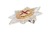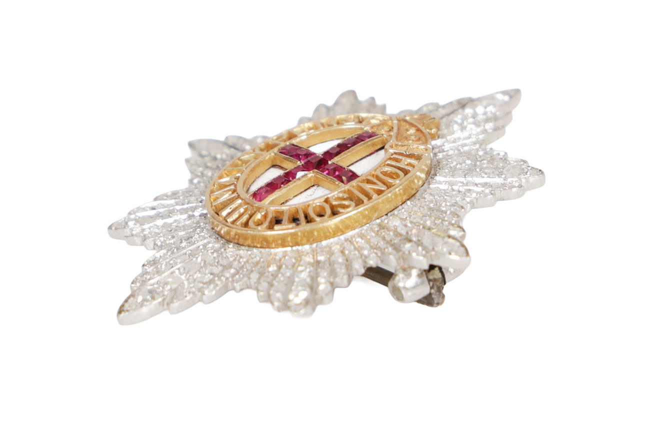 Having an eight pointed star decorated with diamonds and a enamel ring inscribed "HONI SOIT QUI MAL PENSE", and with a cross formed of baguette cut rubies to the centre, 3.5cm high weight 7.7 grams.