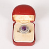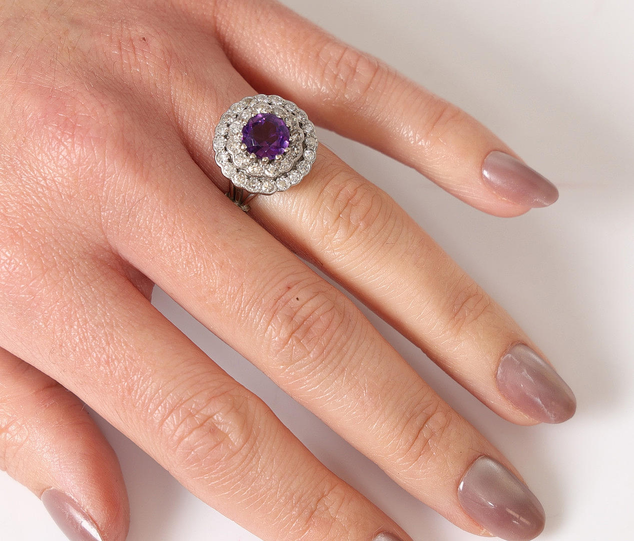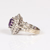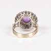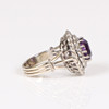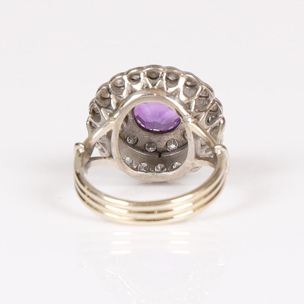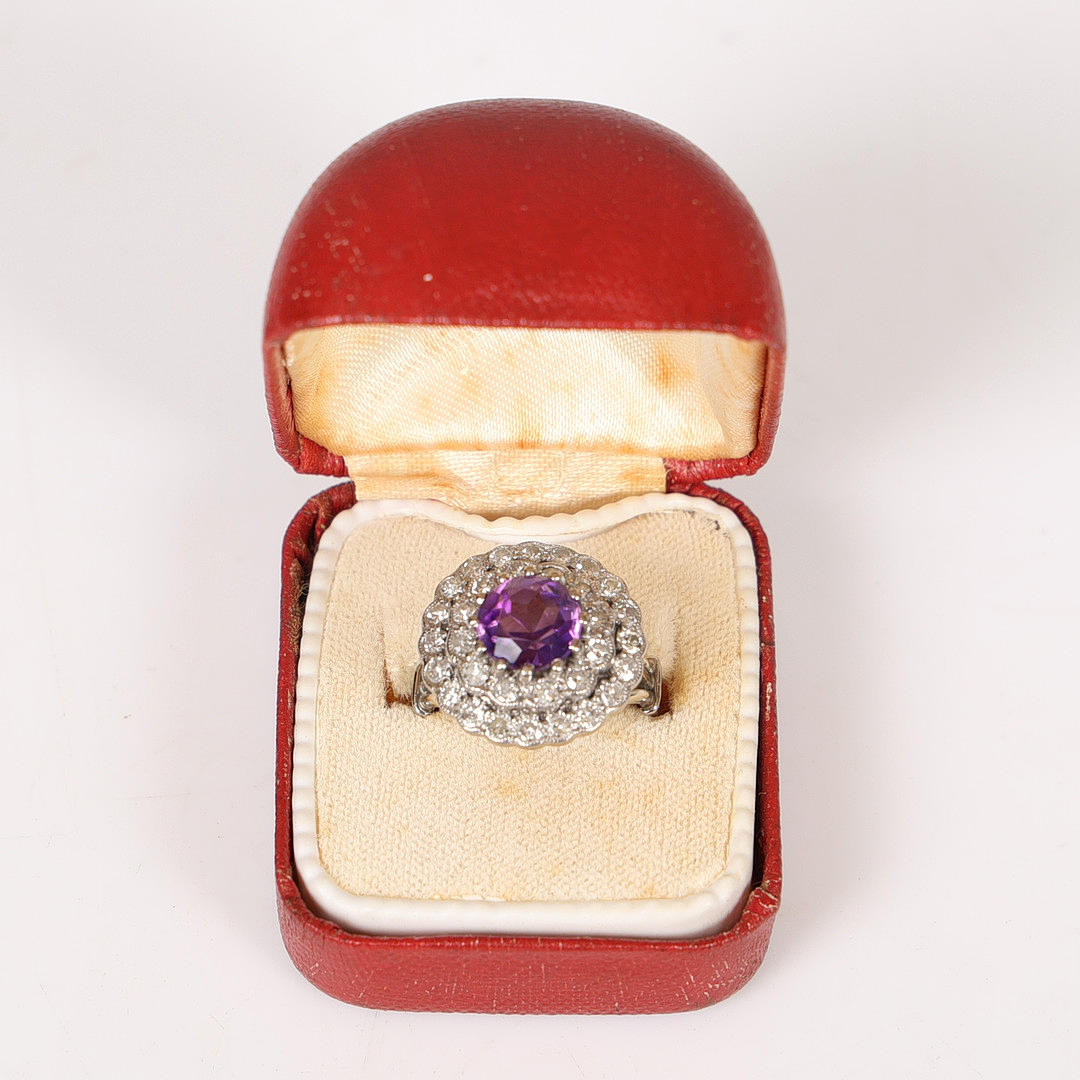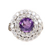 Set with one principle round faceted deep purple amethyst, measuring approx. 8mm. Sounded with two single-cut diamond set halo clusters. A total diamond carat weight estimated approx. 0.66ct. Mounted in an unmarked white metal. Head diameter approx. 17.5mm. Open work trifurcated shoulders and a 3.5mm width shank. Finger size K.5. Weight 7.28g.