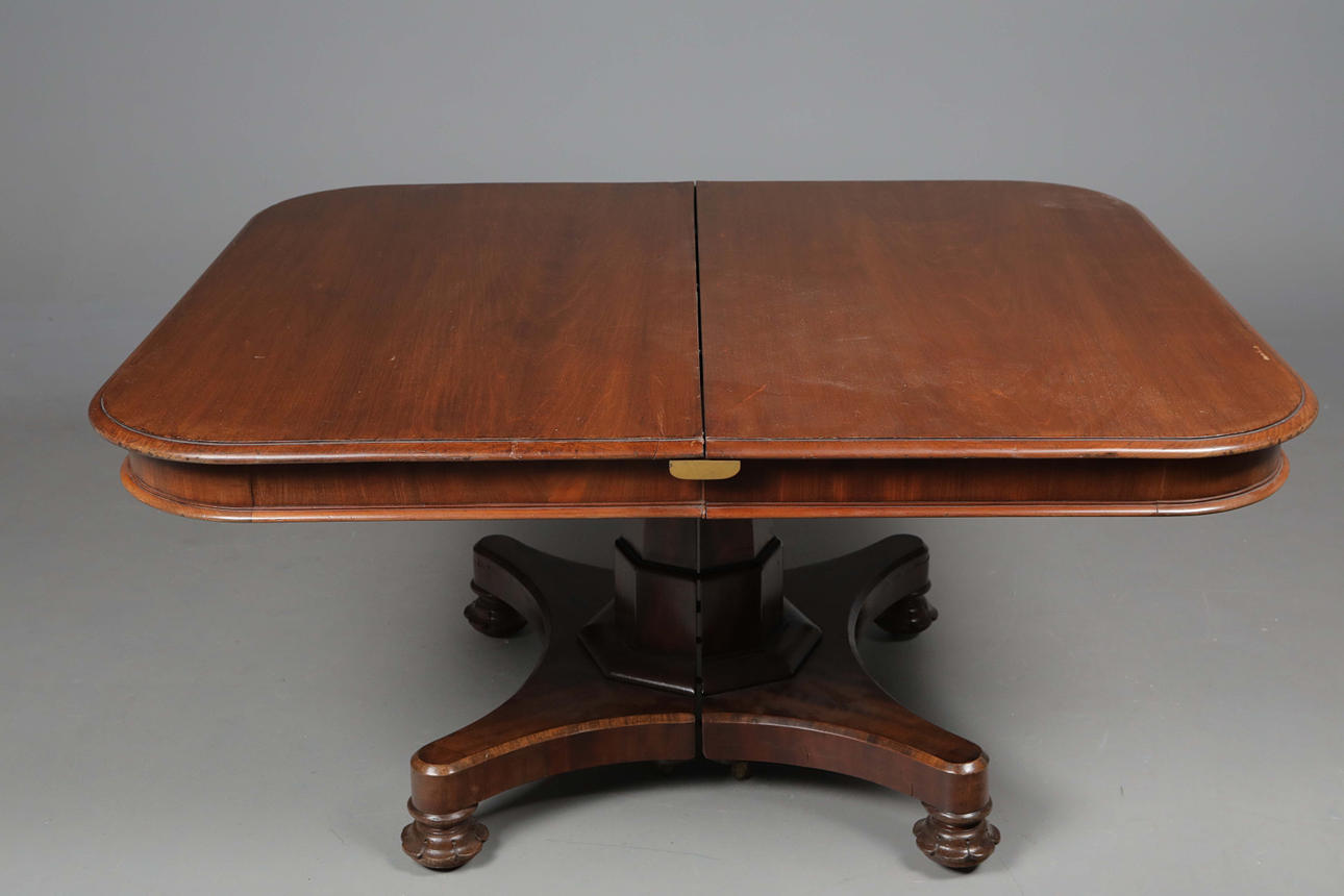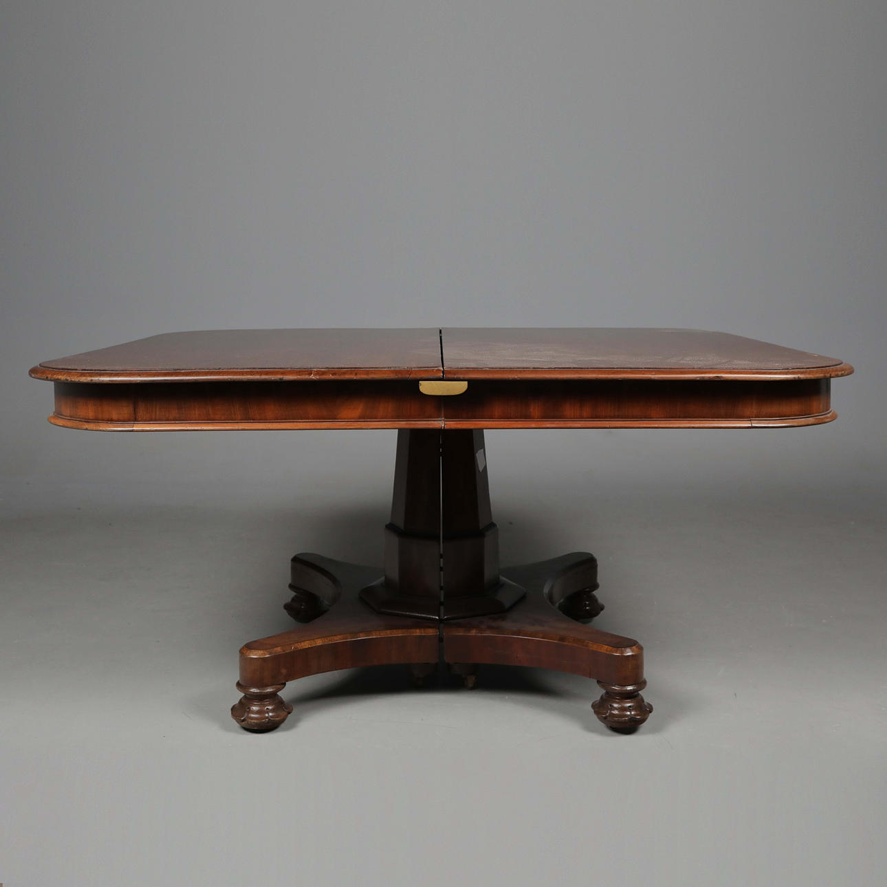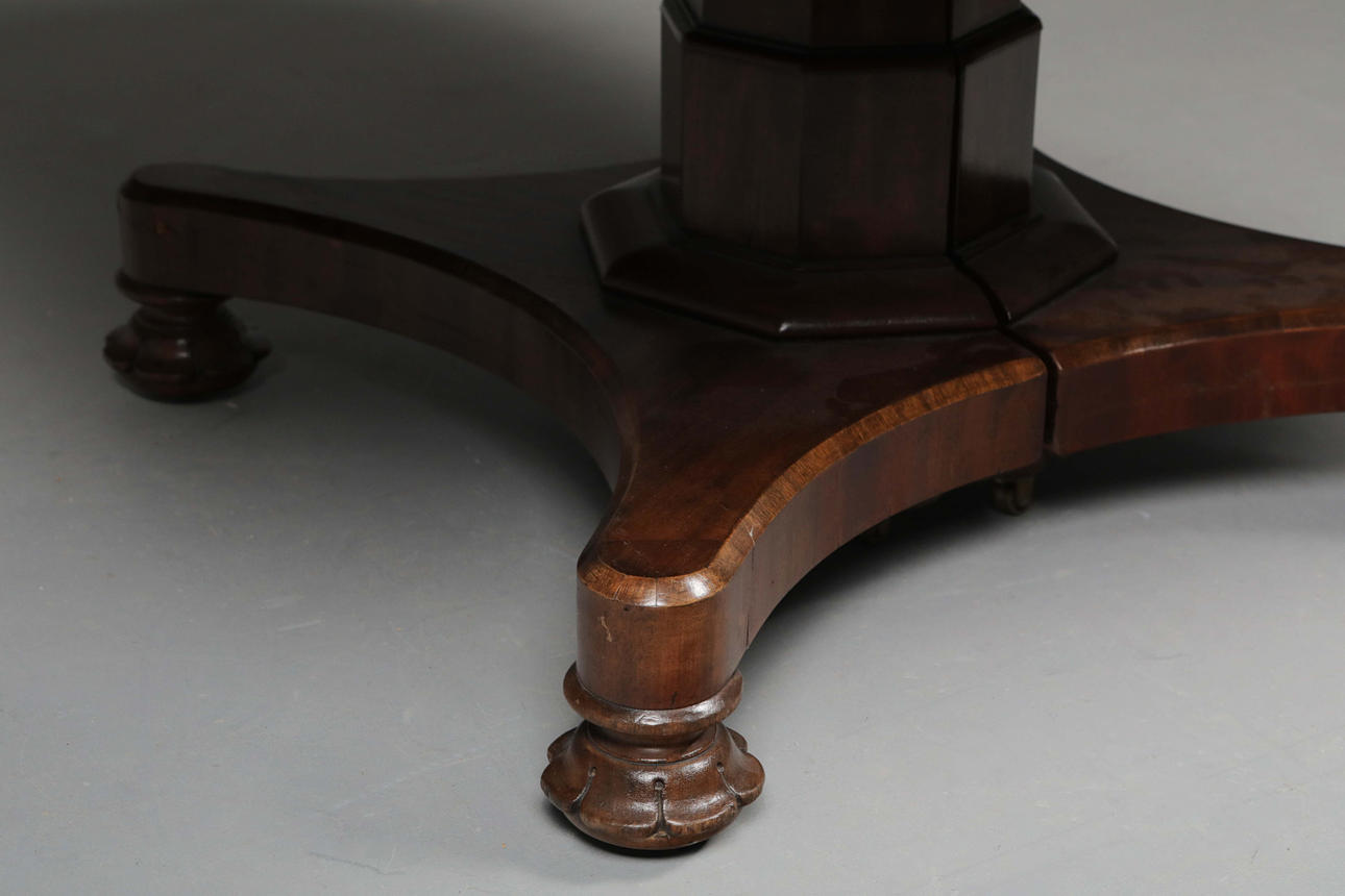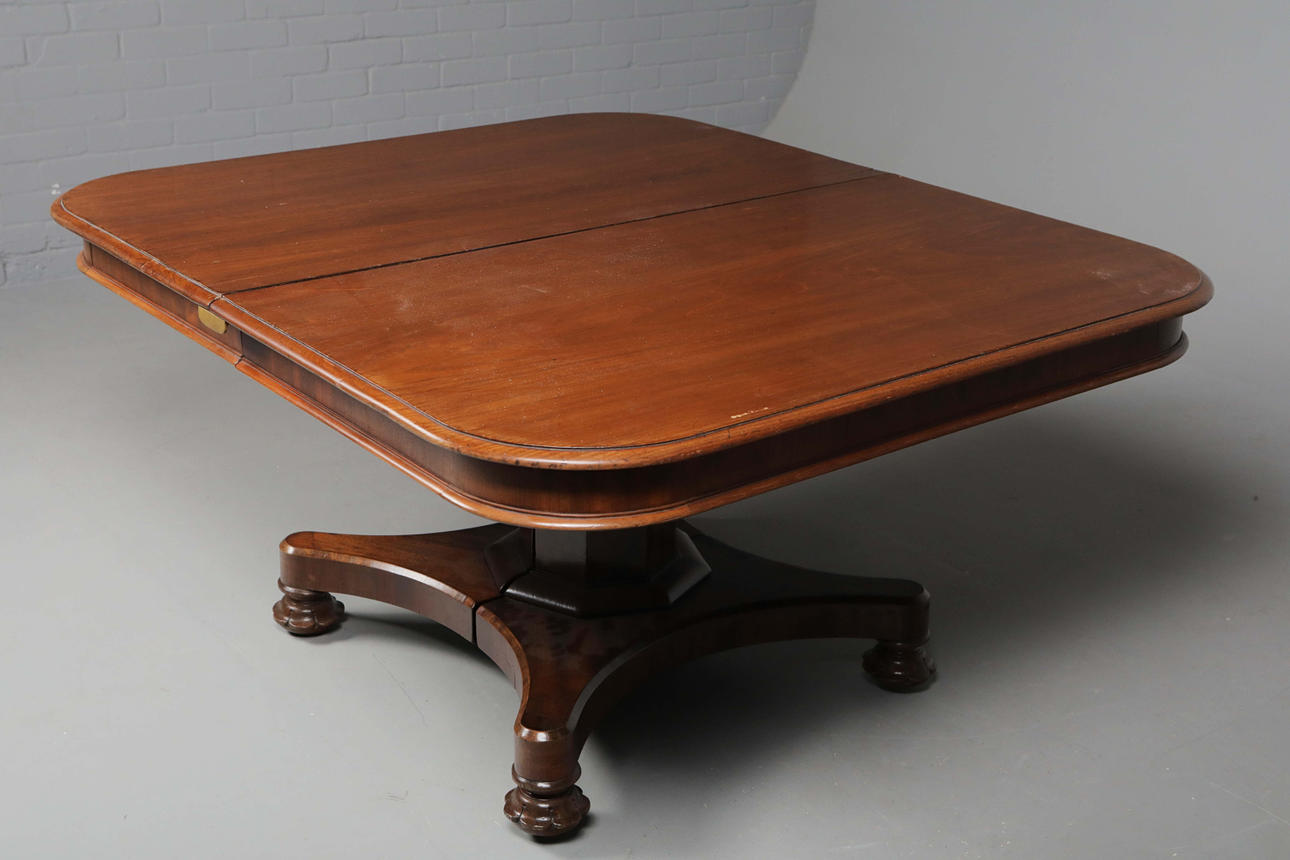 Second quarter 19th century mahogany, 75cm t x 143cm l x 126 cm d the facetted divided column opening to allow two extra leaves, one 71cm w the other 60 cm w, on a shaped base.