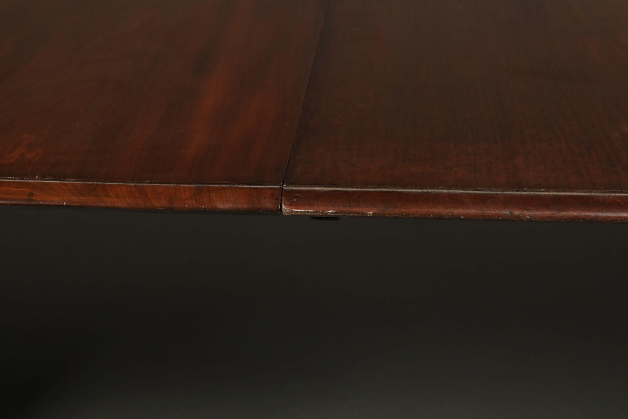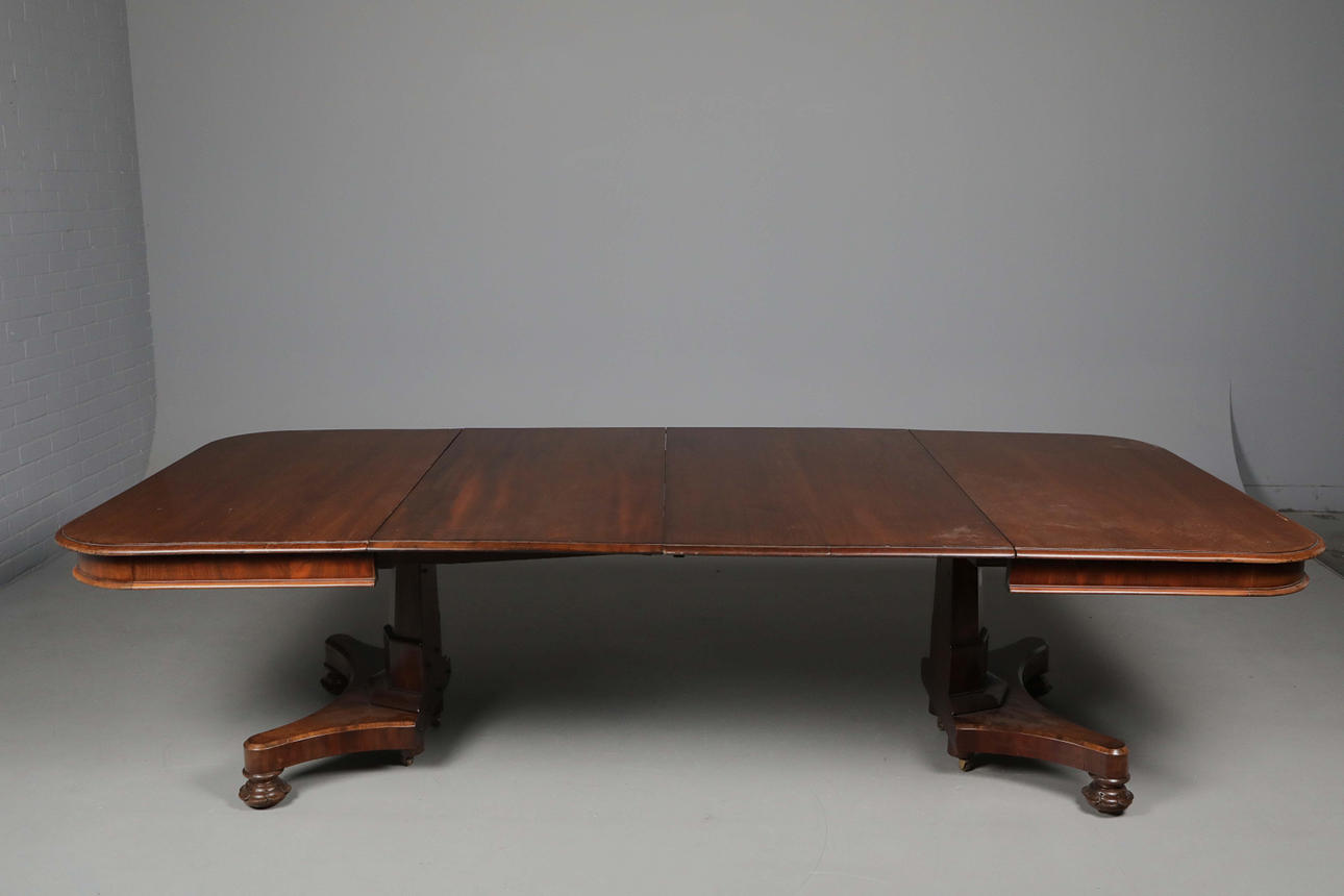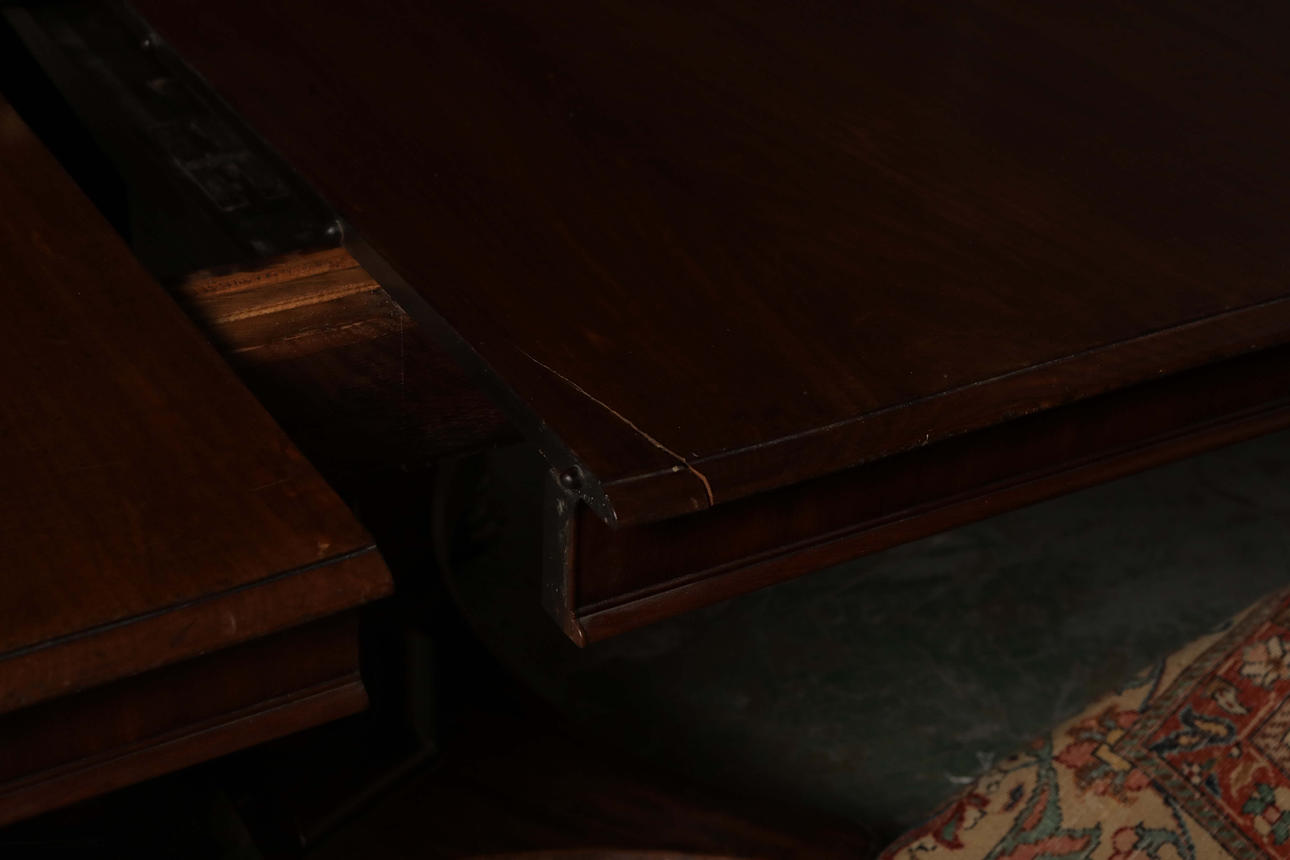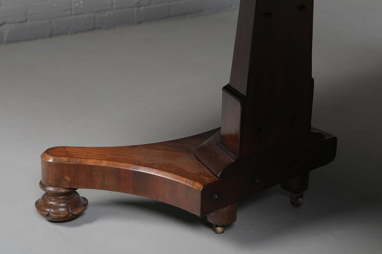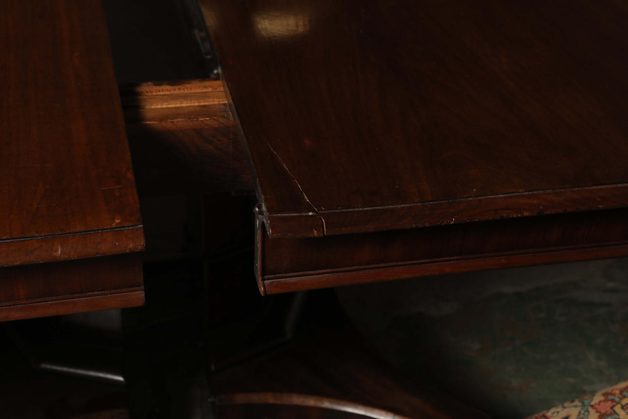 Second quarter 19th century mahogany, 75cm t x 143cm l x 126 cm d the facetted divided column opening to allow two extra leaves, one 71cm w the other 60 cm w, on a shaped base.