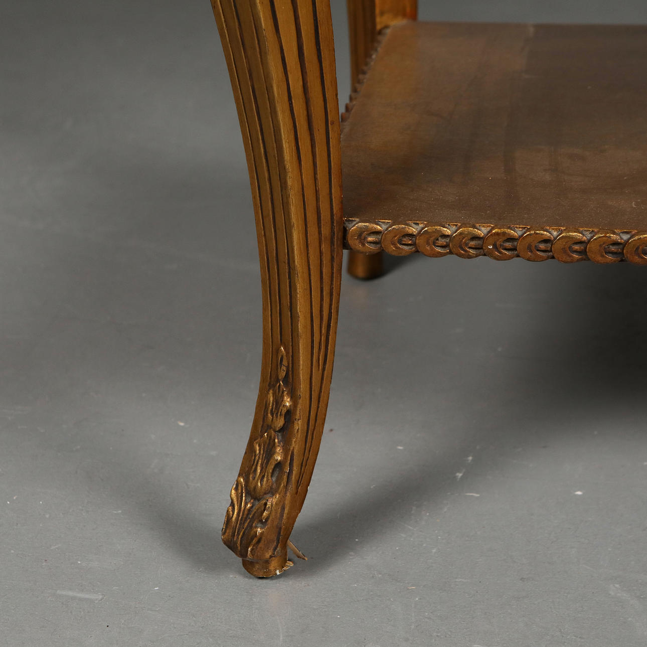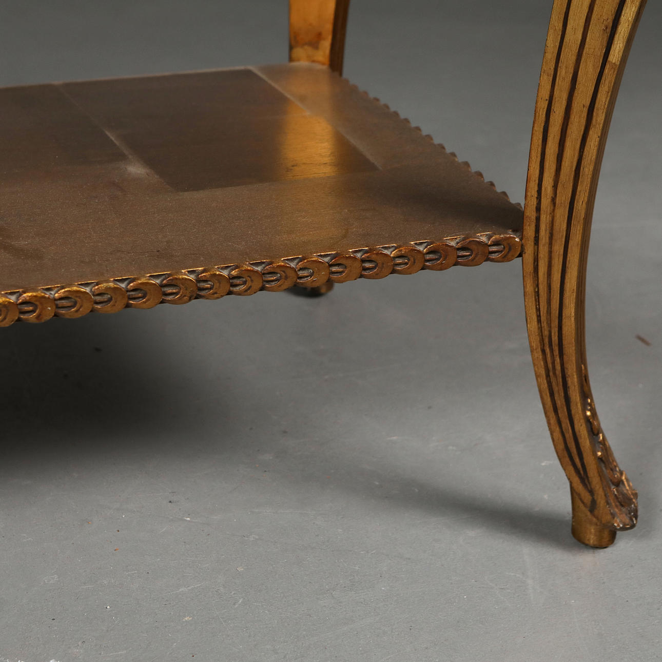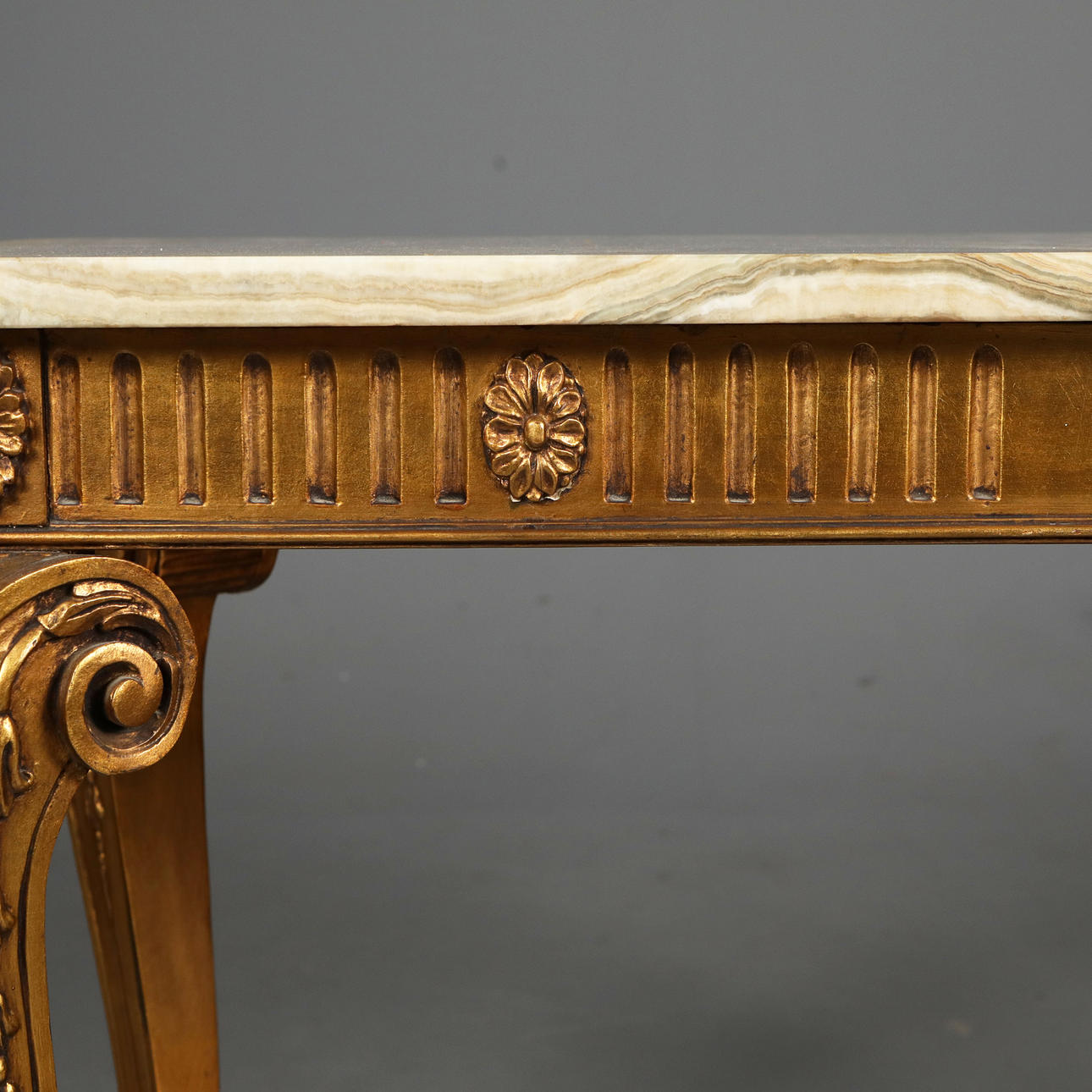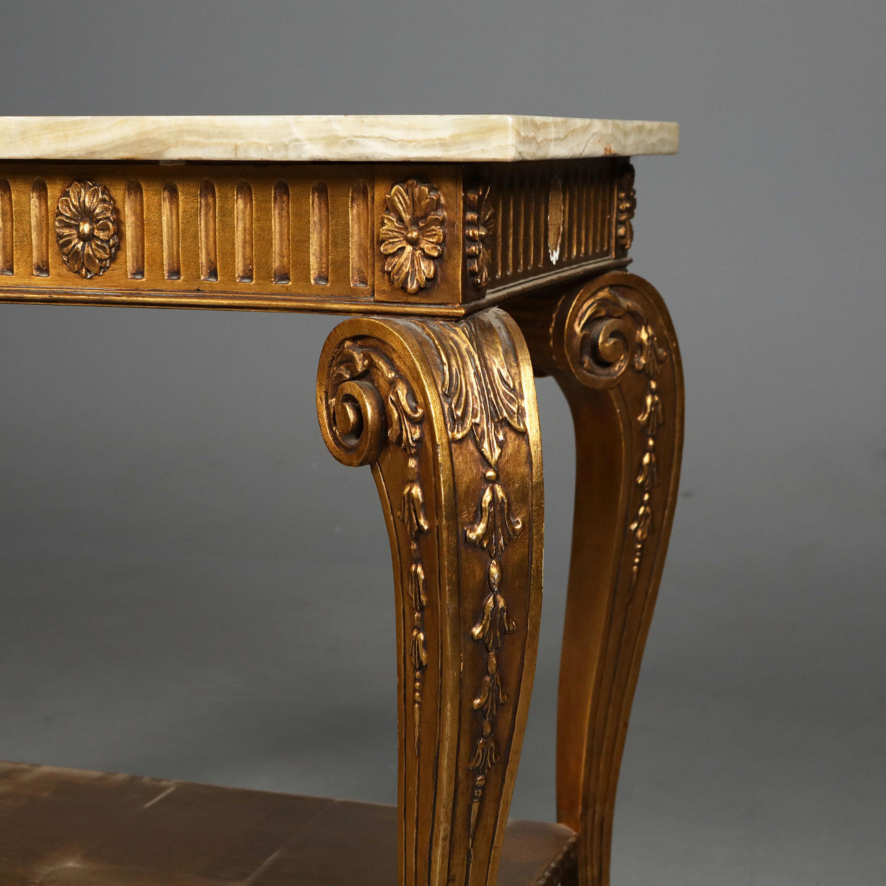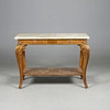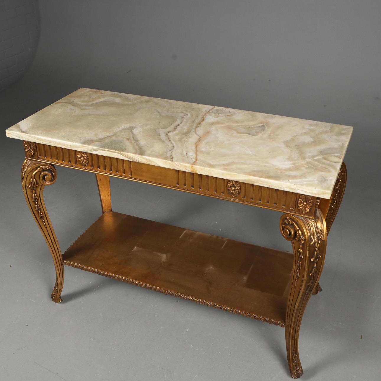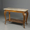 with a marble top on a gilt base with cabriole supports and an under tier 80cm t x 107cm w 55 cm d.