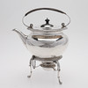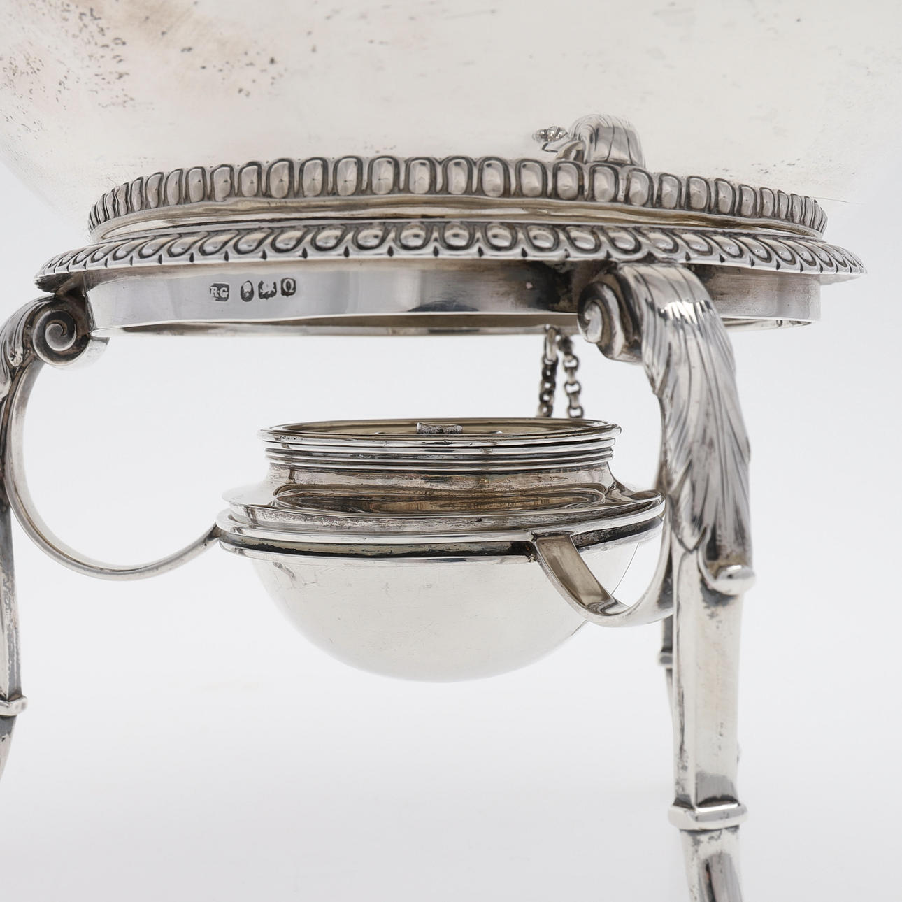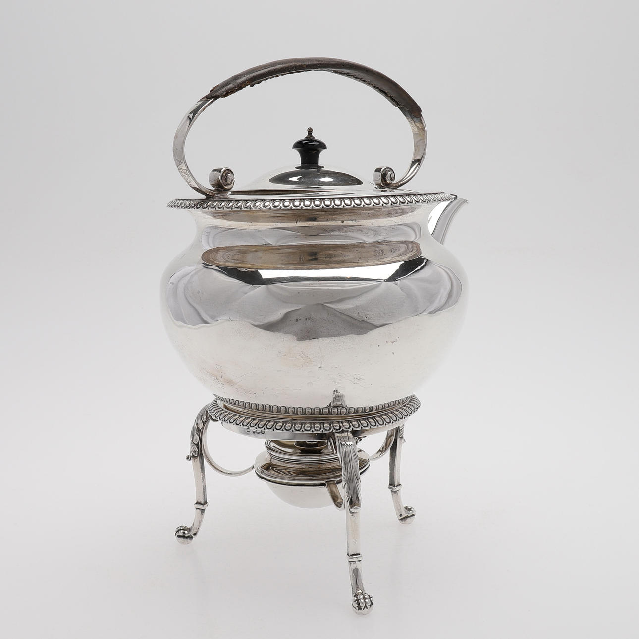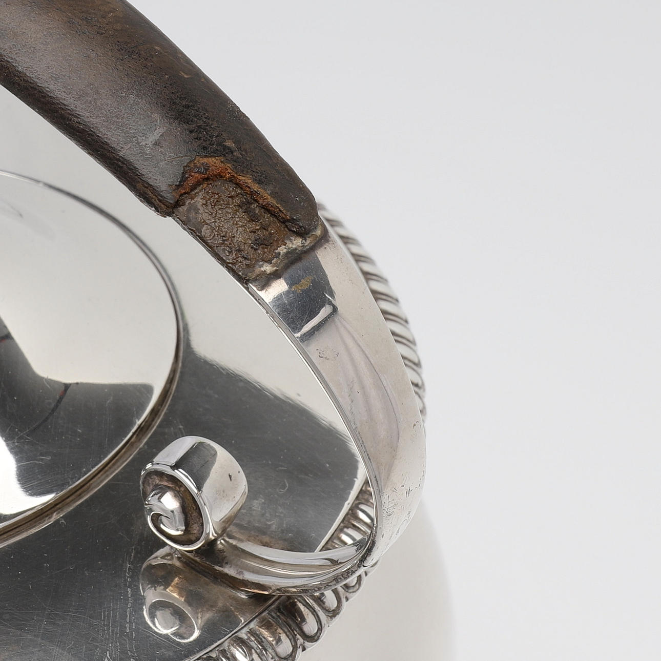 Silver with lid knob made of blackened wood. Hallmarked London 1811. Handle insulated with leather. Height 33 cm, weight 1634 grams.