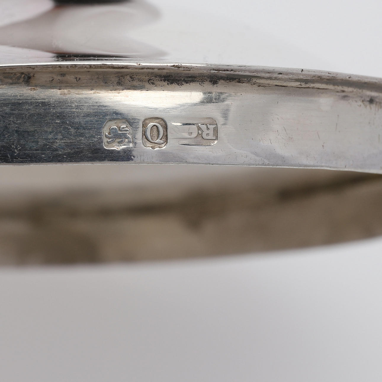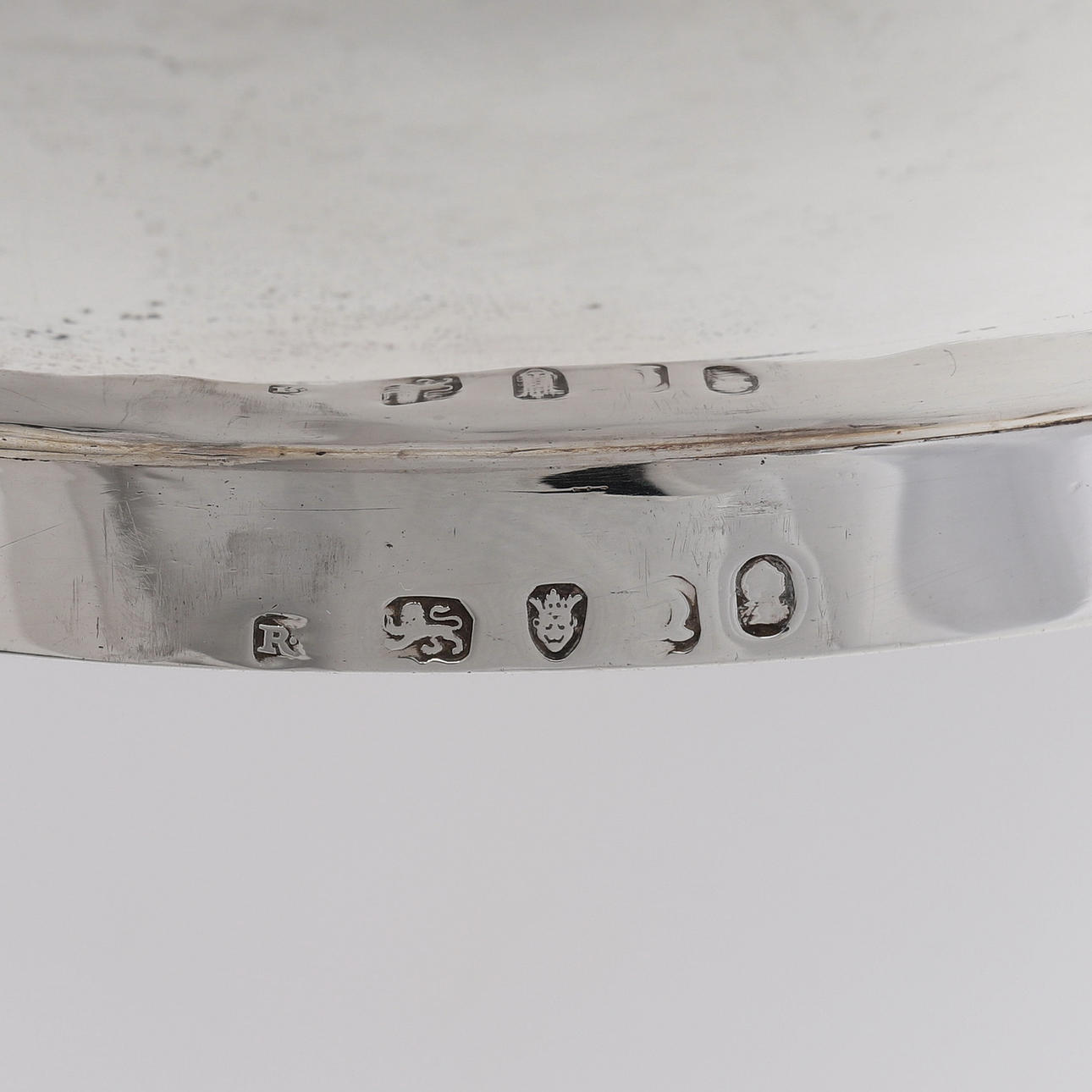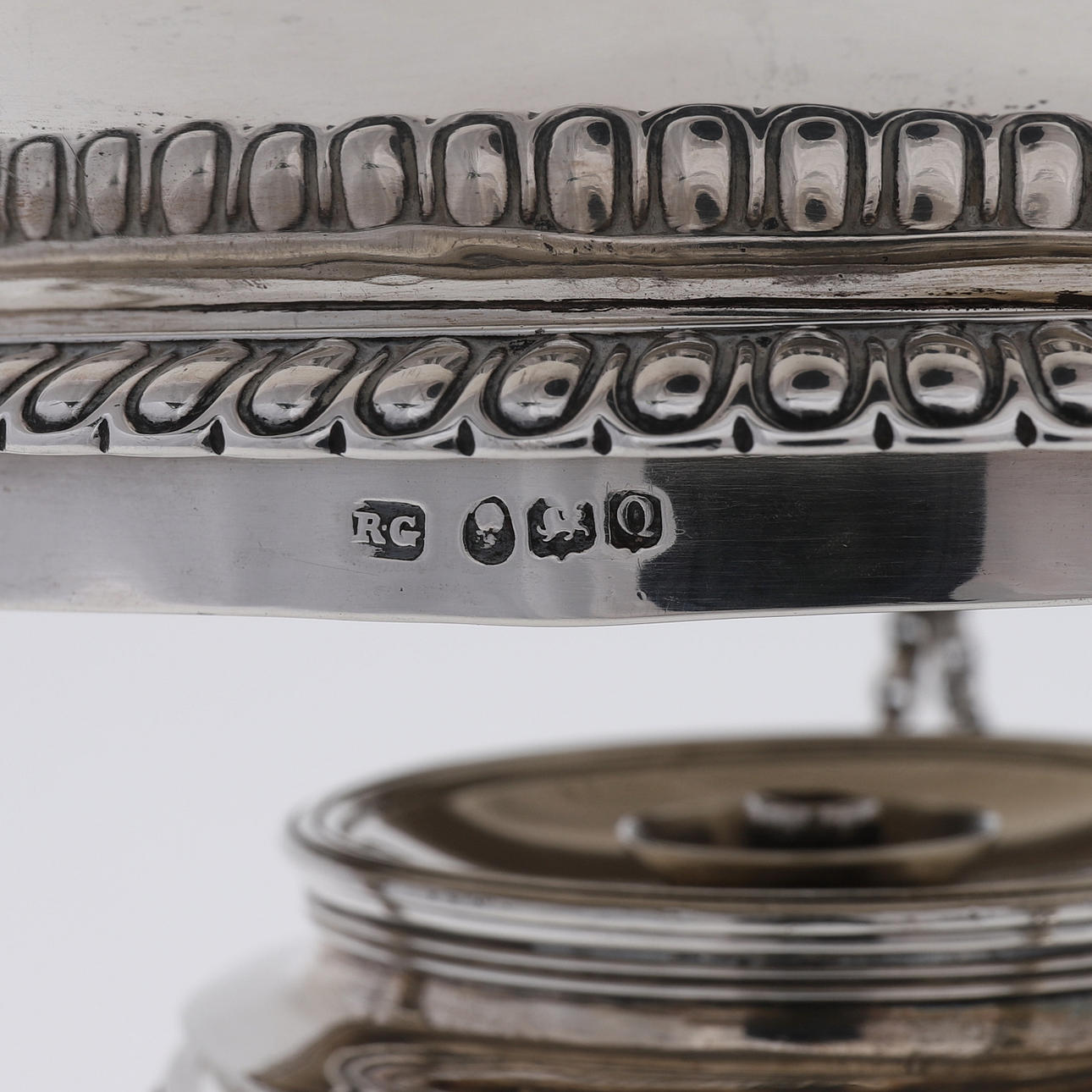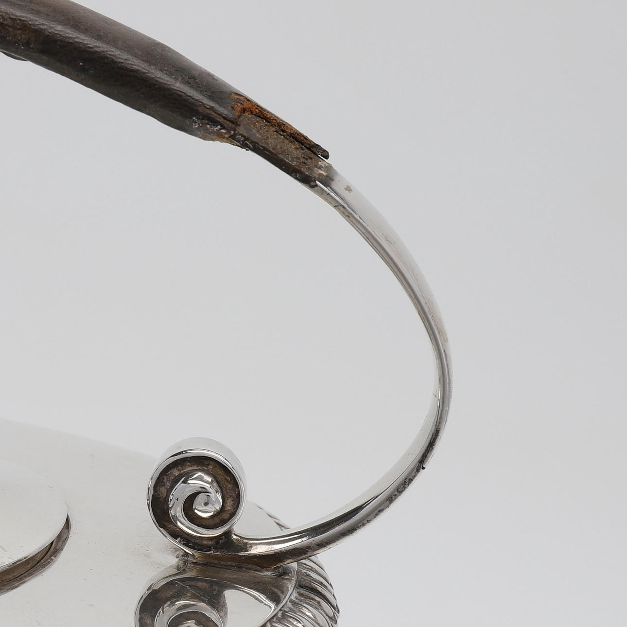 Silver with lid knob made of blackened wood. Hallmarked London 1811. Handle insulated with leather. Height 33 cm, weight 1634 grams.