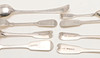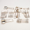 to include: a set of 12 Victorian provincial table forks and 7 matching dessert forks, by Josiah Williams & Co, Exeter 1852/53, 8 table spoons, 6 dessert spoons, 5 dessert forks, an egg spoon and a set of 6 Victorian dessert spoons, by Joseph & Albert Savory, London 1850, together with, 4 Old English table spoons, 7 teaspoons and 4 egg spoons, some pieces either crested or initialled; 95.5ozt (60).