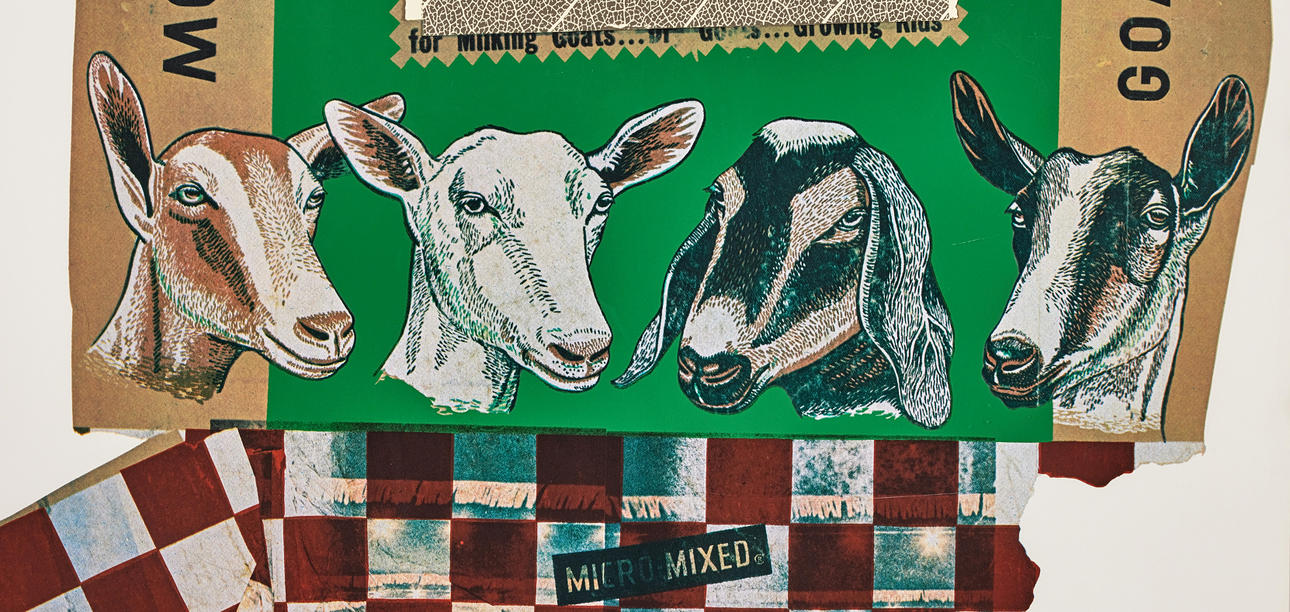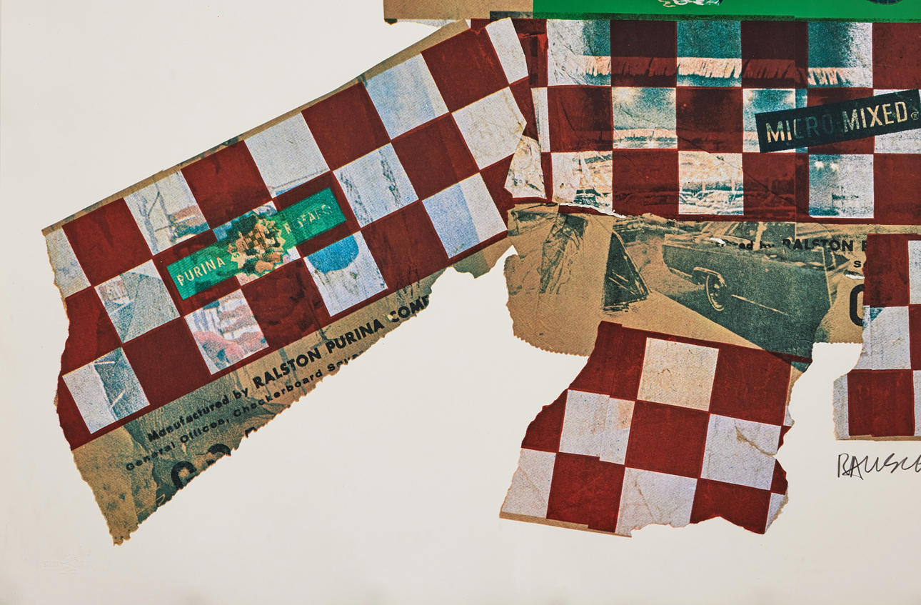 PROVENANCE Leif Holmer Gallery OTHER: Robert Rauschenberg's Chow Bags portfolio (1977) consists of six color serigraphs with collage and plastic wire, each featuring a different animal, such as a goat, calf, monkey and mink. The works are based on paper collages that Rauschenberg created from actual bags of pet food manufactured by Ralston Purina (now Purina Mills), a company best known for its Dog Chow and Cat Chow brands. The packaging for the less common feed types included in Mink Chow, Goat Chow, Monkey Chow, Hog Chow, Rabbit Chow and Calf Startena all feature the signature red and white check pattern found on Purina's more familiar products. By incorporating this pattern and other prominent design elements, Rauschenberg wanted to draw attention to the familiar yet strange nature of Purina's graphic identity.
