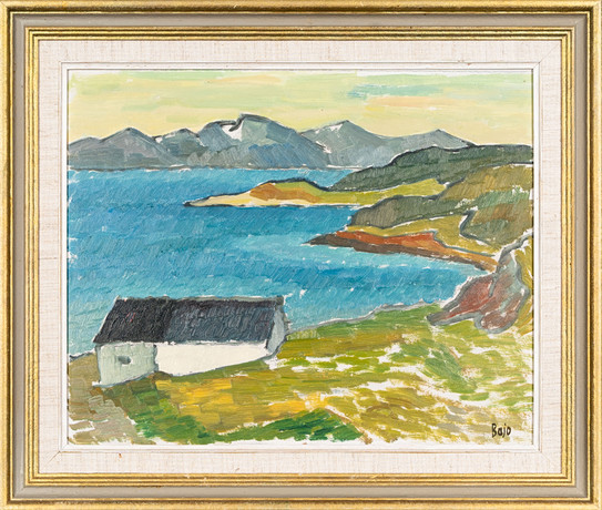 No. 1: Motif with house with open door. Oil on canvas lined on Board, 12.5 x 21.5 cm. Signed and dated AA 79.