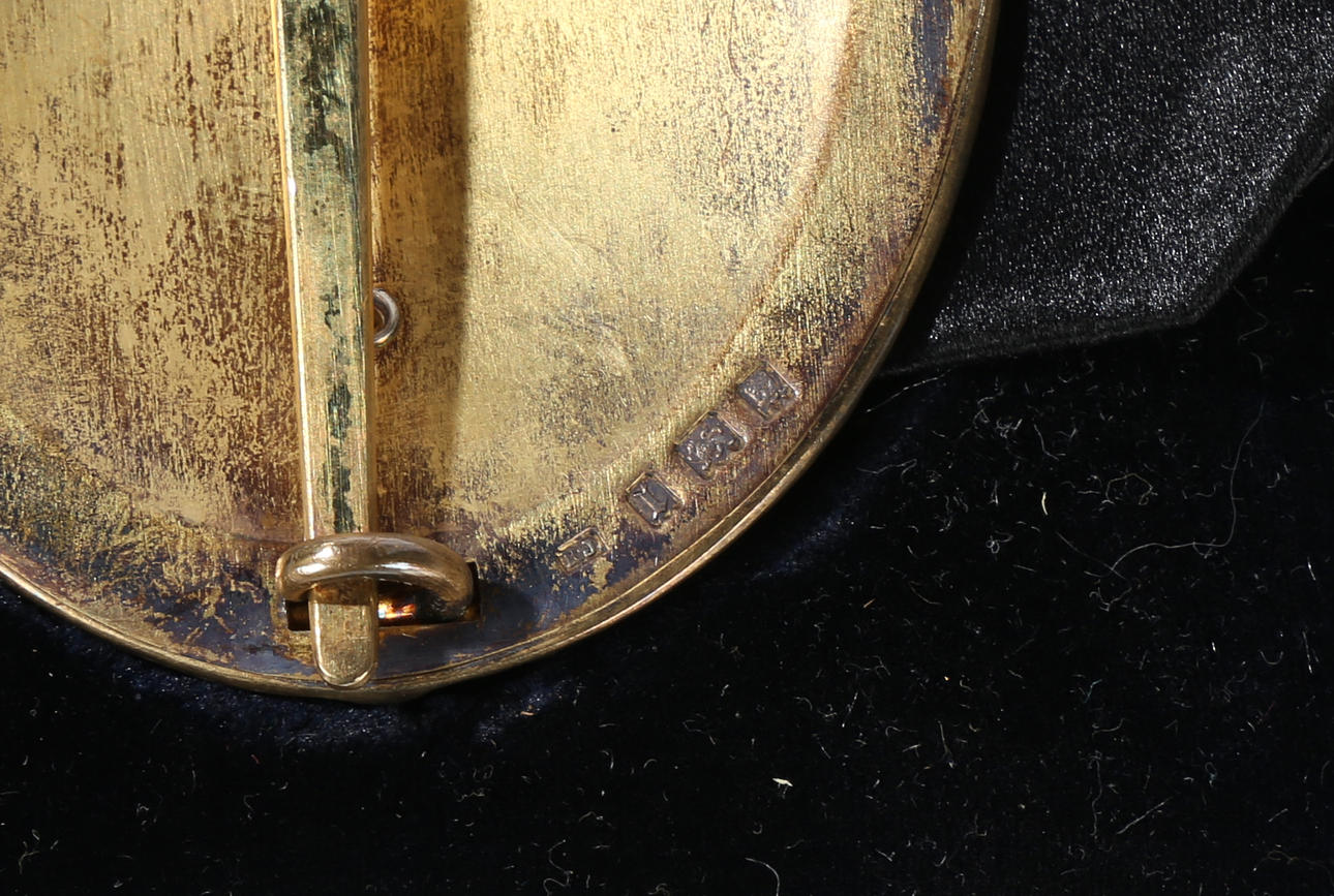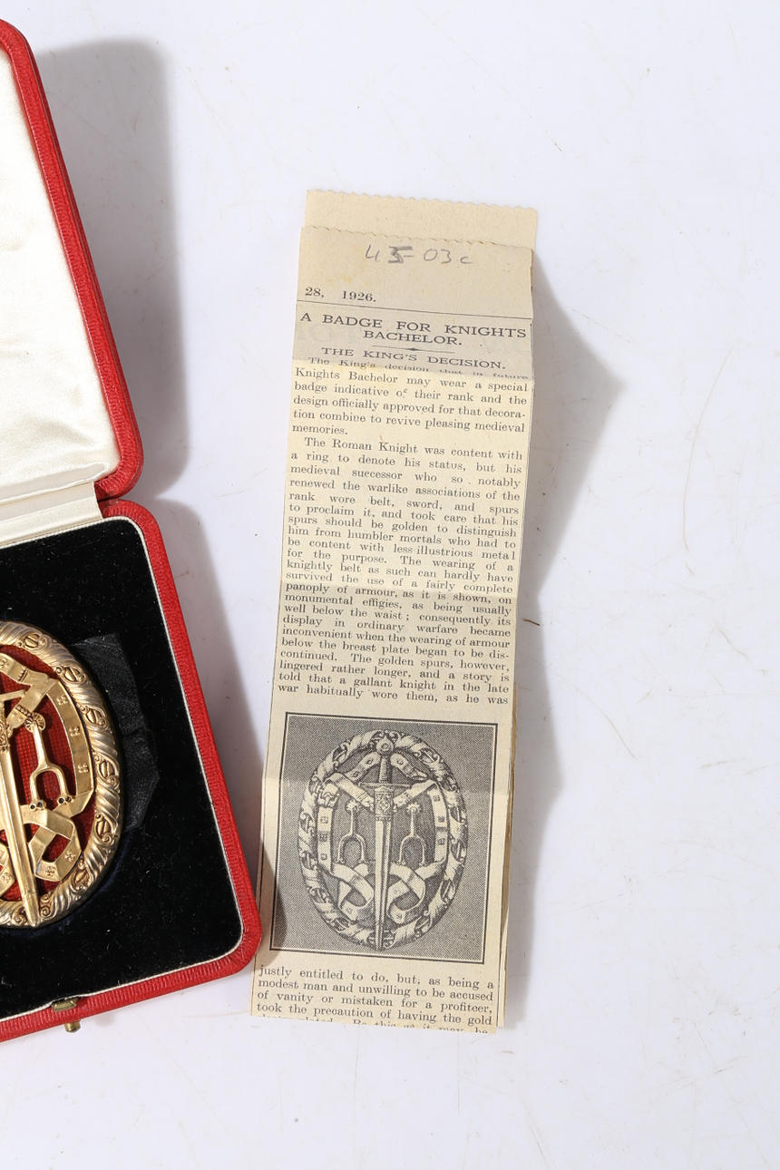 Knight Bachelor`s Badge, a silver gilt and red enamel badge, hallmarked London 1926, housed within a leather clad box.