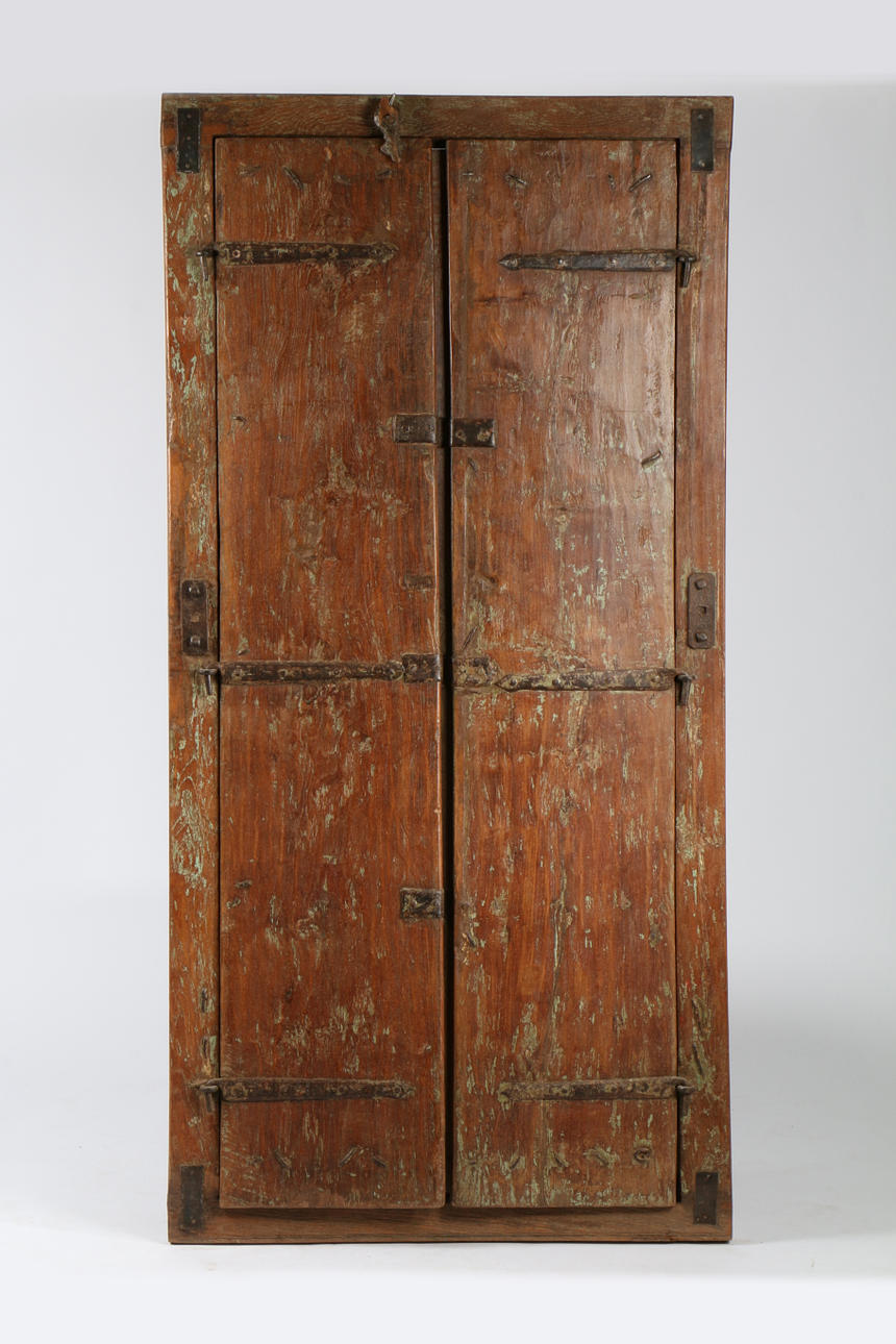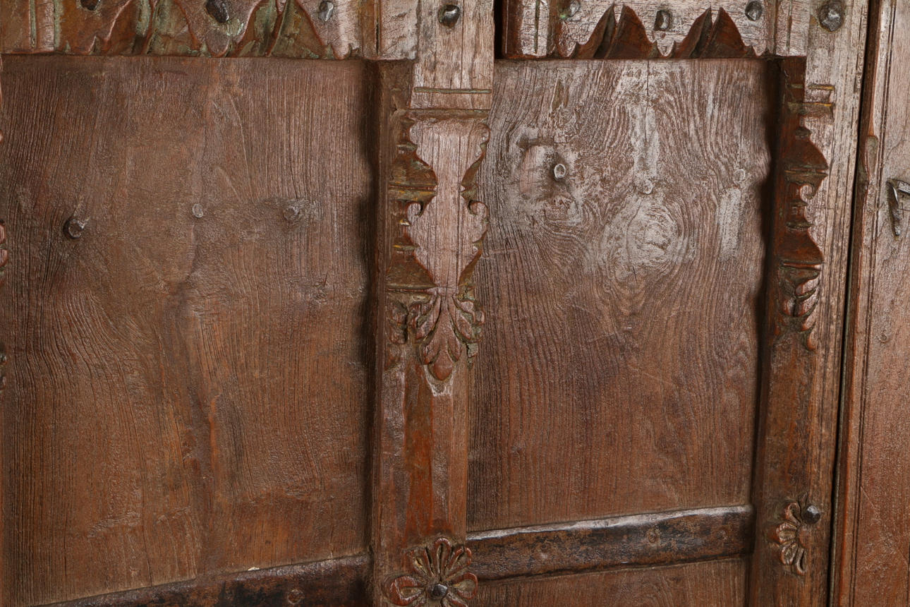 The two doors with metal banding and central foliate carved bar, the window frame with two metal spikes to the lower section, 82cm wide, 166cm high.