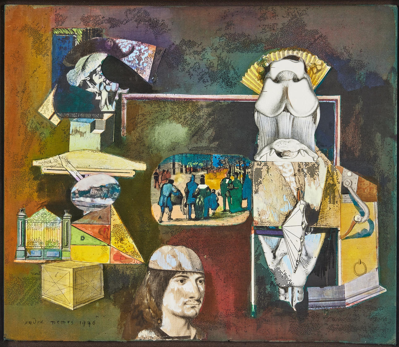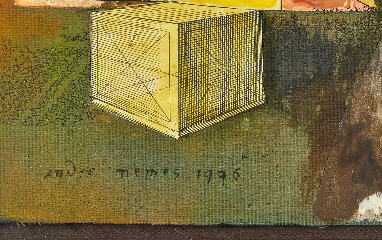 Collage and tempera, 27 x 32 cm. Signed Endre Nemes and dated 1976.