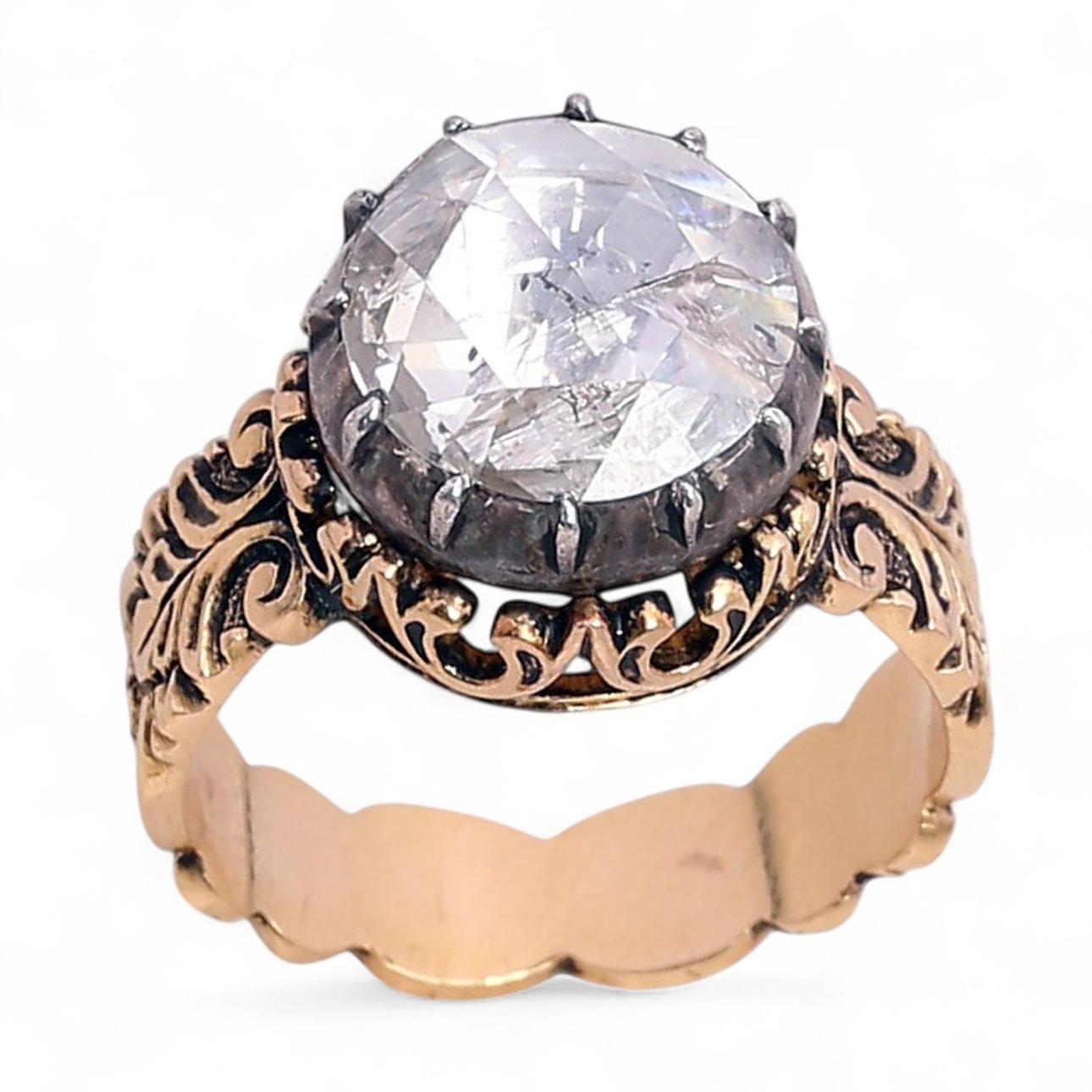 18K gold with silver views, and crowned rose cut diamond, approx. 0.95 cts., K - L colour approx. and P2 clarity approx. Size 16/56. 7.9 gr.