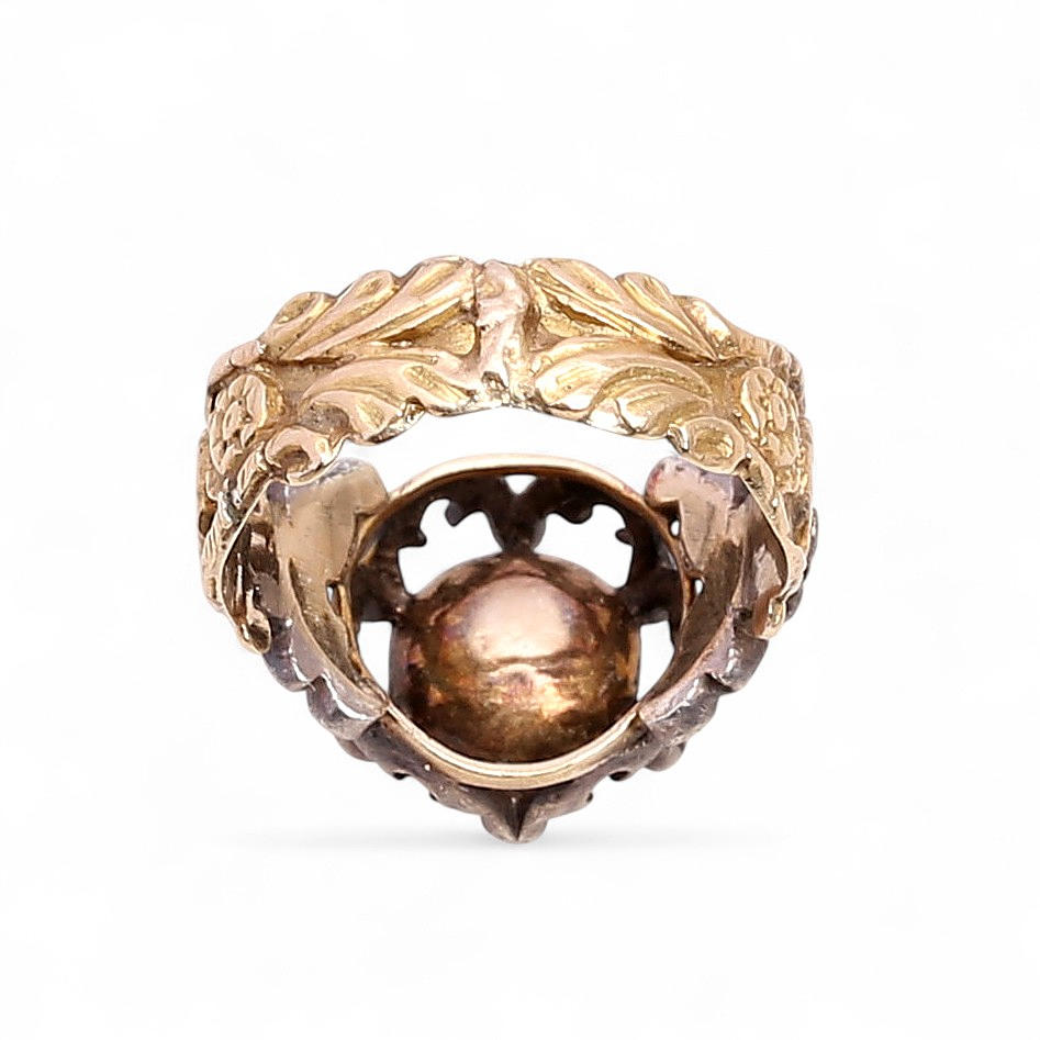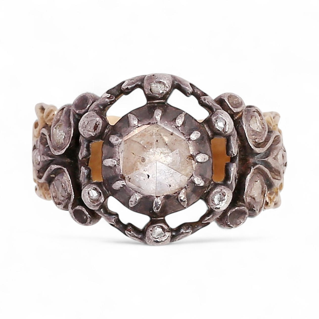 18K gold with silver views, crowned rose cut diamond, approx. 0.22 cts., and other rose cut diamonds, approx. 0.03 cts. Size 13/53. 5.3 gr.