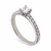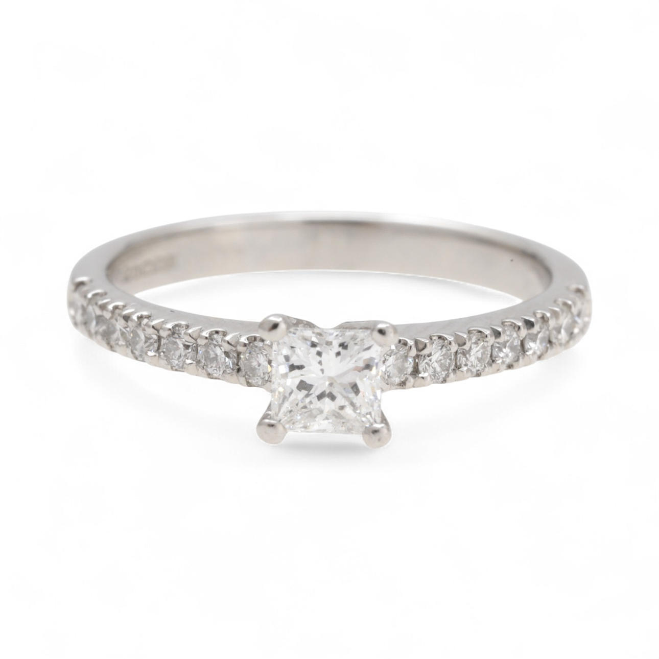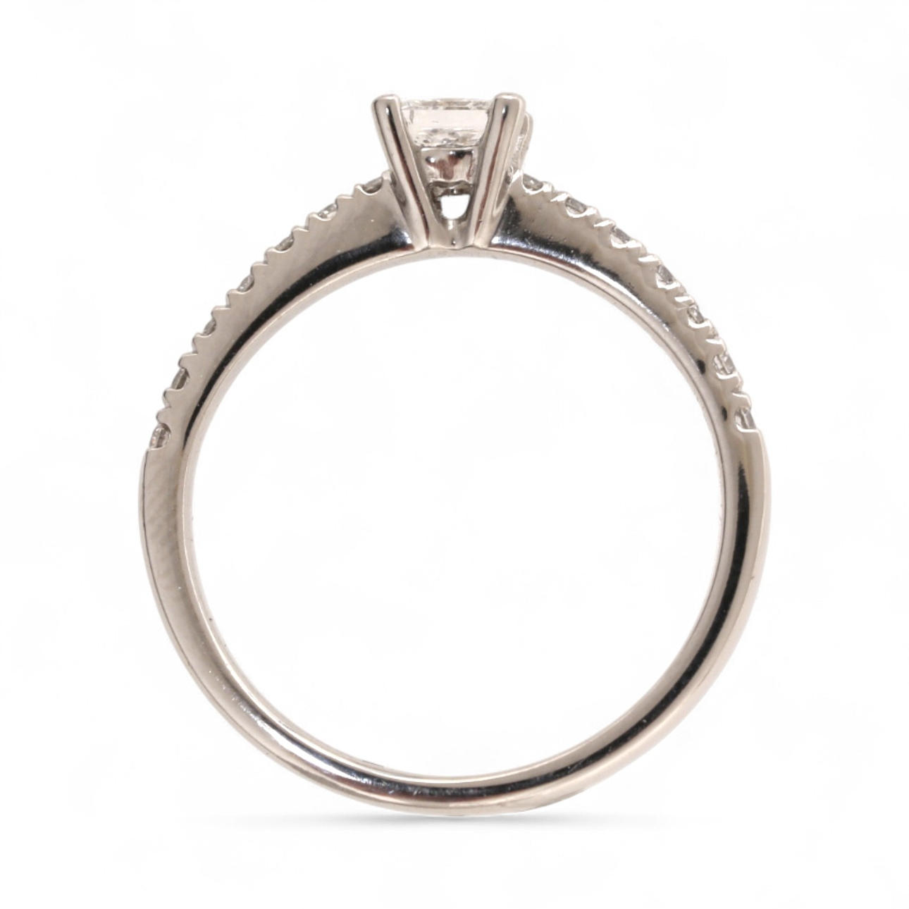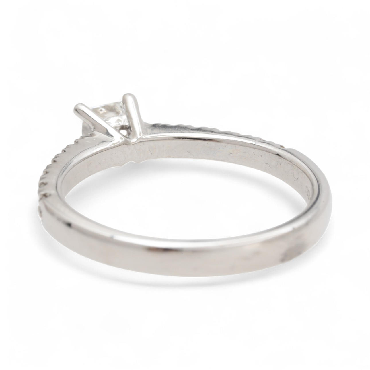Platinum and diamonds in princess and brilliant sizes, approx. 0.52 cts. The princess-cut diamond is accompanied by a certificate from the Gemological Institute of America (GIA) No. 1192674355 attesting that it is a 0.31 cts diamond, color D and SI1 purity. Size 11/51. 3.6 gr.