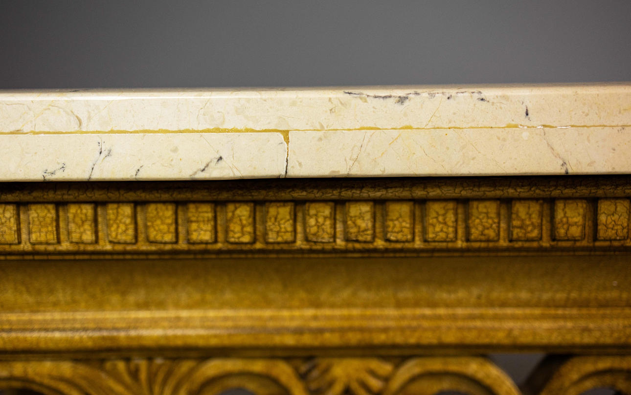 shaped wooden base with faux aged finish, stone top, 174cm x 49.5cm x 85.5cm approx.