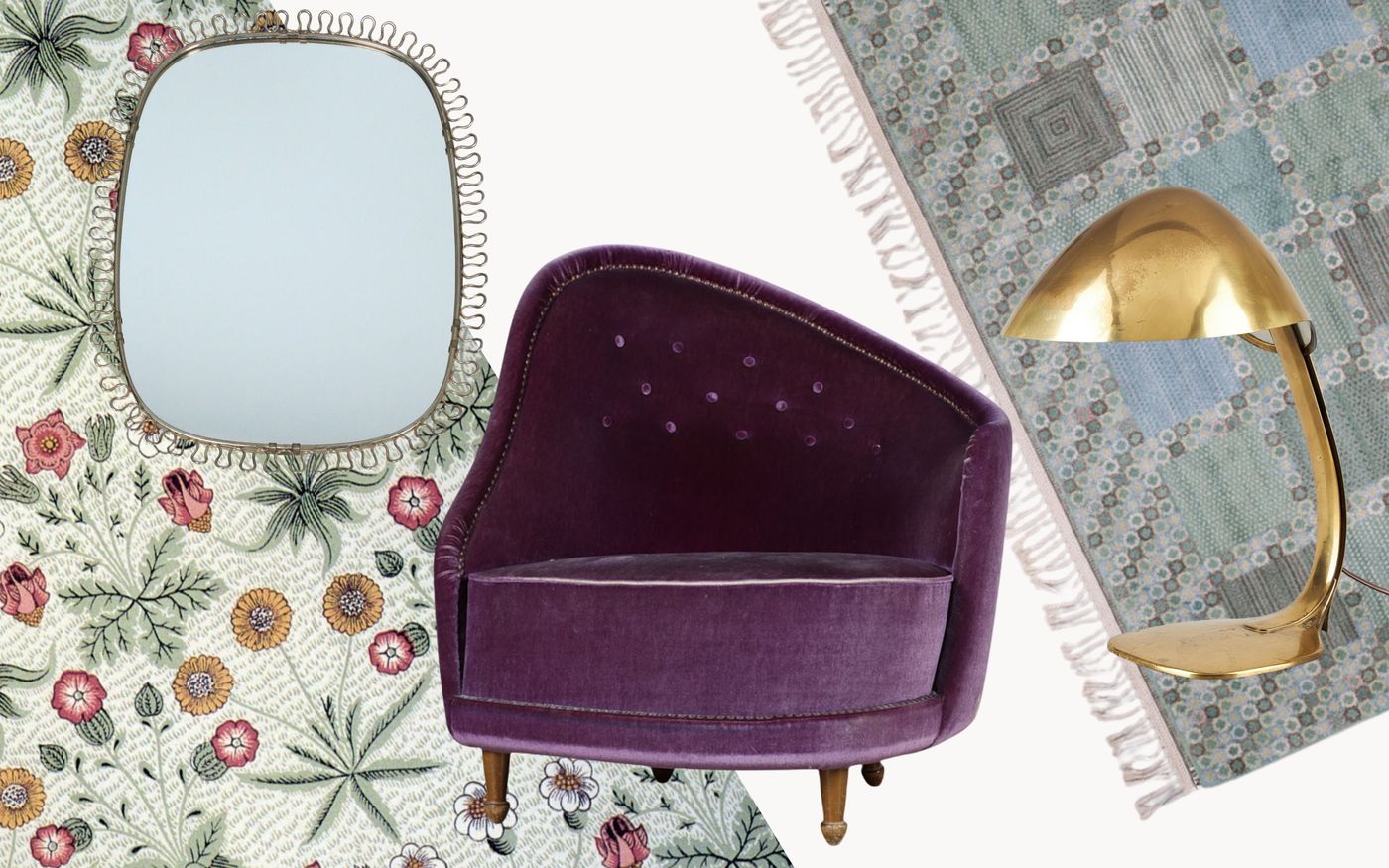We would pair "Daisy" wallpaper with A Paavo Tynell brass lamp, and a pop of colour like this purple delight by Carl Cederholm