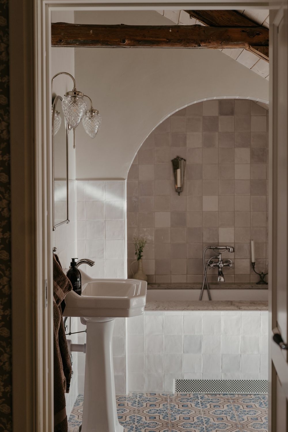The bathroom is tiled in a mix of soft whites and greys.