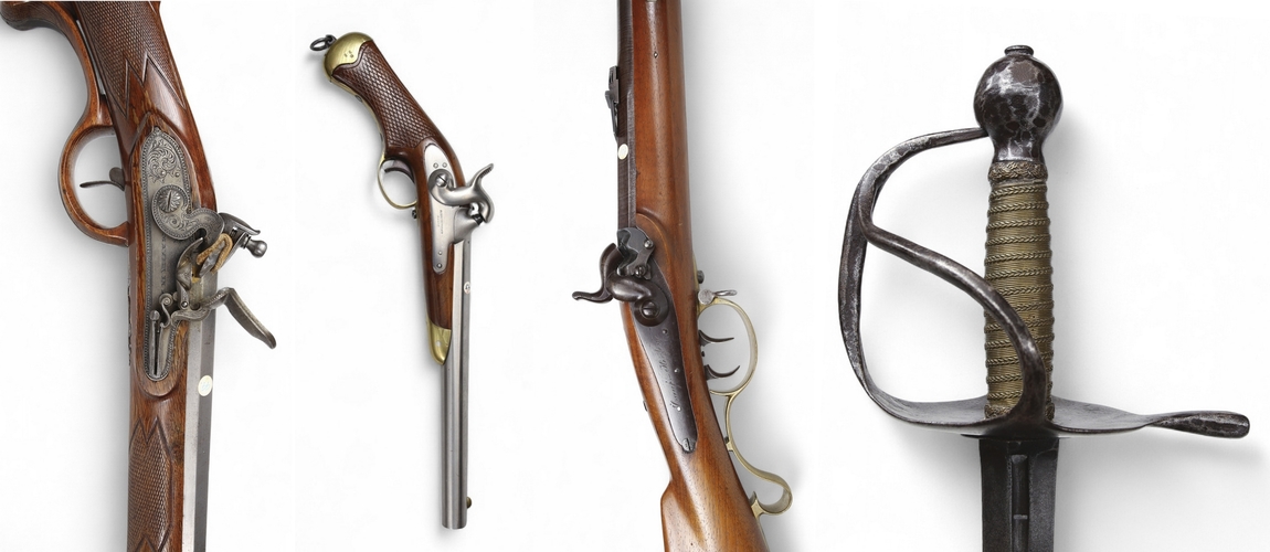 Among the highlights is a Carolean soldier’s sword model 1685, presented alongside a highly varied selection of edged weapons. The auction also features percussion and flintlock pistols, revolvers, and rifles. Of the latter, an Austrian flintlock rifle from the 18th century stands out in particular.