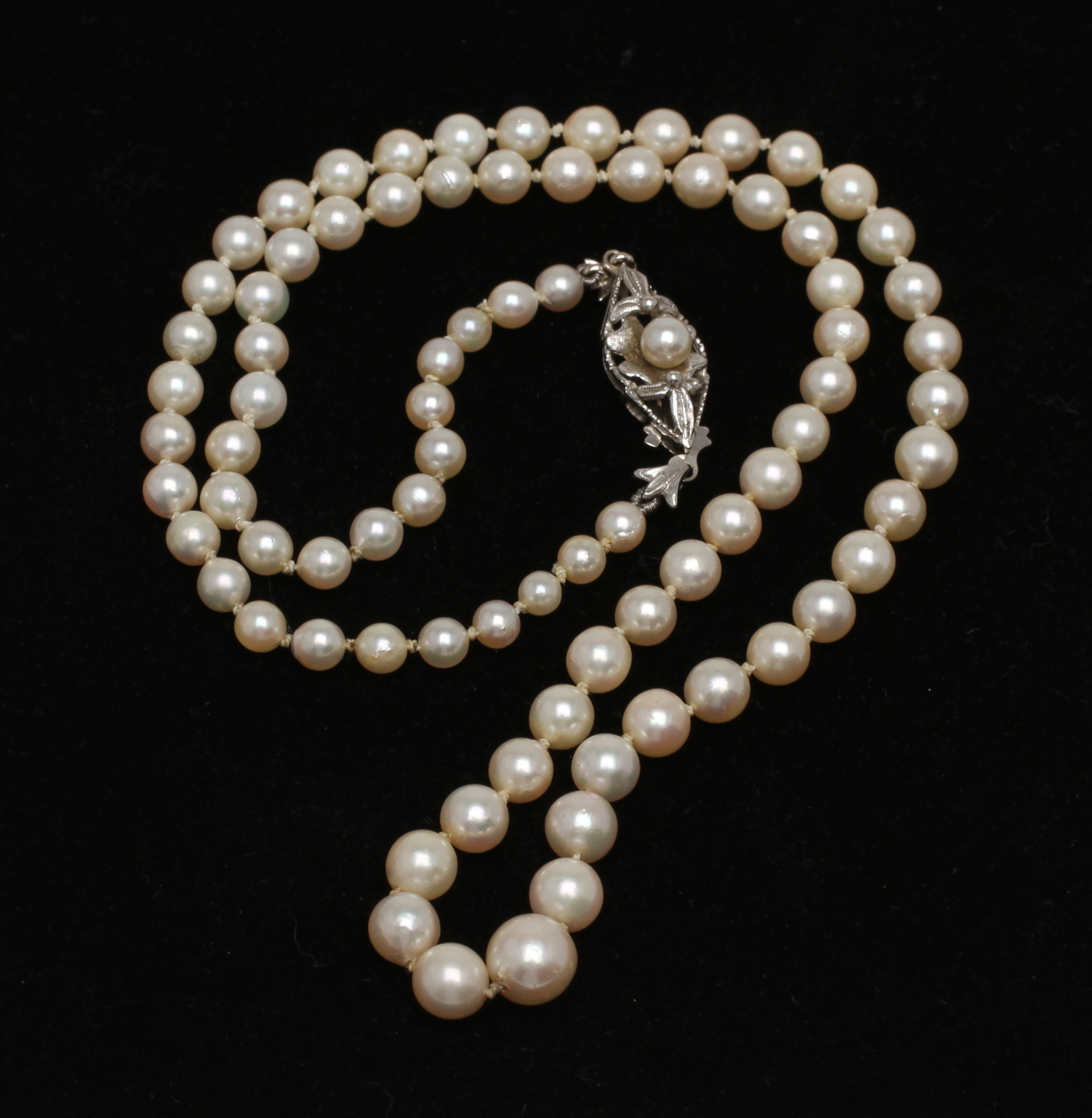 10041. COLLAR, perlas dosificadas, cierre en oro blanco 18k.
