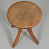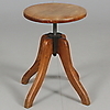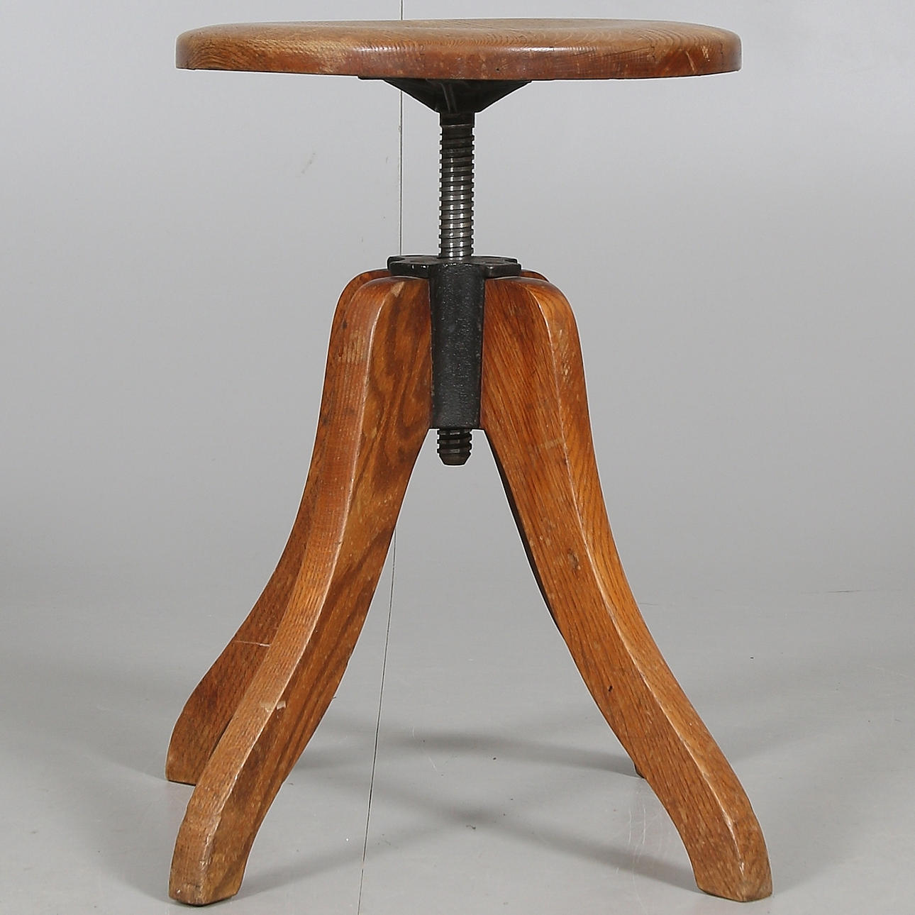 Patas y asiento en roble. Tornillo de ajuste y soporte de pata en metal. Diámetro del asiento aprox. 38, altura del asiento en el momento de la foto 55 cm.