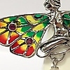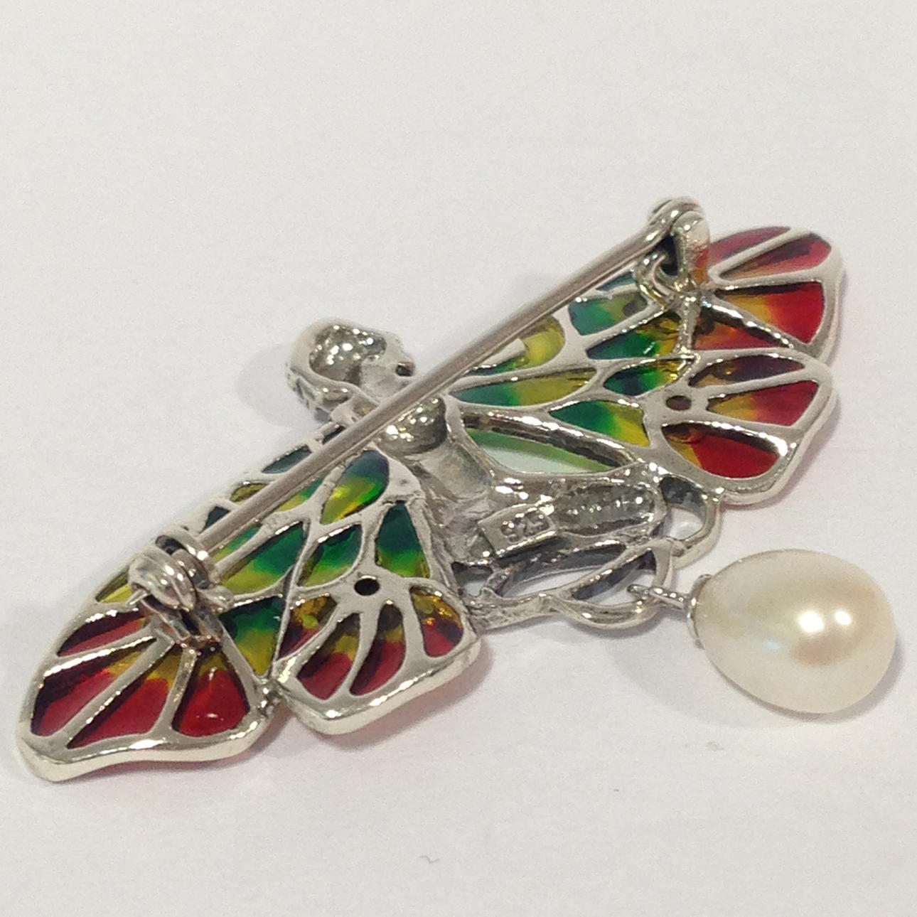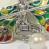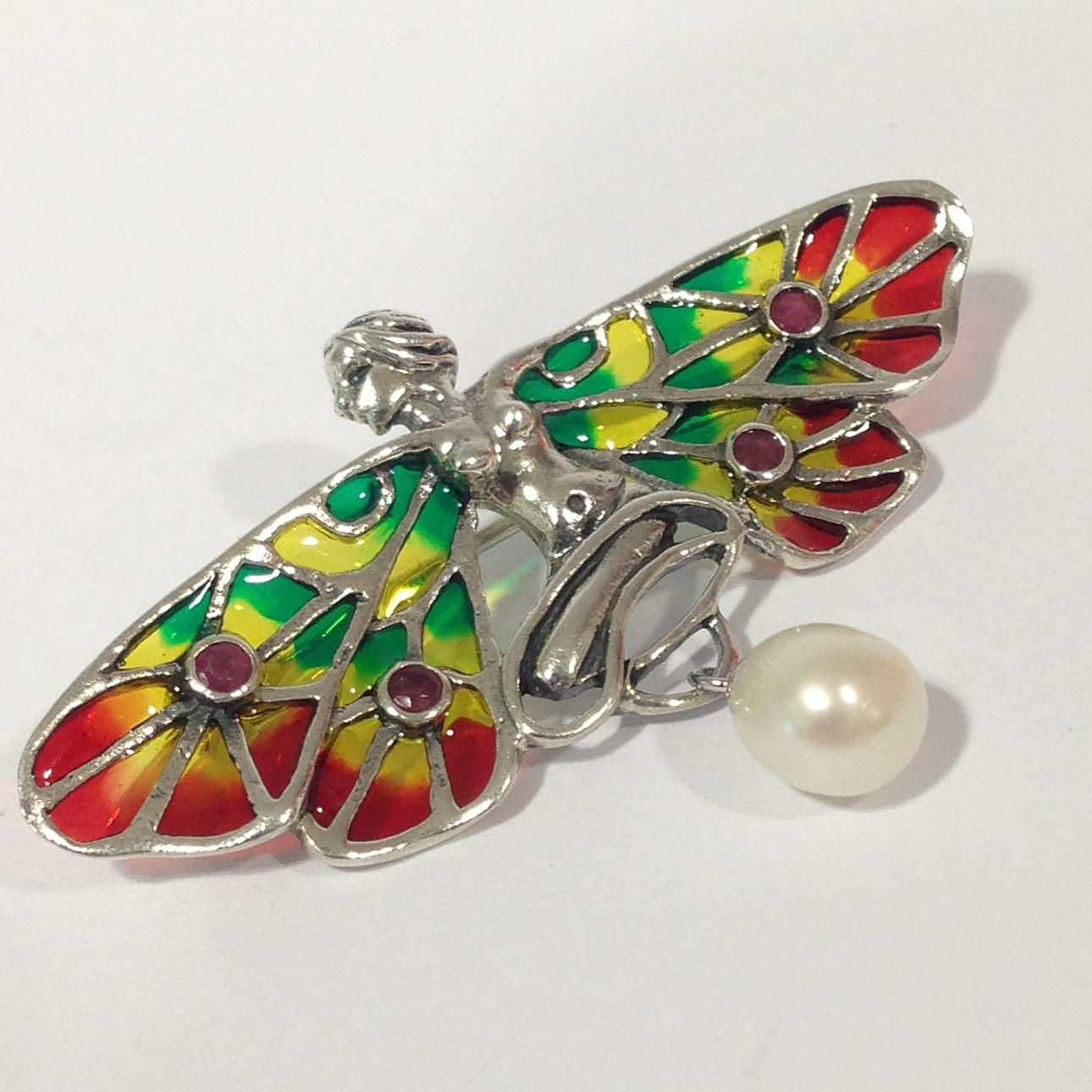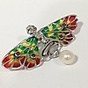 Las alas de este broche tienen incrustaciones de esmalte multicolor. 4 rubíes pequeños de corte redondo están incrustados en las alas.