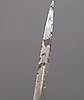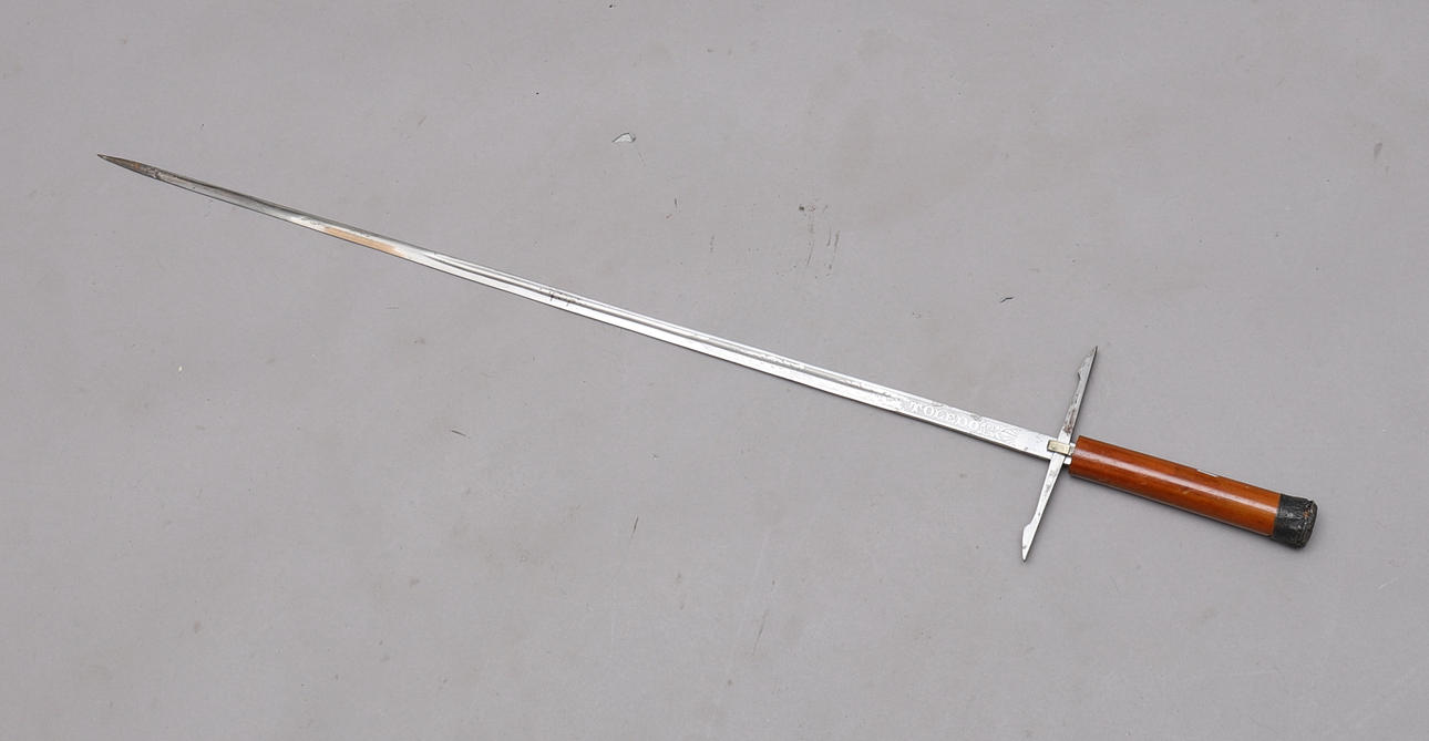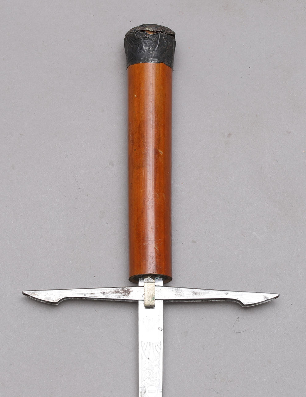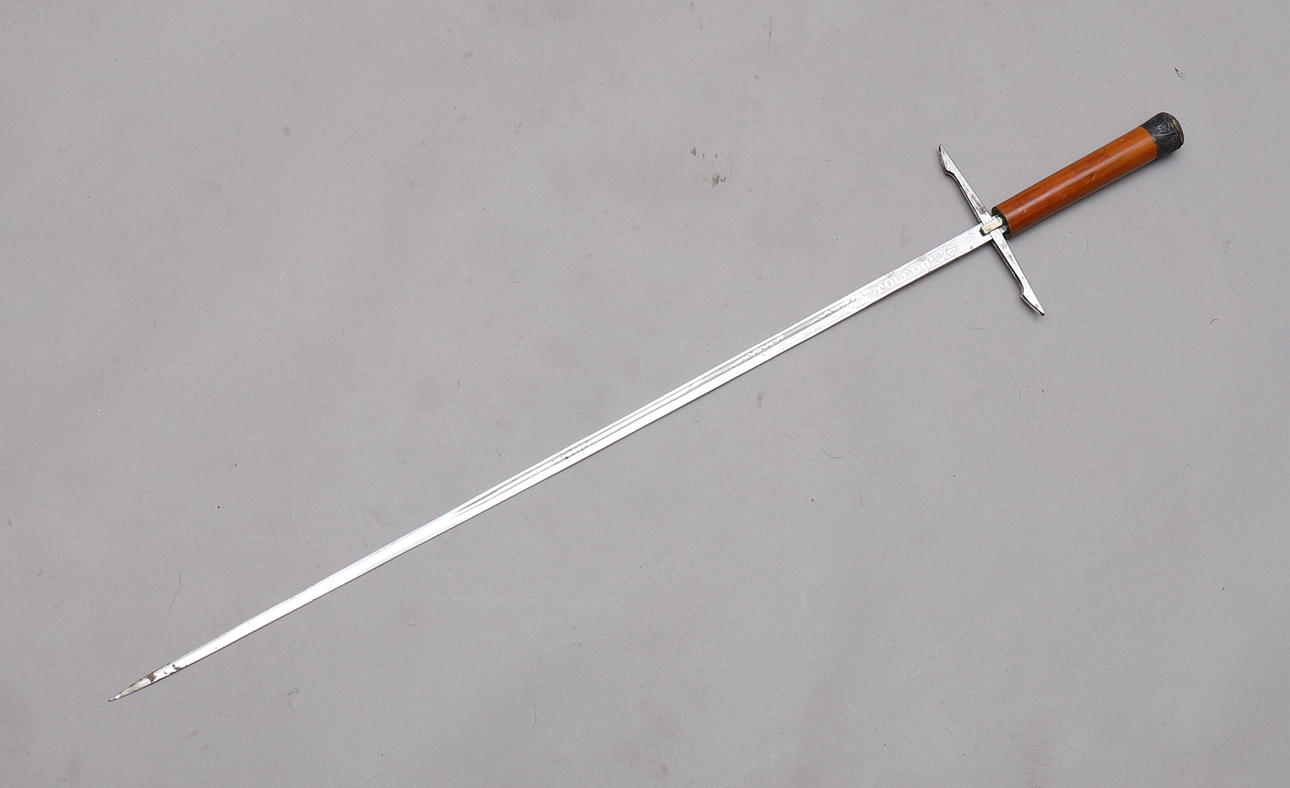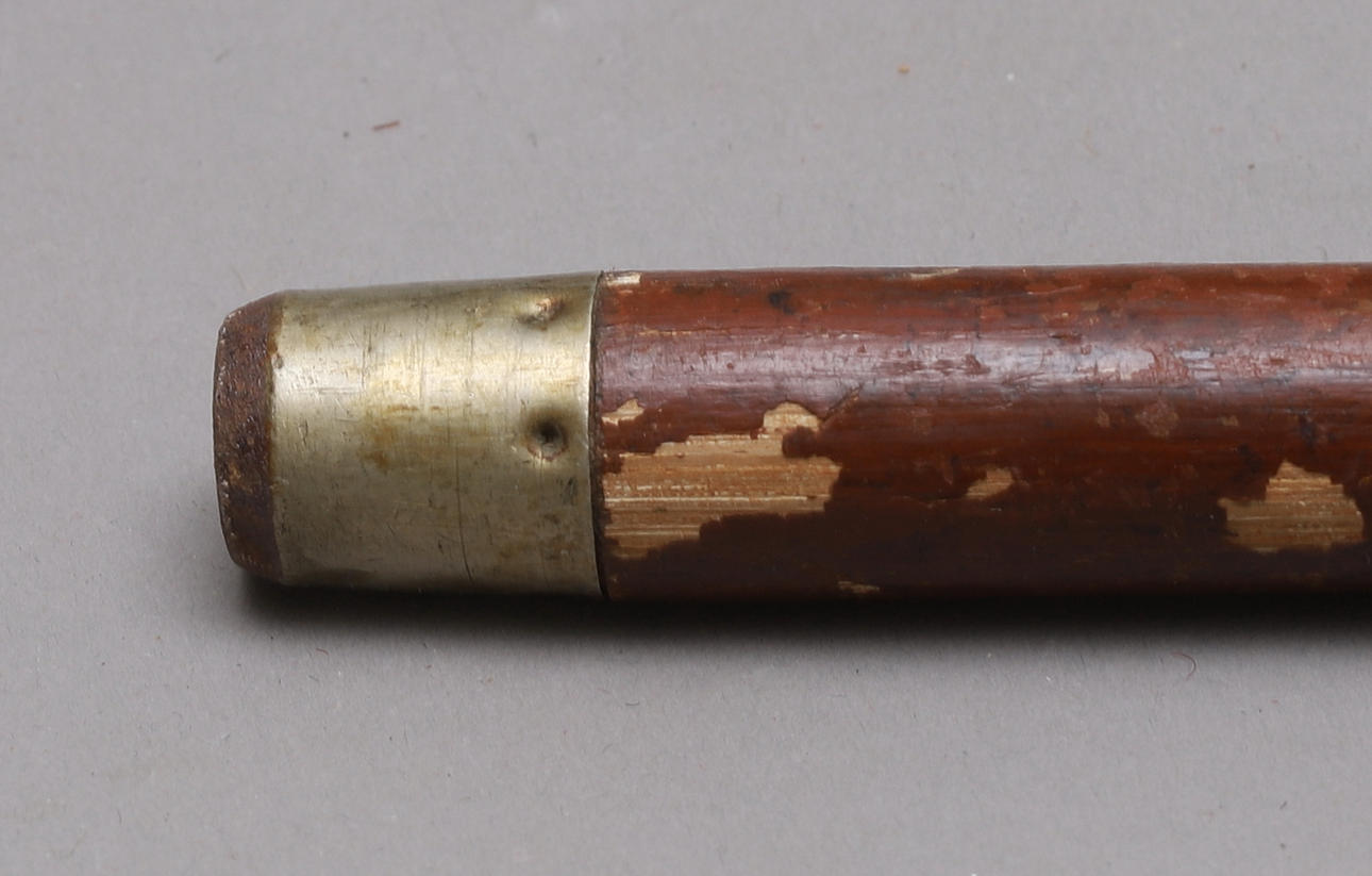 La perilla en el extremo del bastón no está, está pegada y suelta. Daños en la chapa de la vaina del palo.