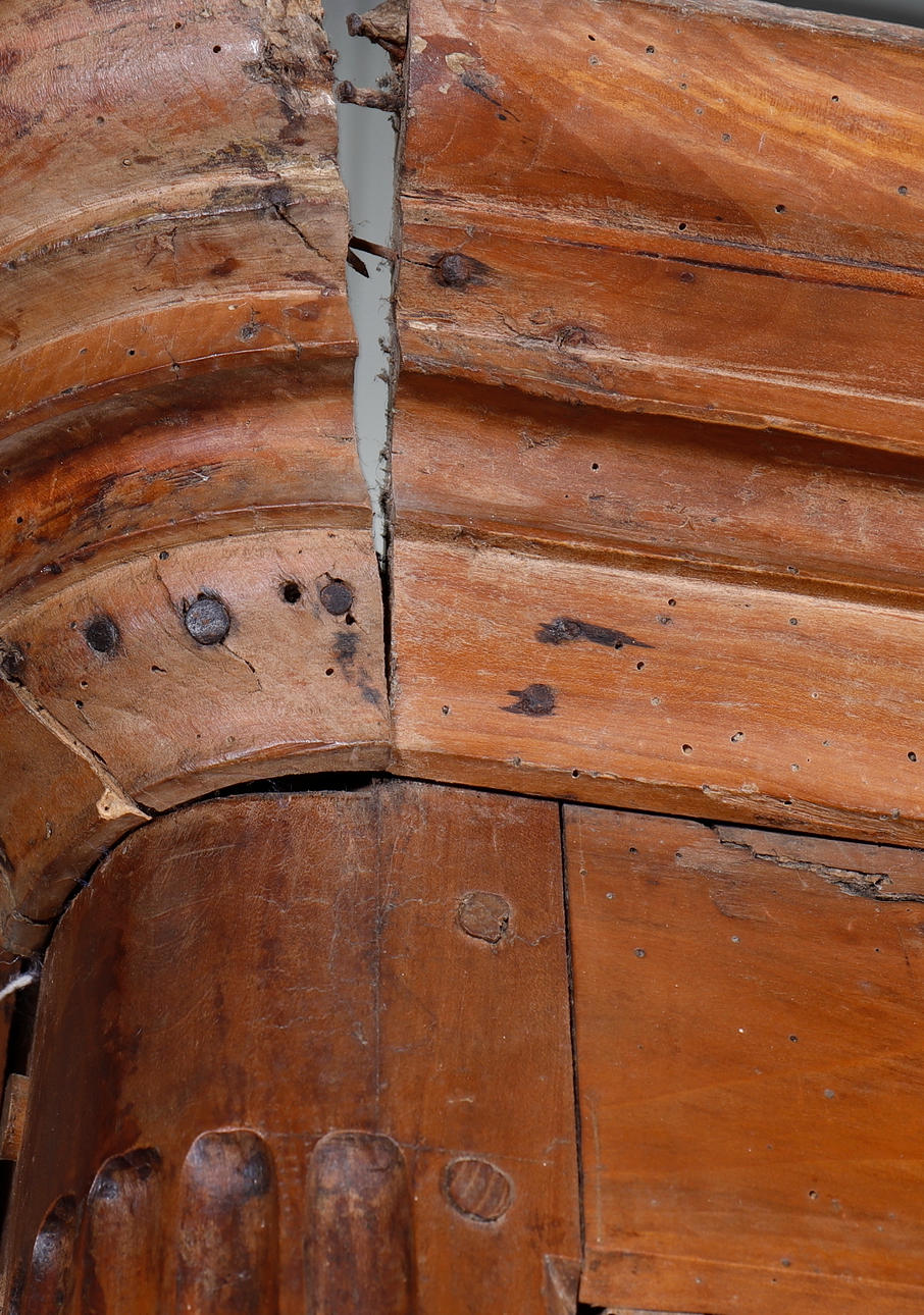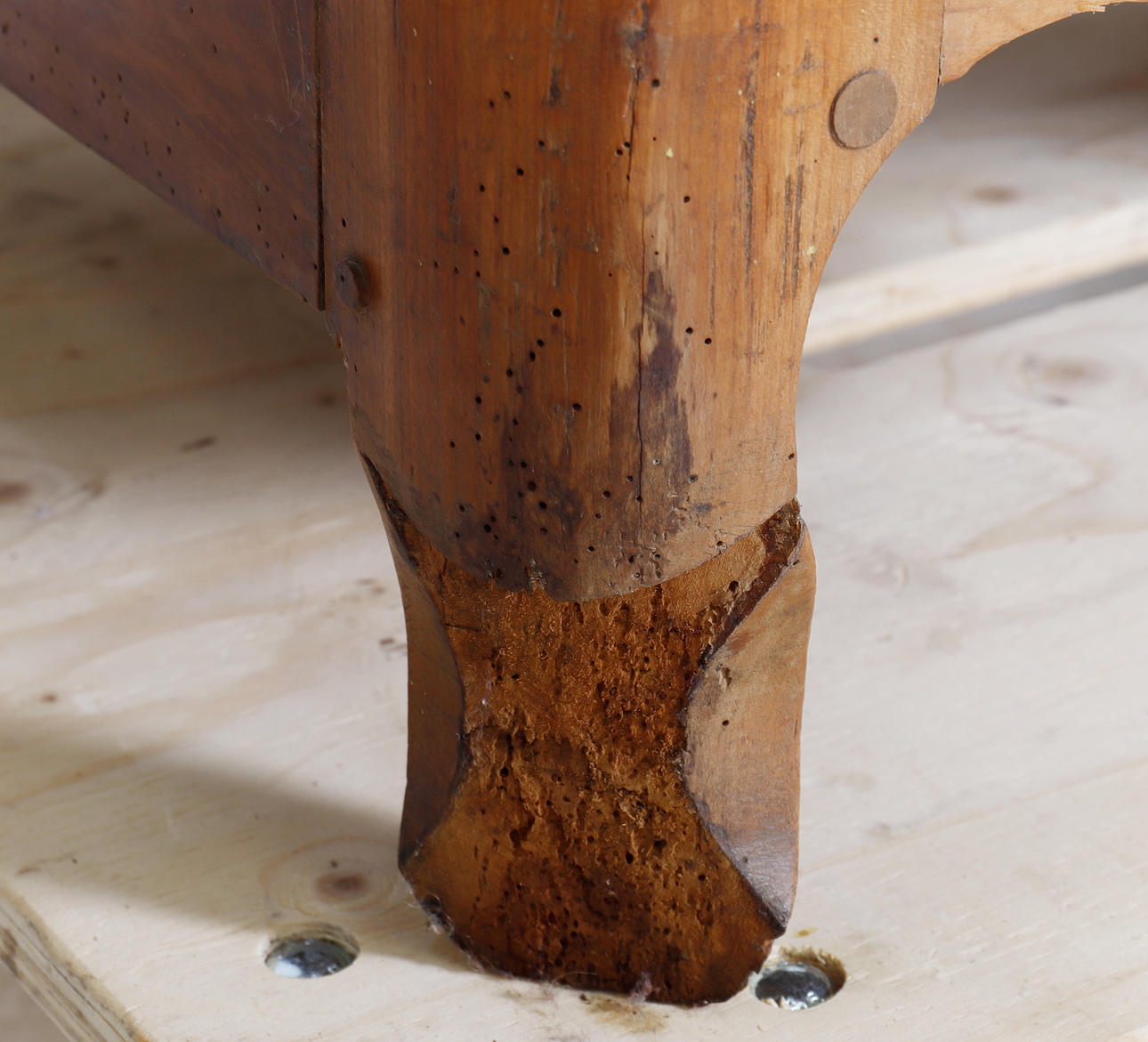 Marcas, golpes, rasguños y abrasiones, gusanos viejos en todas partes que causan algunas pérdidas, astillas viejas, grietas y grietas, algunas juntas se abren, pérdida significativa en un pie, espacios entre paneles.