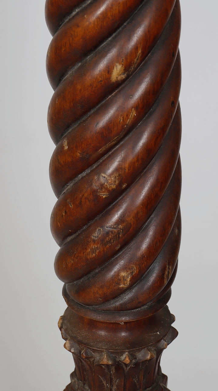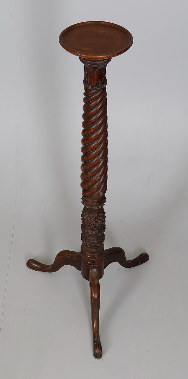 hacia 1820, con remate circular, columna salomónica ahusada, clavo, molduras encintadas y nudosas, sobre tres patas cabriolé, 124 cm de alto, diámetro del remate 21,5 cm.