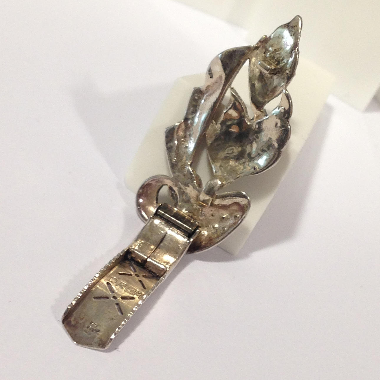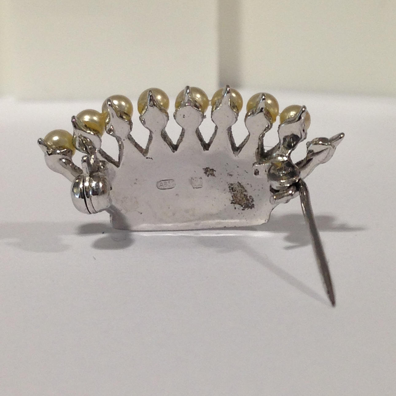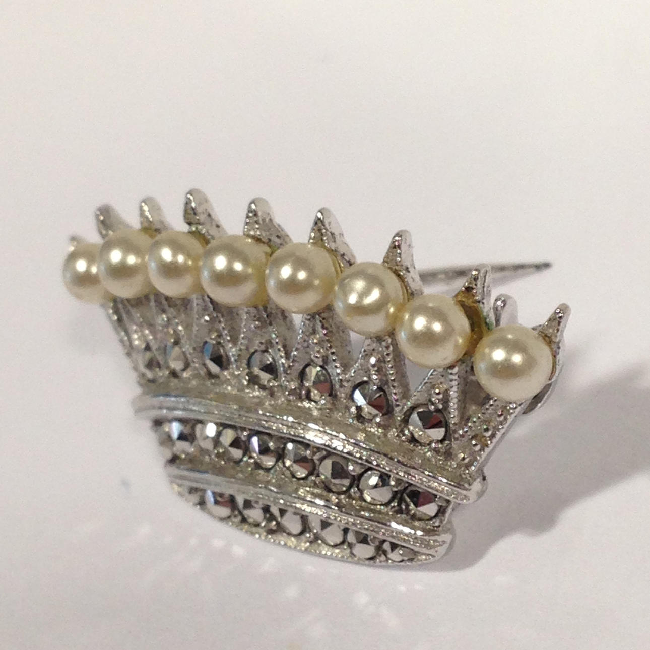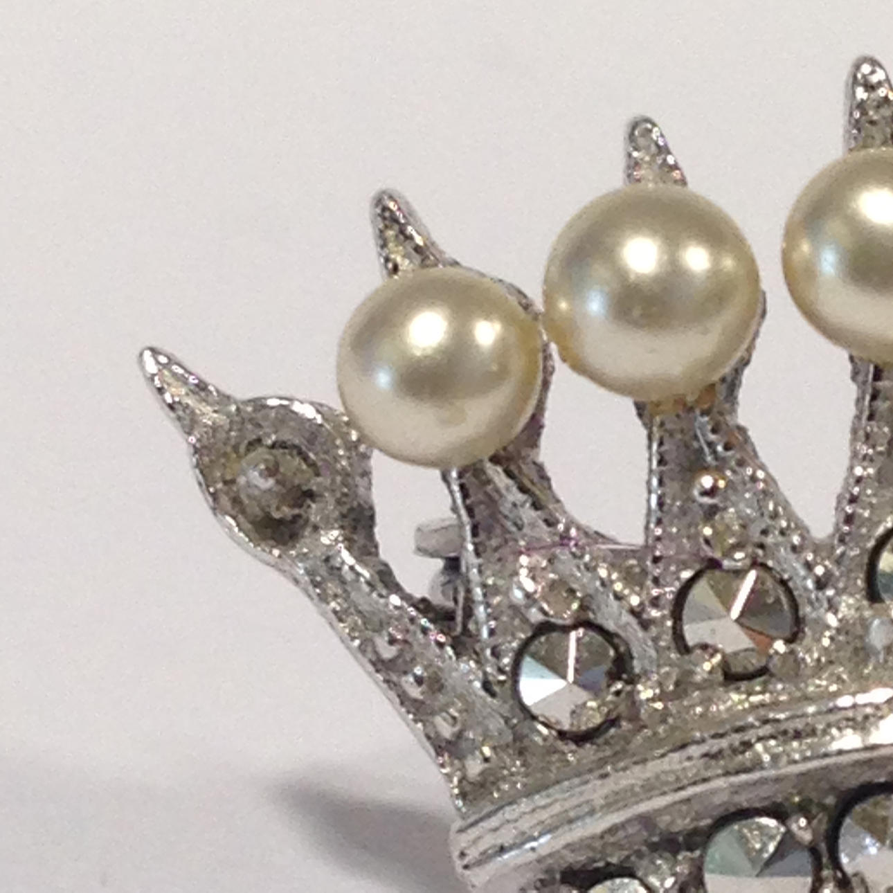 BROCHE DE CORONA: • Este broche es de plata belga (con el sello "A835") • Este broche de alfiler tiene forma de corona • Esta corona está engastada con 8 perlas de aljófar y 23 piedras de marcasita redondas de diferentes tamaños • Dimensiones aproximadas del broche : 27 x 16 mm • Peso del broche: 4,2 gramos BROCHE DE SOLAPA FLOR: • Este broche de clip es de plata Argentium (estampado "935") • Este broche de clip tiene un diseño floral • El frente de este artículo está completamente engastado en piedras redondas de marasita • Tamaño aproximado del broche: 40 x 16 mm • Peso del broche: 7,2 gramos Peso total: 11,4 gramos.