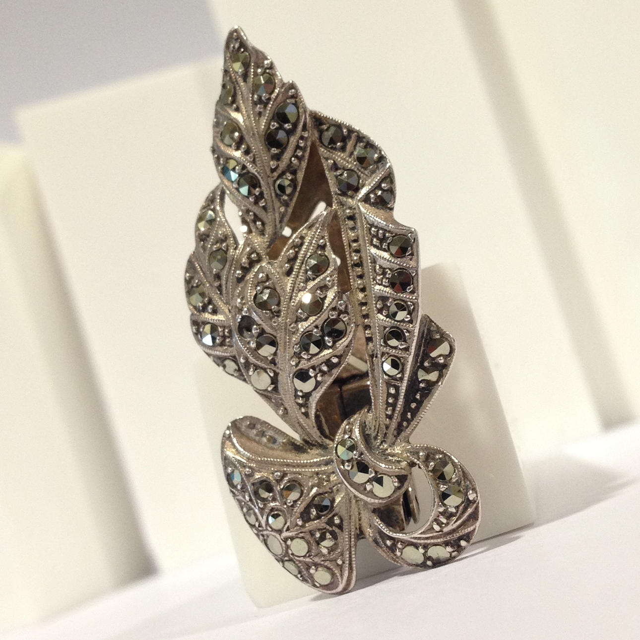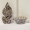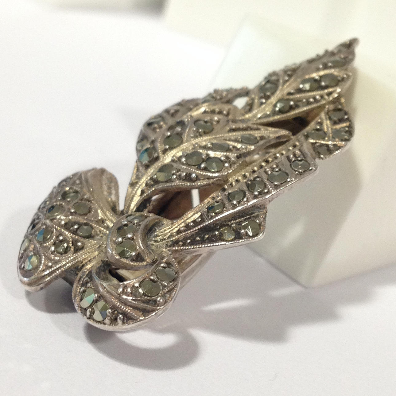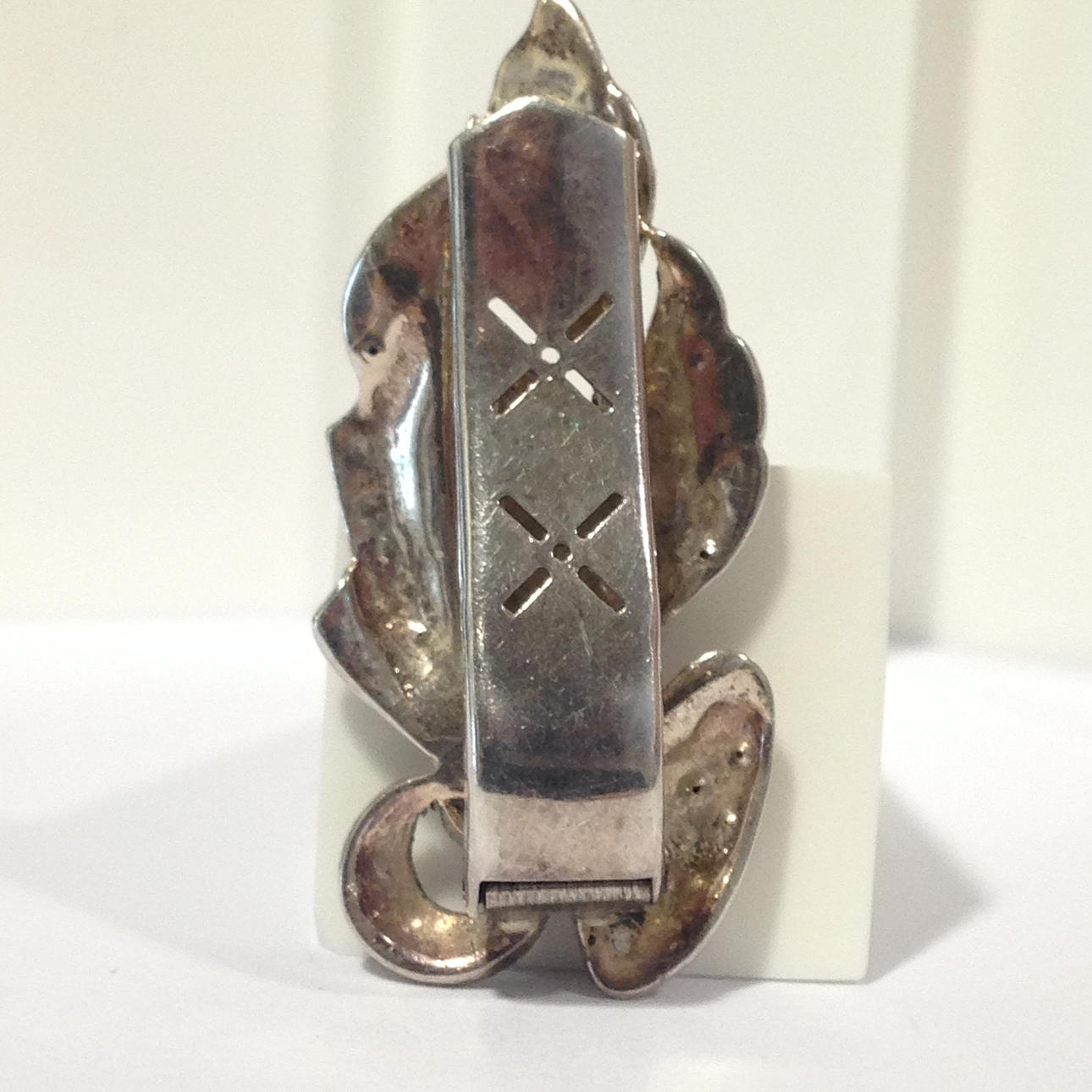 BROCHE DE CORONA: • Este broche es de plata belga (con el sello "A835") • Este broche de alfiler tiene forma de corona • Esta corona está engastada con 8 perlas de aljófar y 23 piedras de marcasita redondas de diferentes tamaños • Dimensiones aproximadas del broche : 27 x 16 mm • Peso del broche: 4,2 gramos BROCHE DE SOLAPA FLOR: • Este broche de clip es de plata Argentium (estampado "935") • Este broche de clip tiene un diseño floral • El frente de este artículo está completamente engastado en piedras redondas de marasita • Tamaño aproximado del broche: 40 x 16 mm • Peso del broche: 7,2 gramos Peso total: 11,4 gramos.