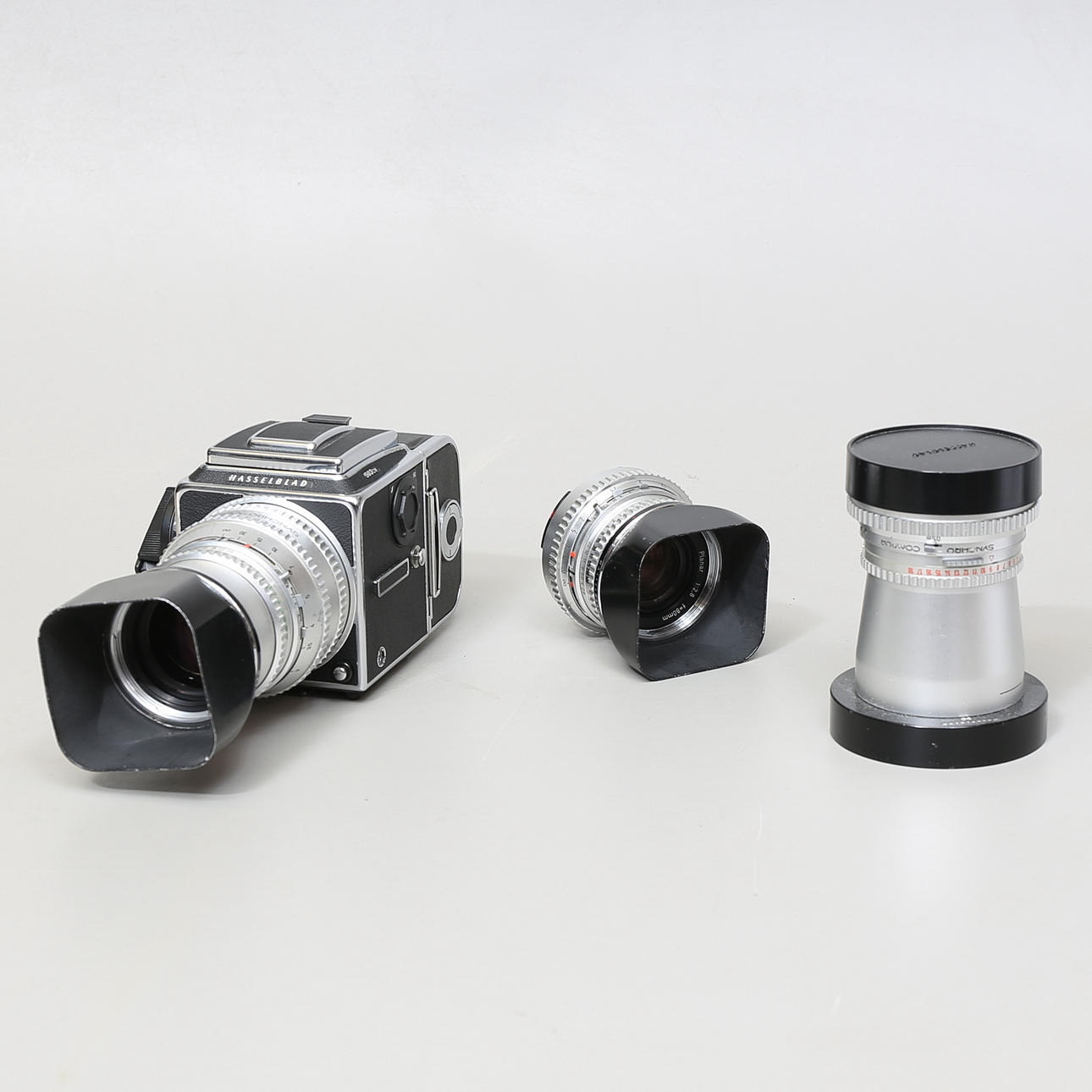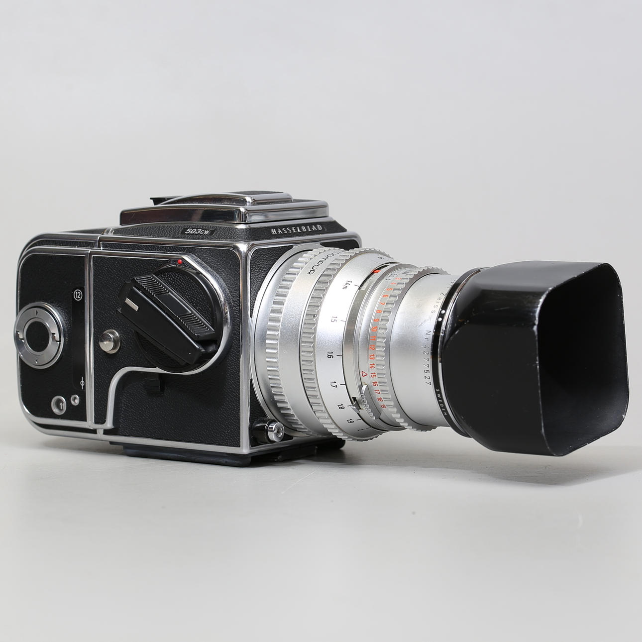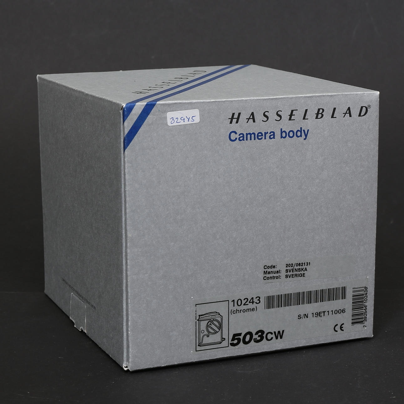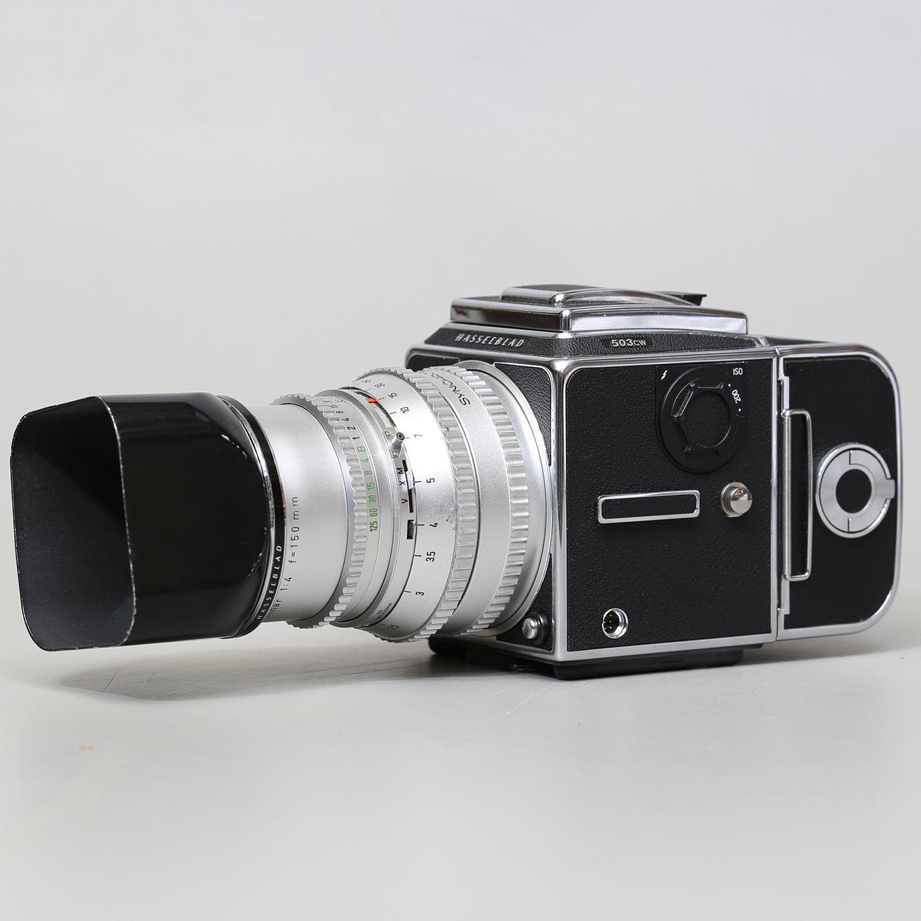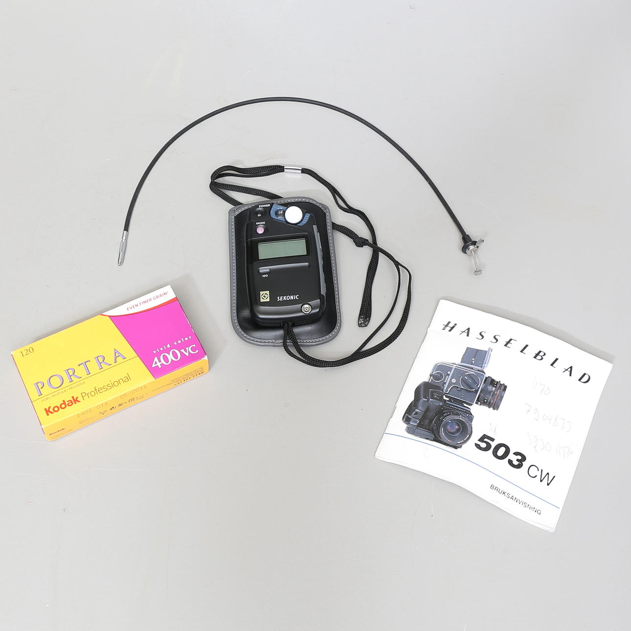 Hasselblad, estuche original, contenido: Cuerpo de la cámara: Hasselblad 503CW con tapa de carcasa Lente, Distagon 1:4, 50 mm, Carl Zeis, n.º 4344926, con tapa de lente Lente, Planar 1:2,8, 80 mm, Carl Zeis, n.º 4199977, sin tapa de lente Lente, Sonnar 1:4, 150 mm, Carl Zeis, n.° 4277527, sin tapa de lente Medidor de exposición, Sekonic, modelo L-3088, Japón Liberación remota 4 rollos de película, Portra, Kodak.