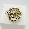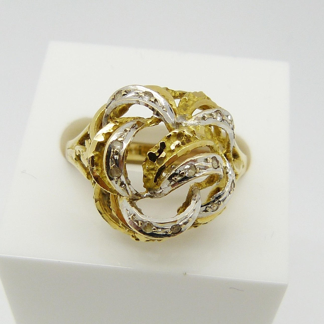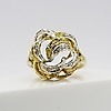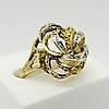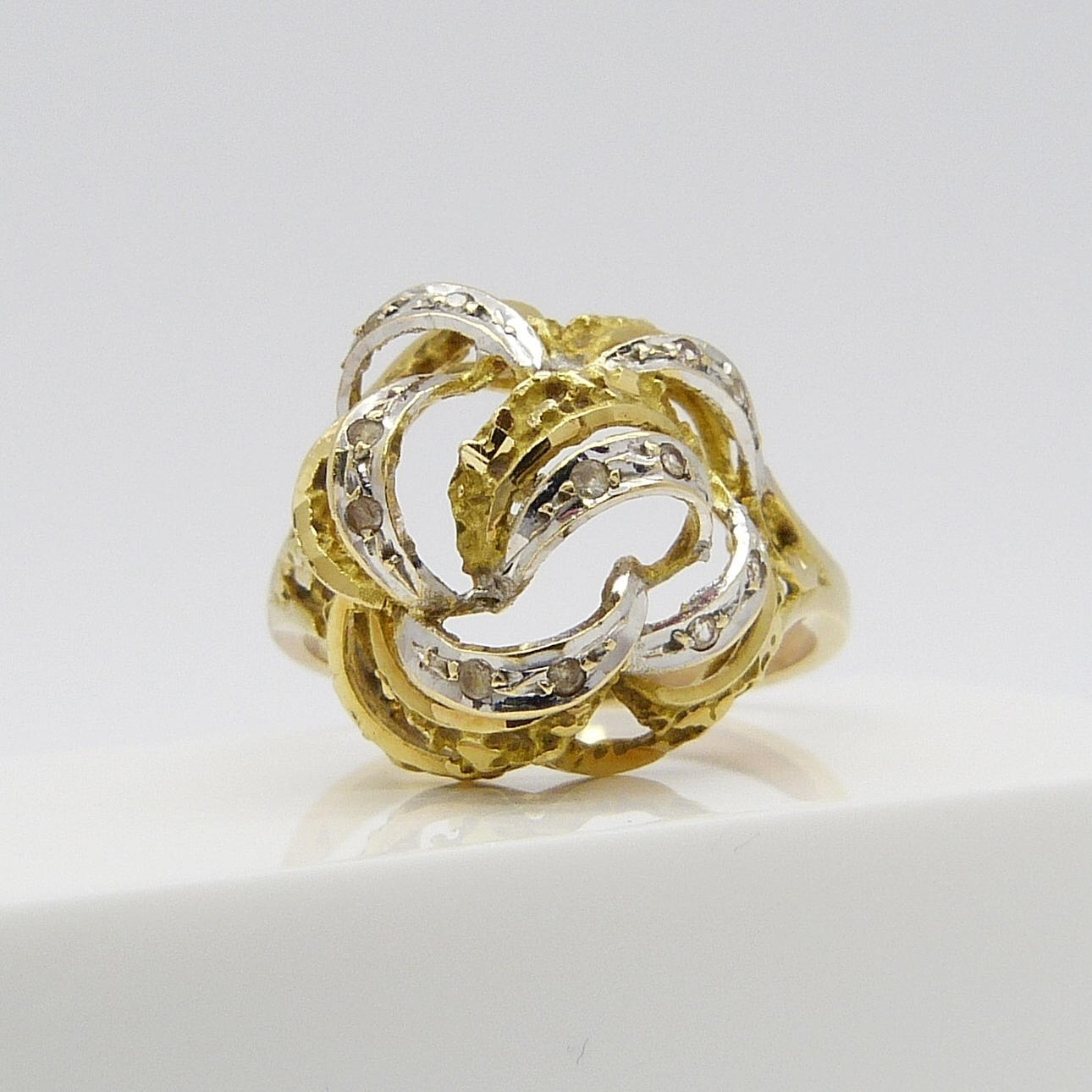 Un anillo con diseño de flor/remolino de oro amarillo y blanco de alto quilate, engarzado en pasta.