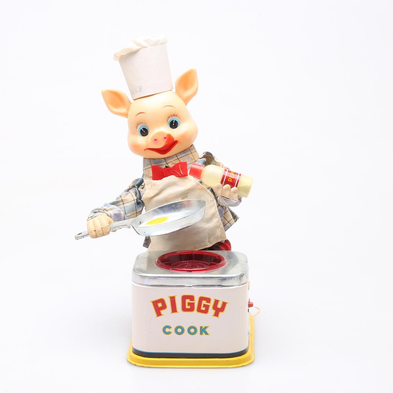 Juguete a pilas que representa a un cerdo cocinando. 25cm Cocinero cerdito. Y Japón, 1960s. Caja original.