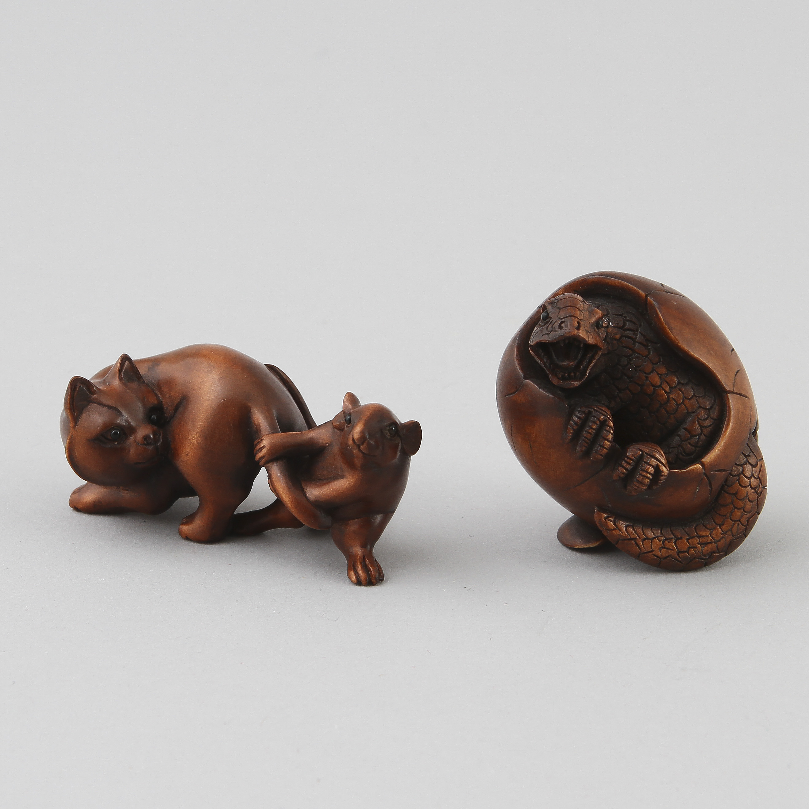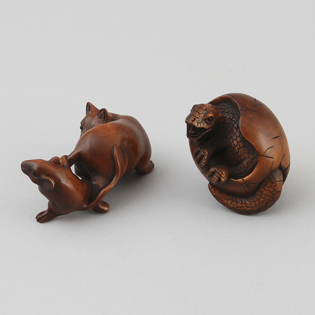 114654. NETSUKE, 2 piezas, madera, Japón, cartel.