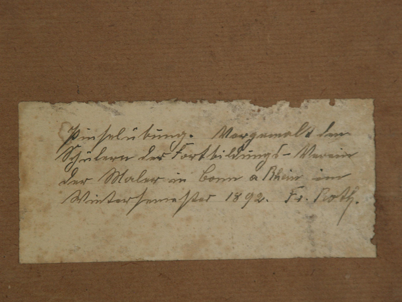 Plantilla de ejercicio - Gárgola grotesca, dibujo a pincel sobre cartón, verso antigua nota adhesiva manuscrita "Pinselexercise. Prepintado para los estudiantes de la asociación de formación avanzada de pintores de Bonn en el semestre de invierno de 1892. "Fr. Roth", aprox. golpeado.