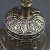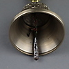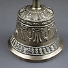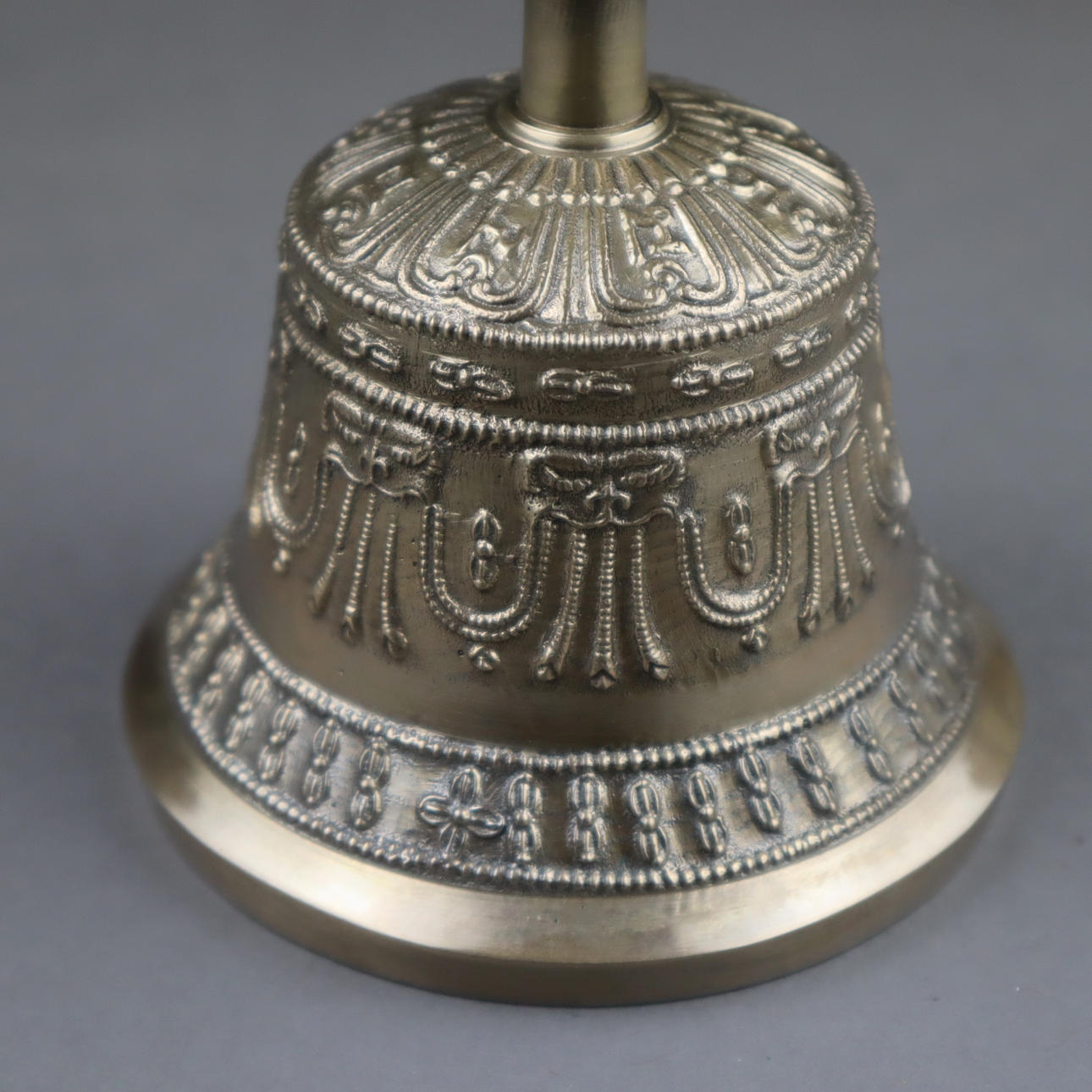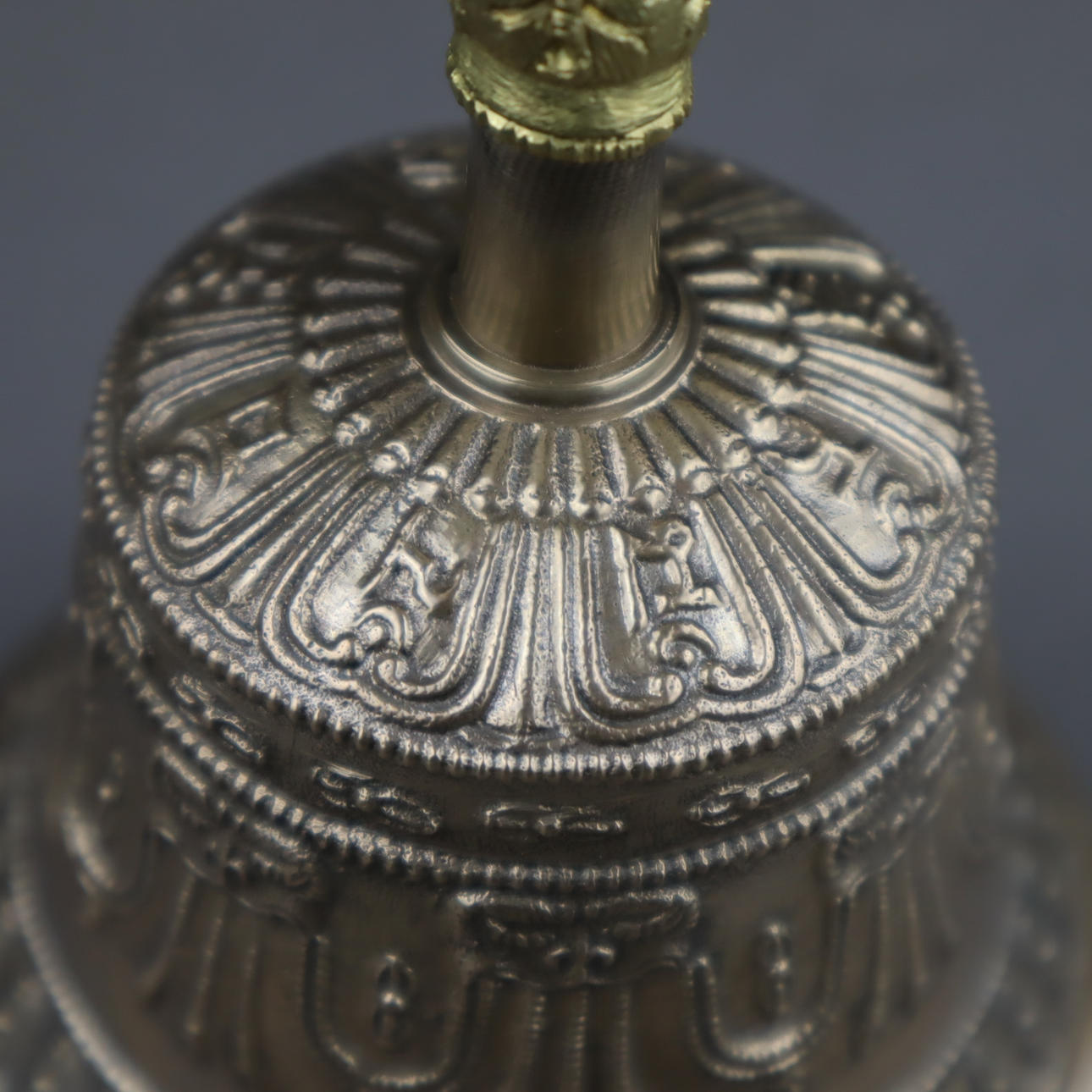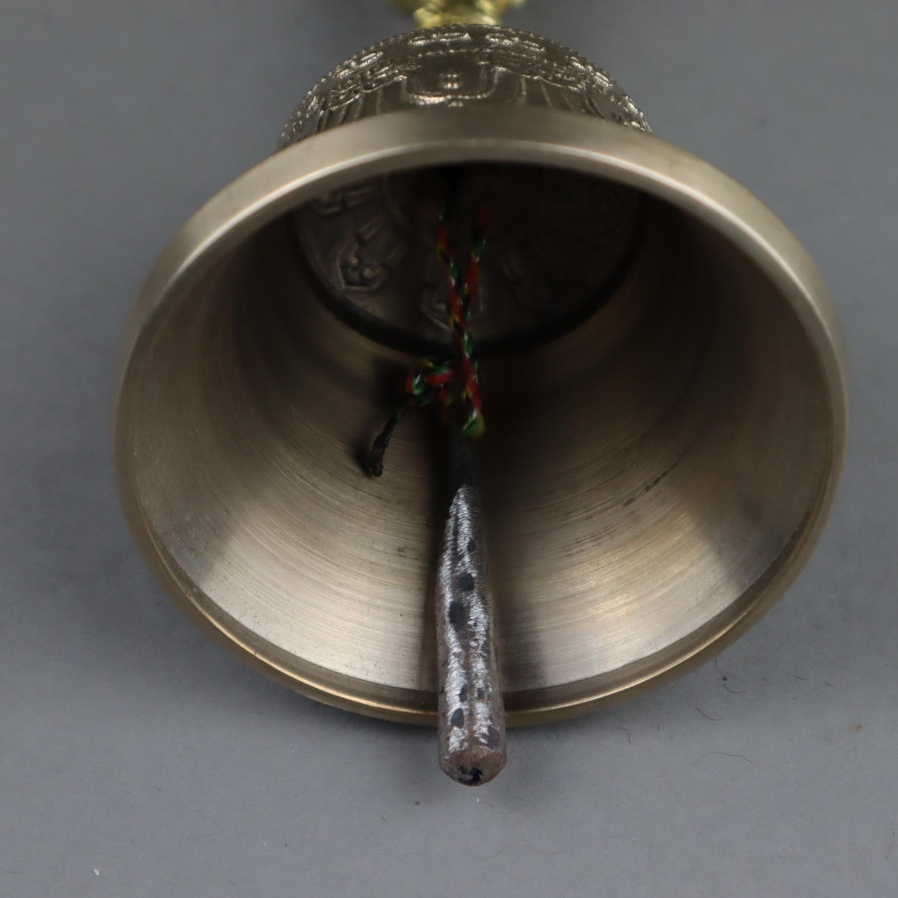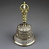 Ghanta - Tíbet/China, campana ritual, metal fundido de dos piezas, parcialmente dorado, el cuerpo de la campana decorado con frisos decorativos circundantes: en el hombro, debajo de una corona de pétalos angostos, ocho grandes pétalos de loto con sílabas bija tibetanas inscritas (de ocho diosas) , vajras colocados horizontalmente enmarcados debajo de filas de perlas, guirnaldas de cabeza de león corriendo alrededor del centro, en el borde inferior hay una cadena de vajras dispuestos verticalmente entre dos bandas de perlas, el mango siempre trabajado por separado con un jarrón de longevidad en la base, la cabeza de la diosa de la sabiduría trascendente Prajnaparamita aparece sobre ella con llamativos aretes y una gran corona de ocho hojas, la cual porta un disco lunar sobre el cual descansa el medio vajra, este consta de cuatro barras que brotan de estilizadas bocas Macara, de altura aprox. 15,5 cm, peso aproximado 209 g.