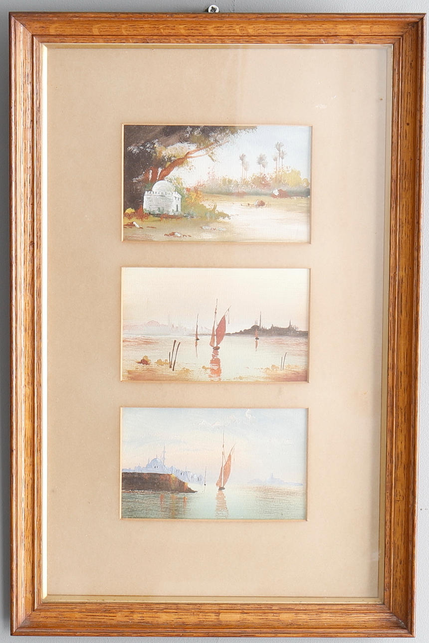 principios del siglo XX, cada uno con vistas turísticas: falucas en el Nilo, pirámides, etc. Enmarcados como dos juegos de tres en monturas comunes, dos marcos de roble y vidriados, el marco un poco más grande: 50 x 30 cm (2).