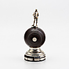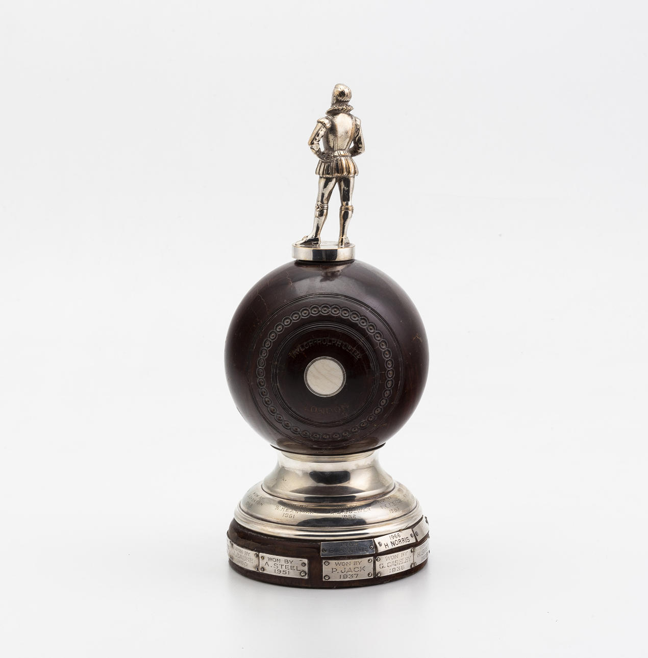 Con pequeña escultura de Francis Drake. En la base, placas con los nombres y fechas de los ganadores del trofeo. Inscripción en un medallón: "Prittlewell Bowling Club, Junior Championship. Presented by W. H. Bridge, esq."