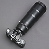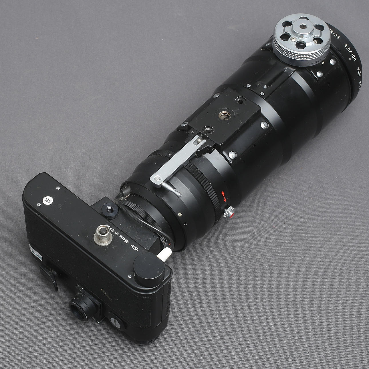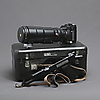 Cámara con lente y empuñadura de pistola para montar la cámara. En una caja de hojalata.