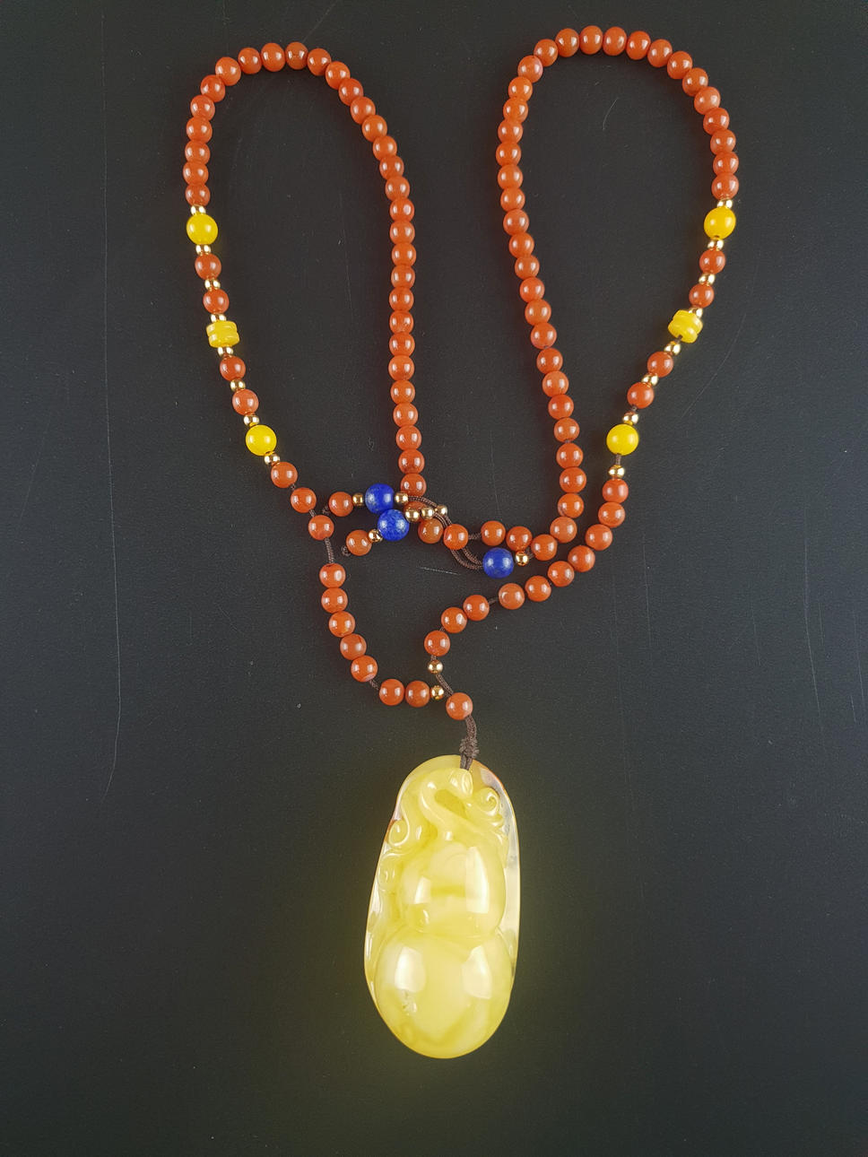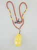 Amuleto de ámbar - China, talla finísima en forma de calabaza doble con zarcillos de voluta, trabajada a modo de altorrelieve, en China la calabaza es considerada símbolo de suerte, pues el legendario Xian (taoísta. Inmortales) llevaban consigo sus elixires de larga duración en recipientes sujetos a sus cinturones, ámbar de aproximadamente 5x2,7 cm, en una cadena con cuentas de jaspe, entre cuentas y discos de ámbar claro, longitud total: aproximadamente 60 cm.