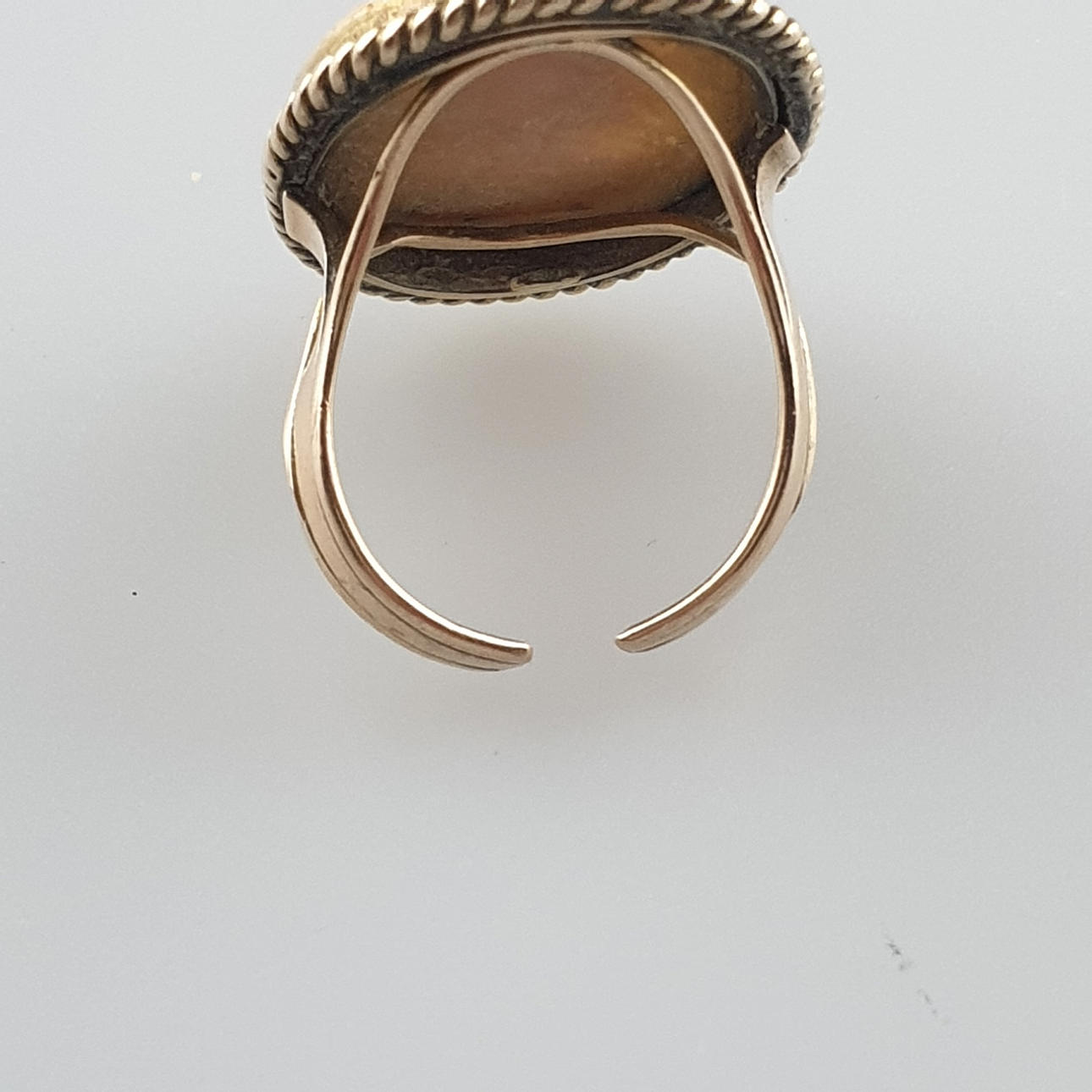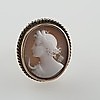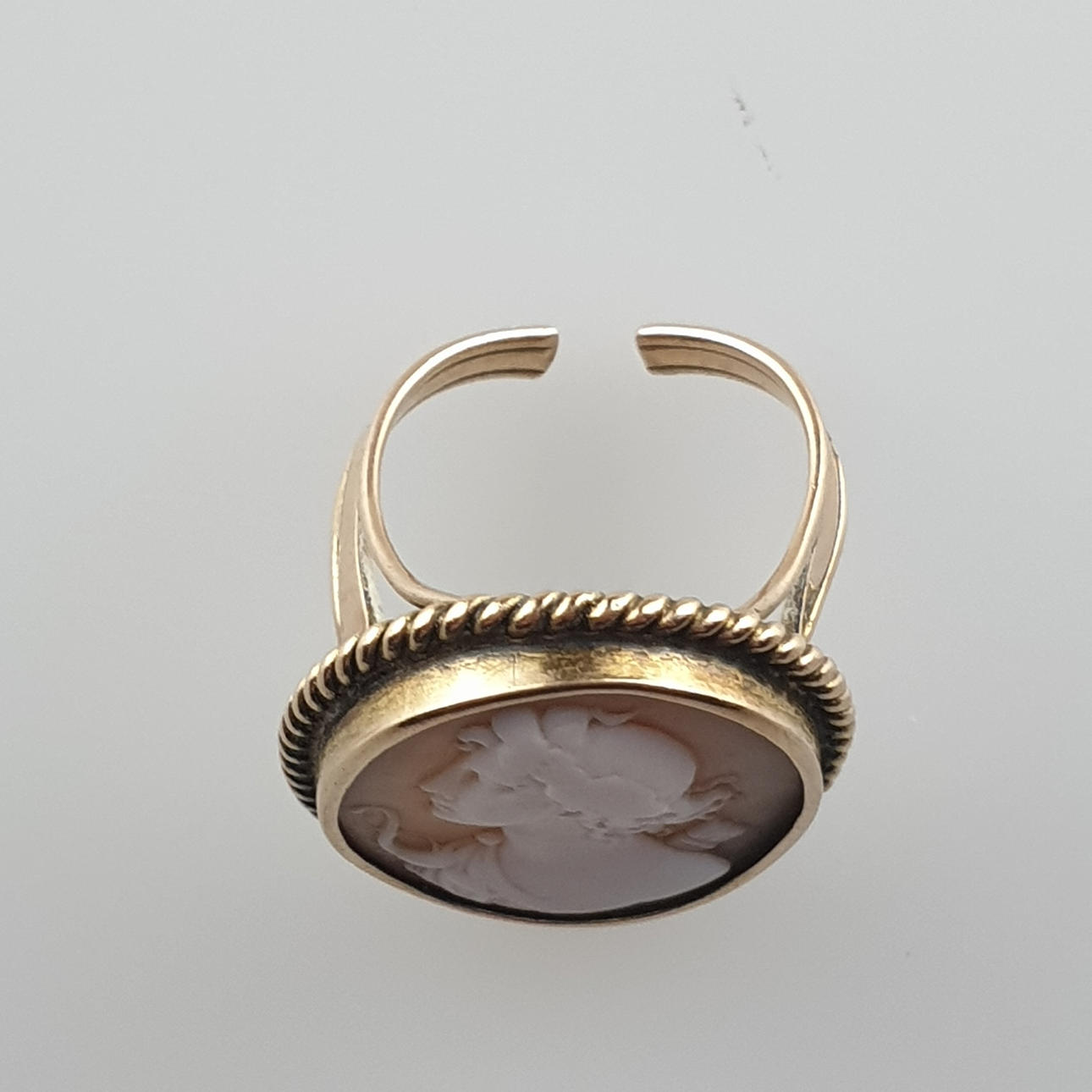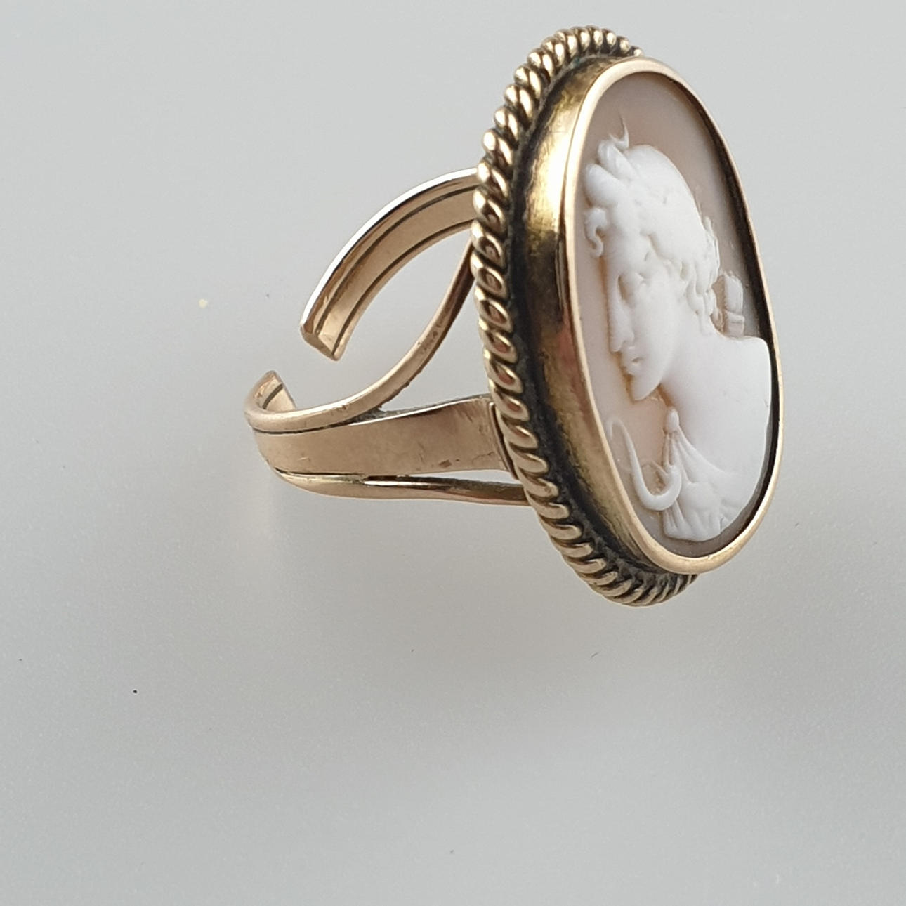 Anillo con camafeo: oro amarillo, estampado "585" y marca maestra, engastado con un camafeo de concha ovalada con una representación finamente tallada de Diana, la diosa de la caza, aproximadamente 21x19 mm, anillo abierto, aproximadamente 7 g.