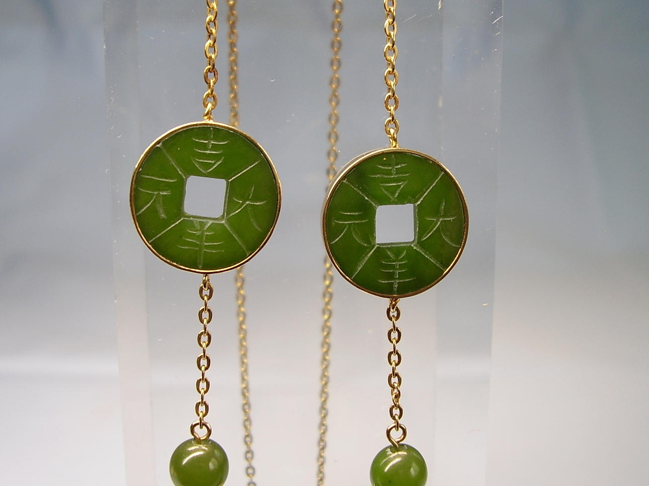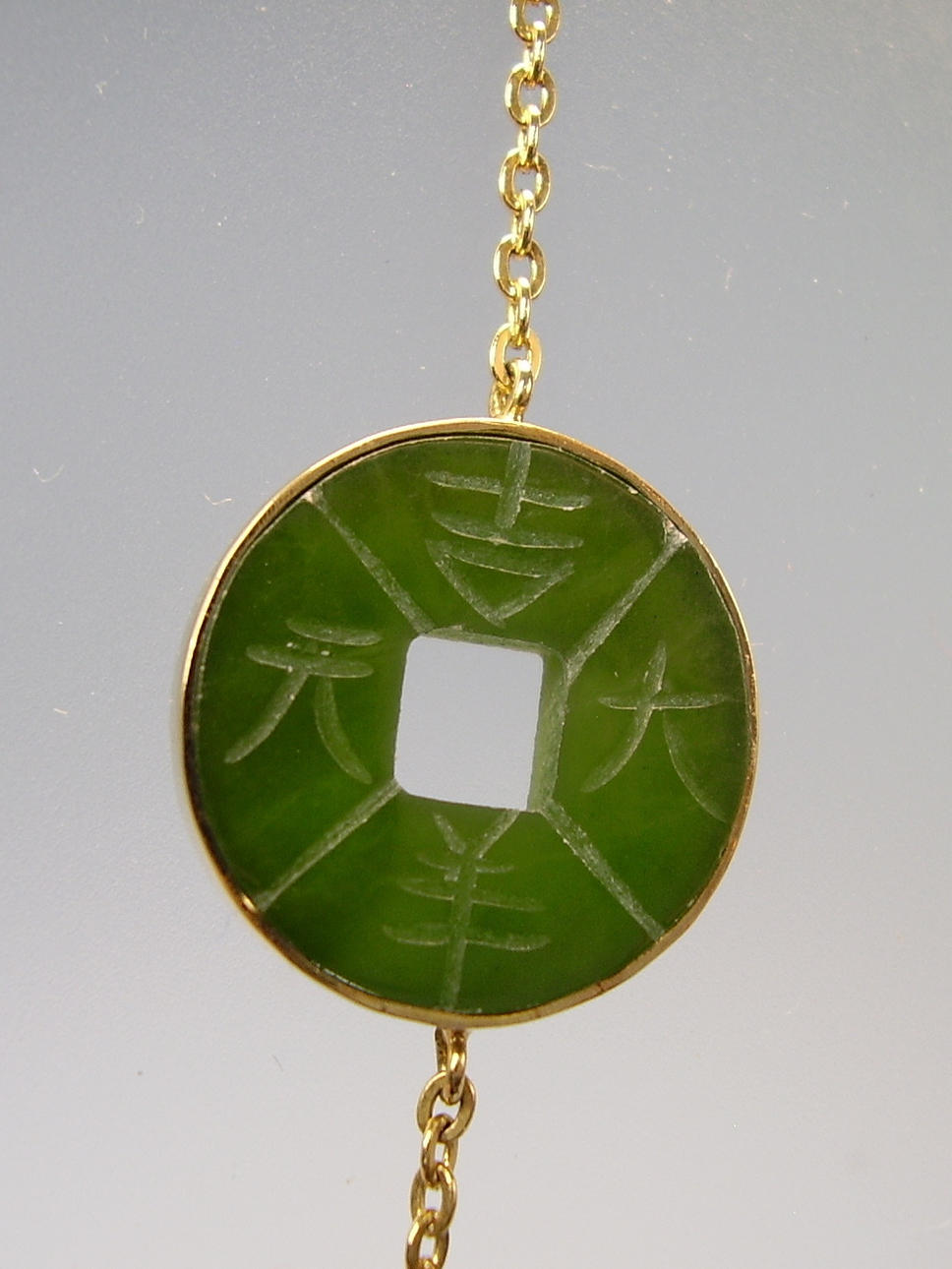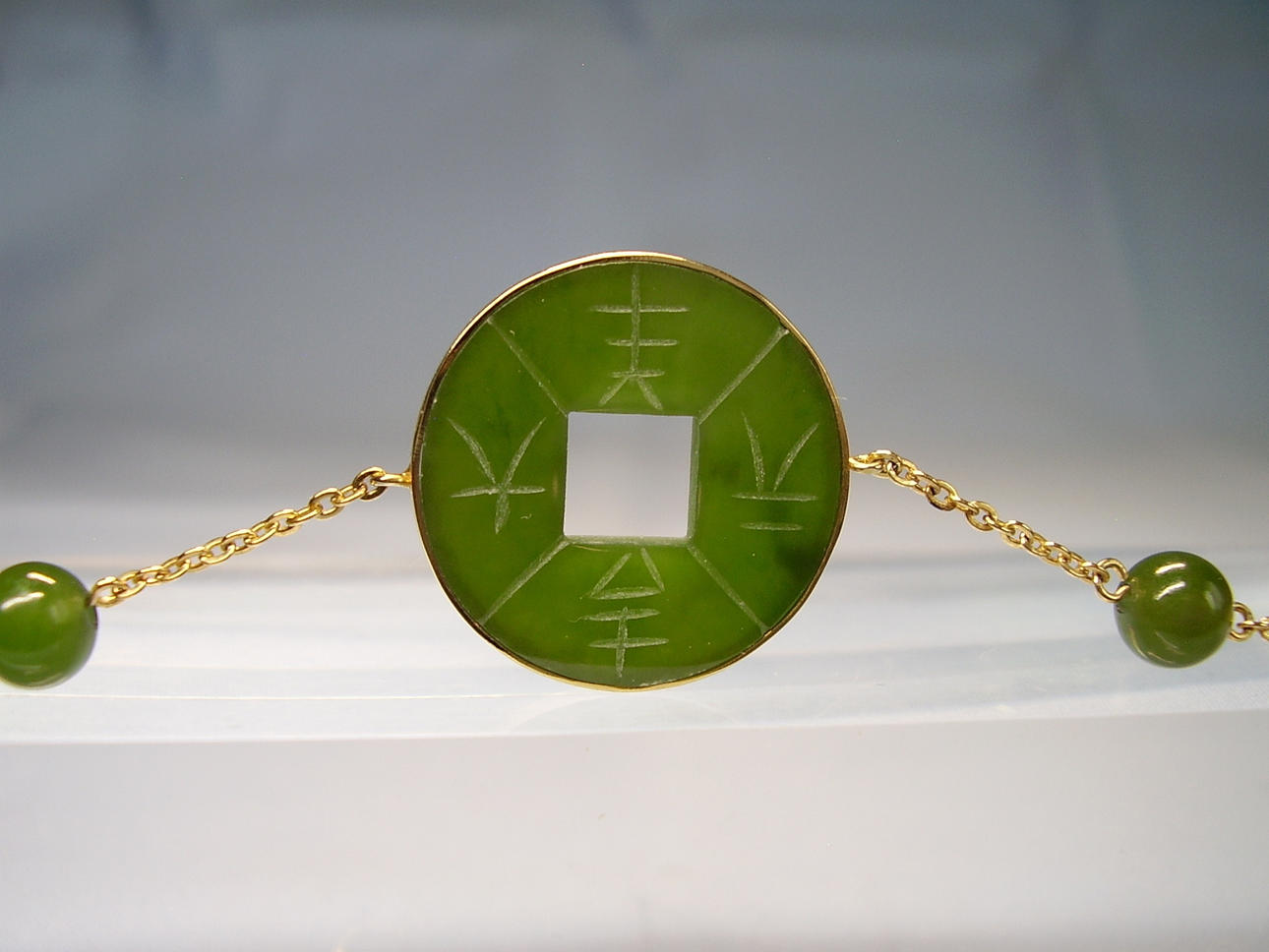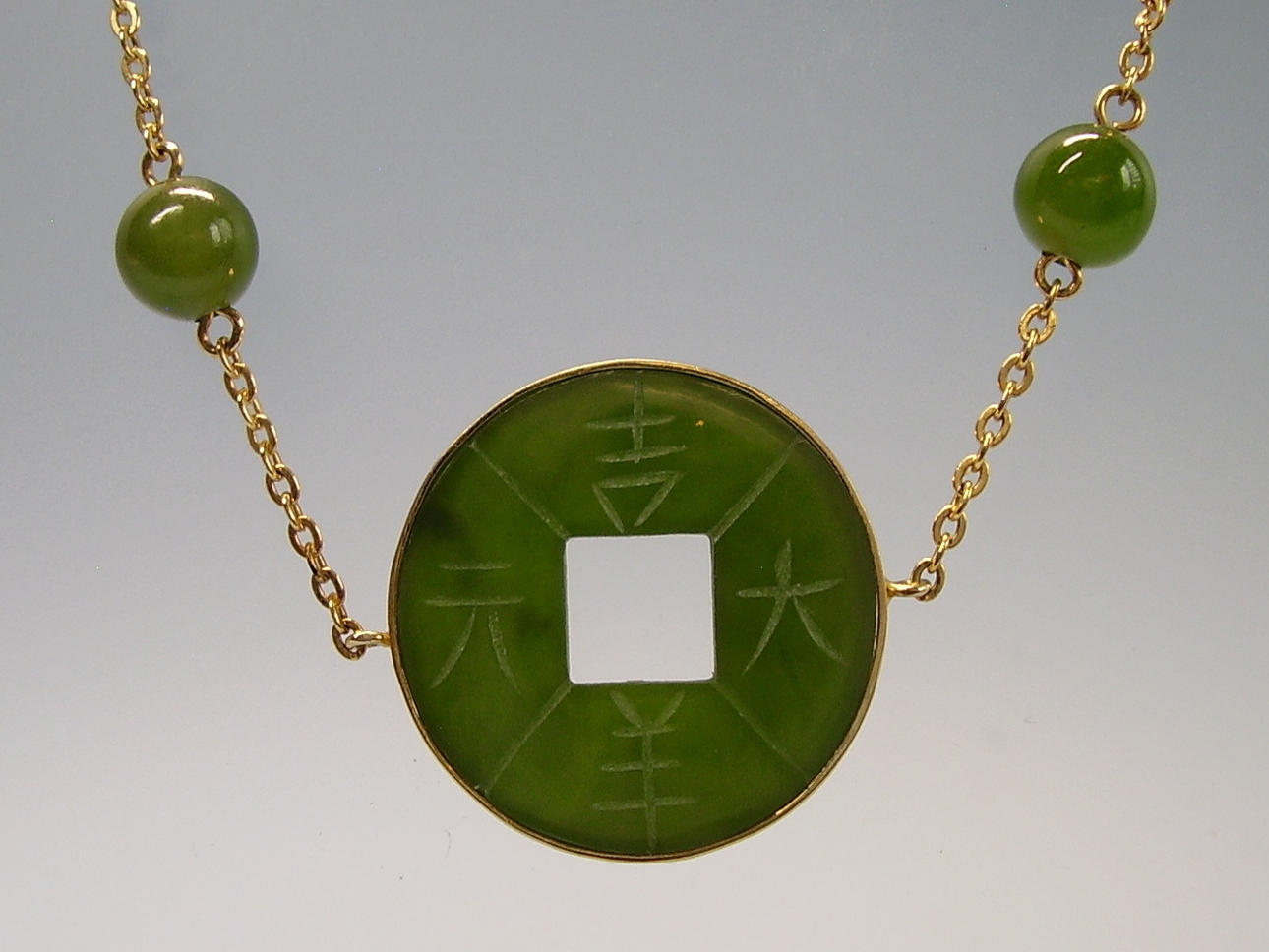 El collar presenta 5 discos de jade redondos y planos en forma de monedas perforadas, que están grabados a mano con caracteres chinos en ambos lados.