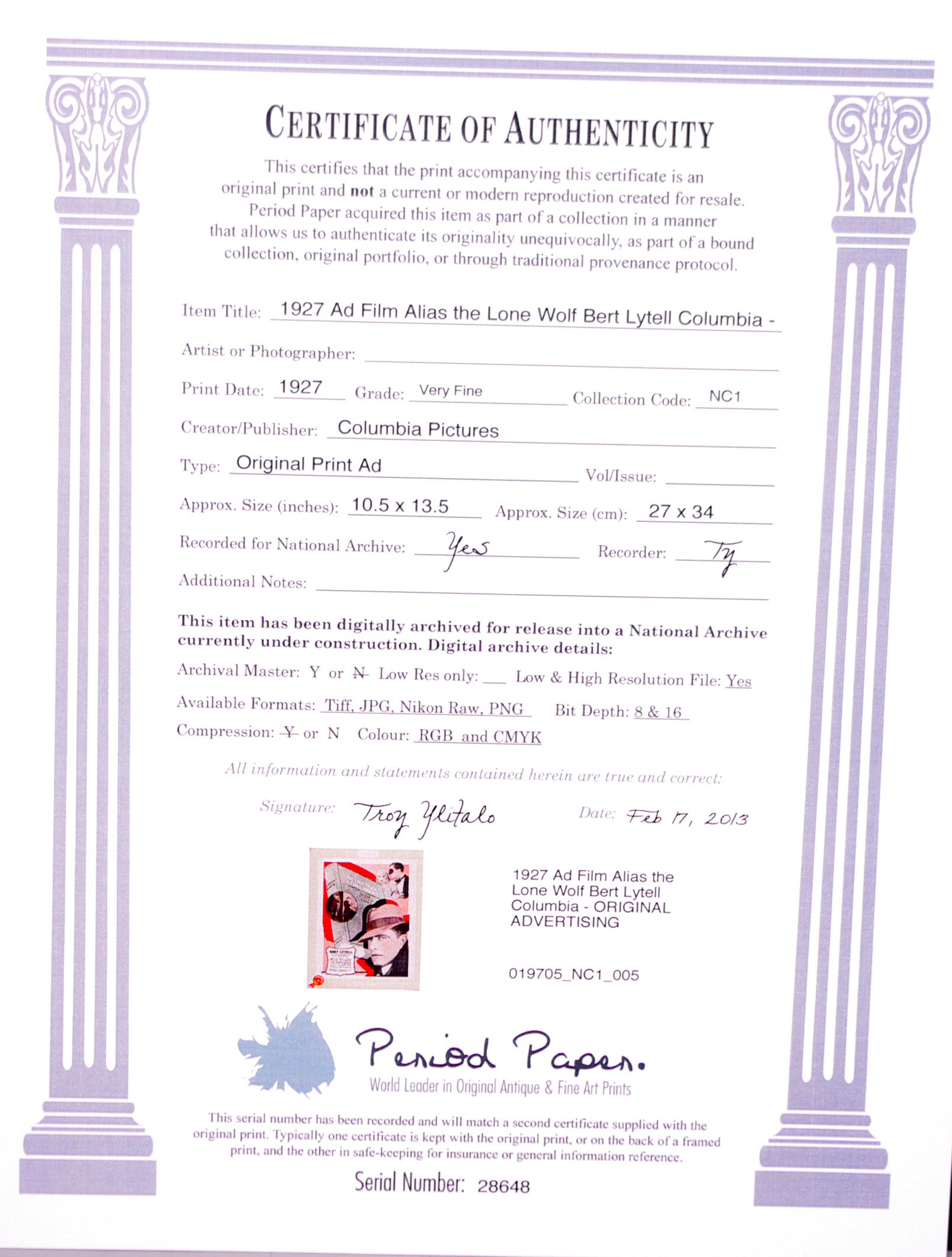 125506. CARTEL DE PELÍCULA, impresión original 1927.