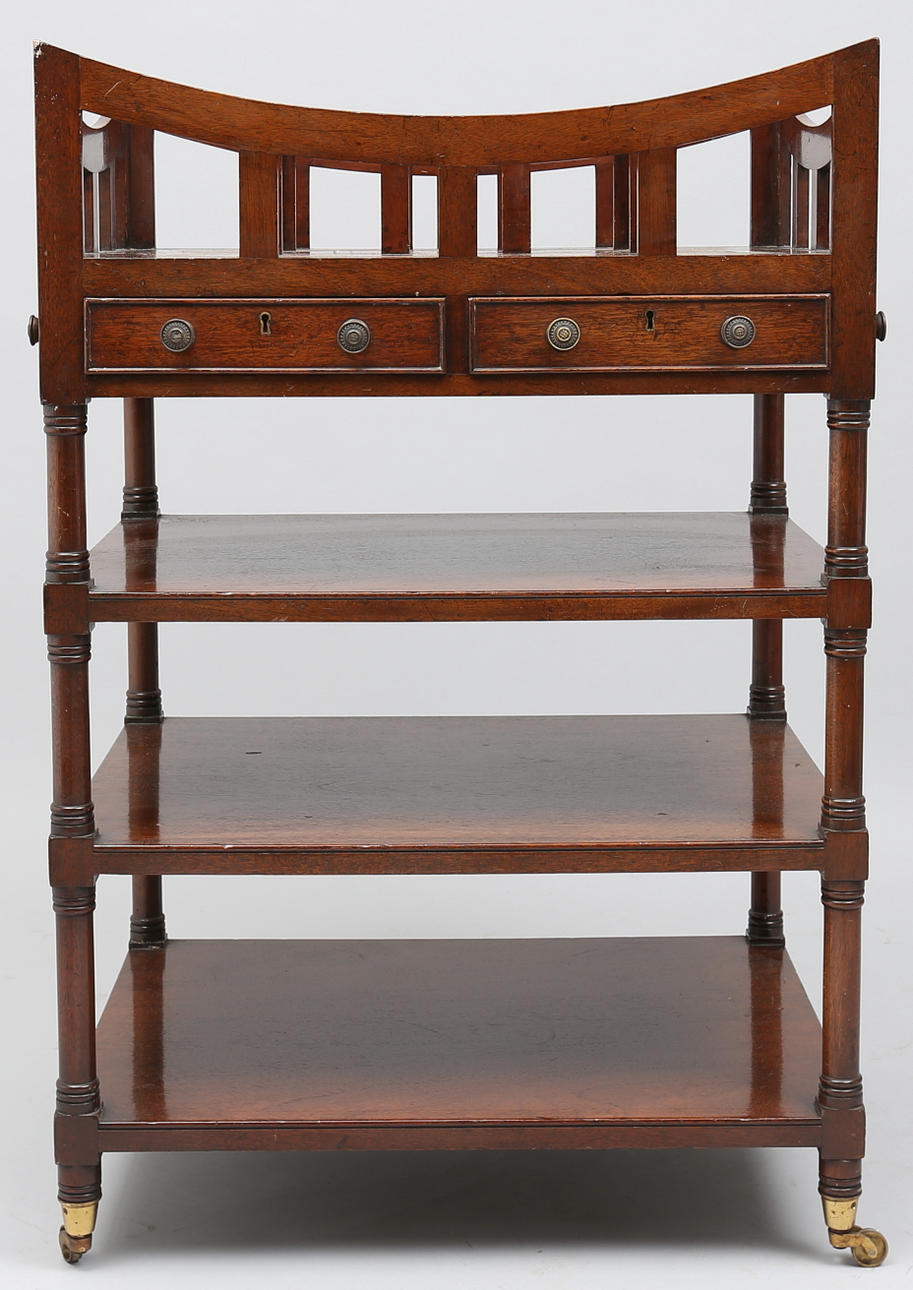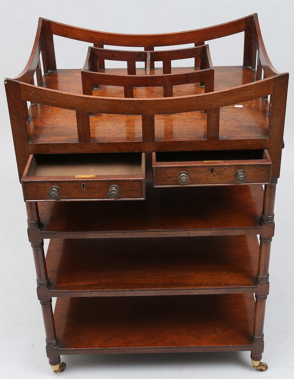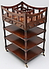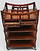 Caoba, barra rectangular/carrito de servicio con tres estantes, ocho indicados, pero solo dos cajones extraíbles.