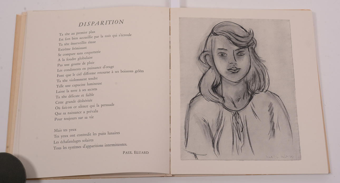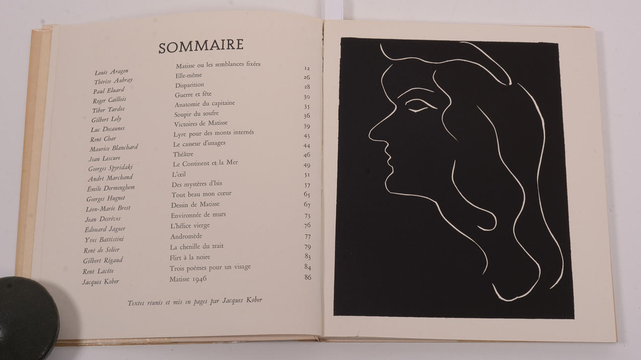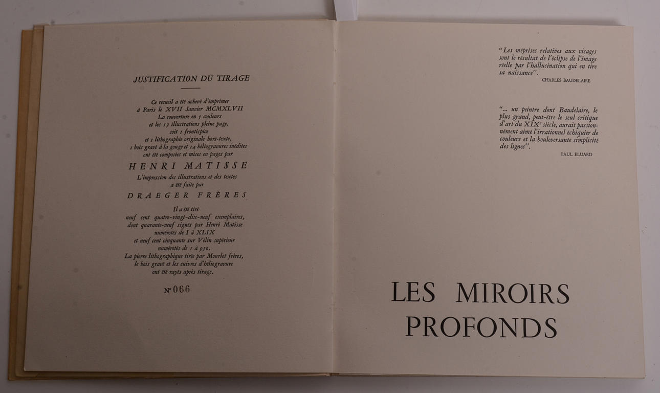 Maeight. París 1947. Ilustración: Avec 2 litografías originales y 14 heliograbados. 88 págs. Gr. 8v Broché, tres bon. Couverture originale, lithographe d'après gouache decoupée. Litografía del frontispicio. . El libro Exemplaire 66/ 950 tiene portada y contraportada Diseños Mattisse litográficos de 5 colores de peces y pájaros en estilo de papel recortado; contenido completo que incluye la ilustración del frontispicio, dos ilustraciones en las páginas 11 y 21 con protectores de tejido intactos y 14 ilustraciones en heliograbado en b/n; Esta copia incluye el raro estuche de cartón con cubierta interior protectora de papel azul claro para el libro.