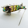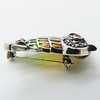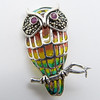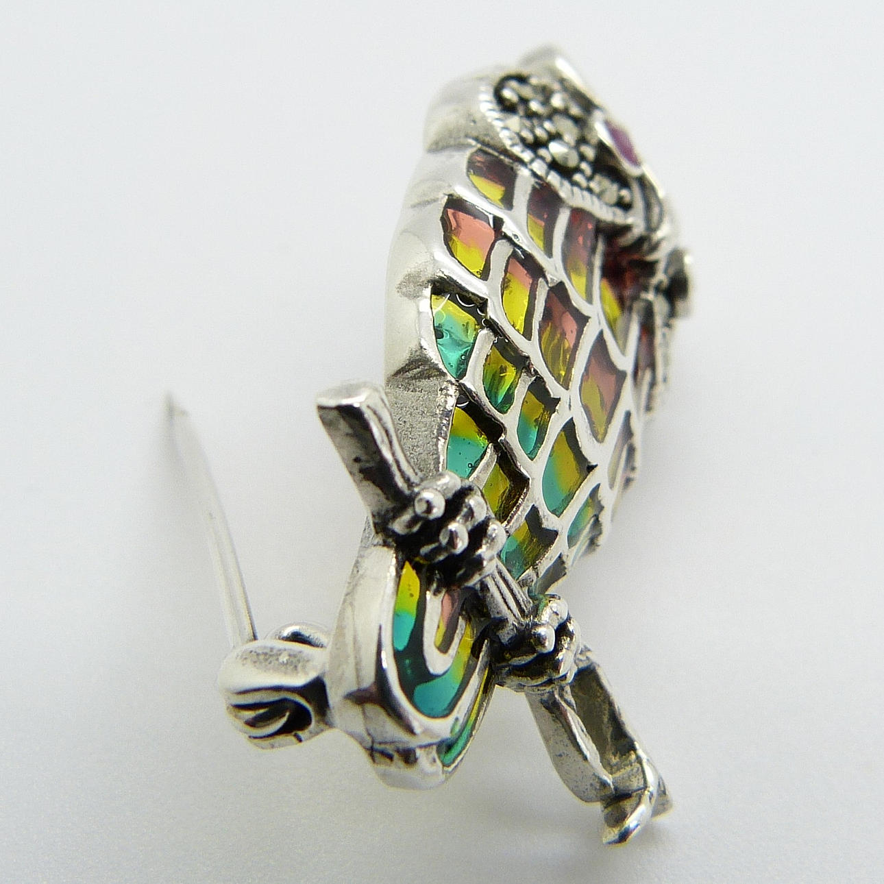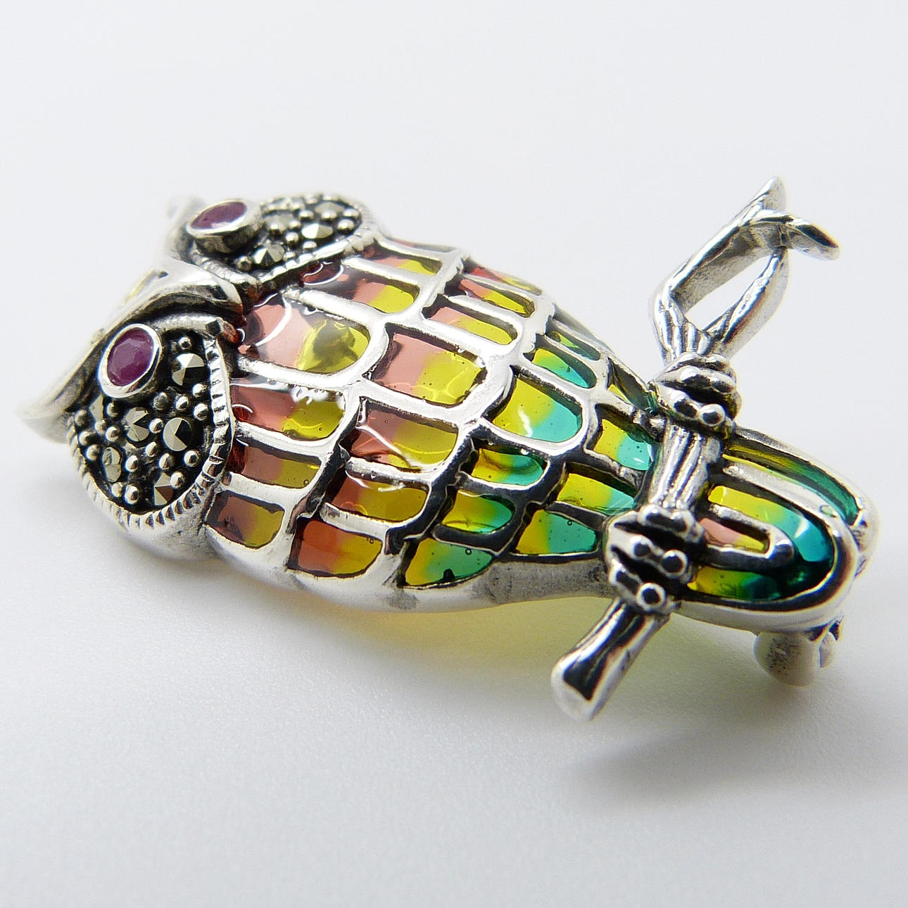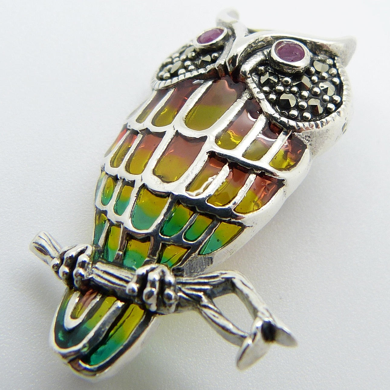 Un broche de plata que representa un búho posado, engastado con rubíes y marcasitas e incrustaciones de esmalte multicolor.