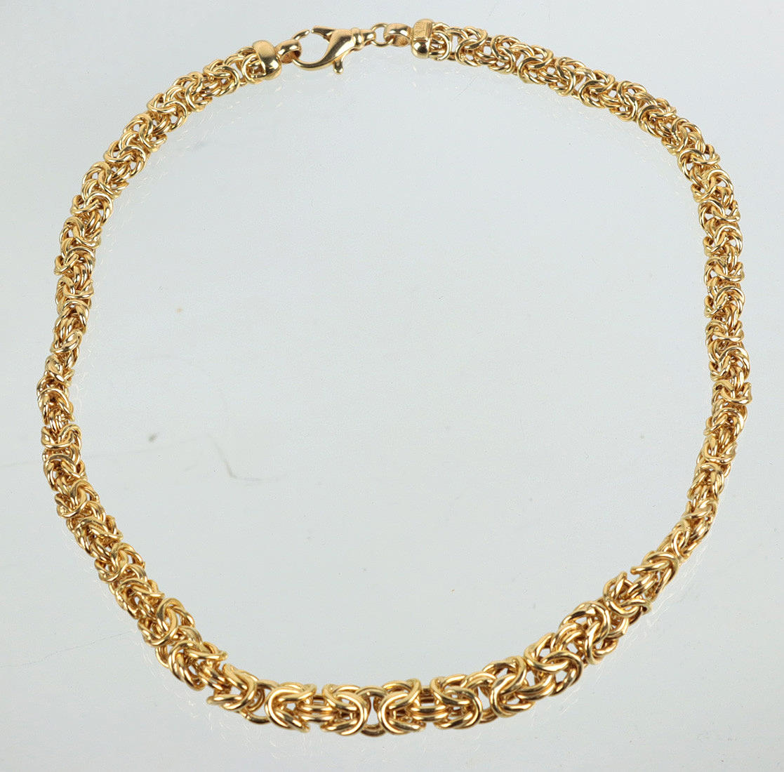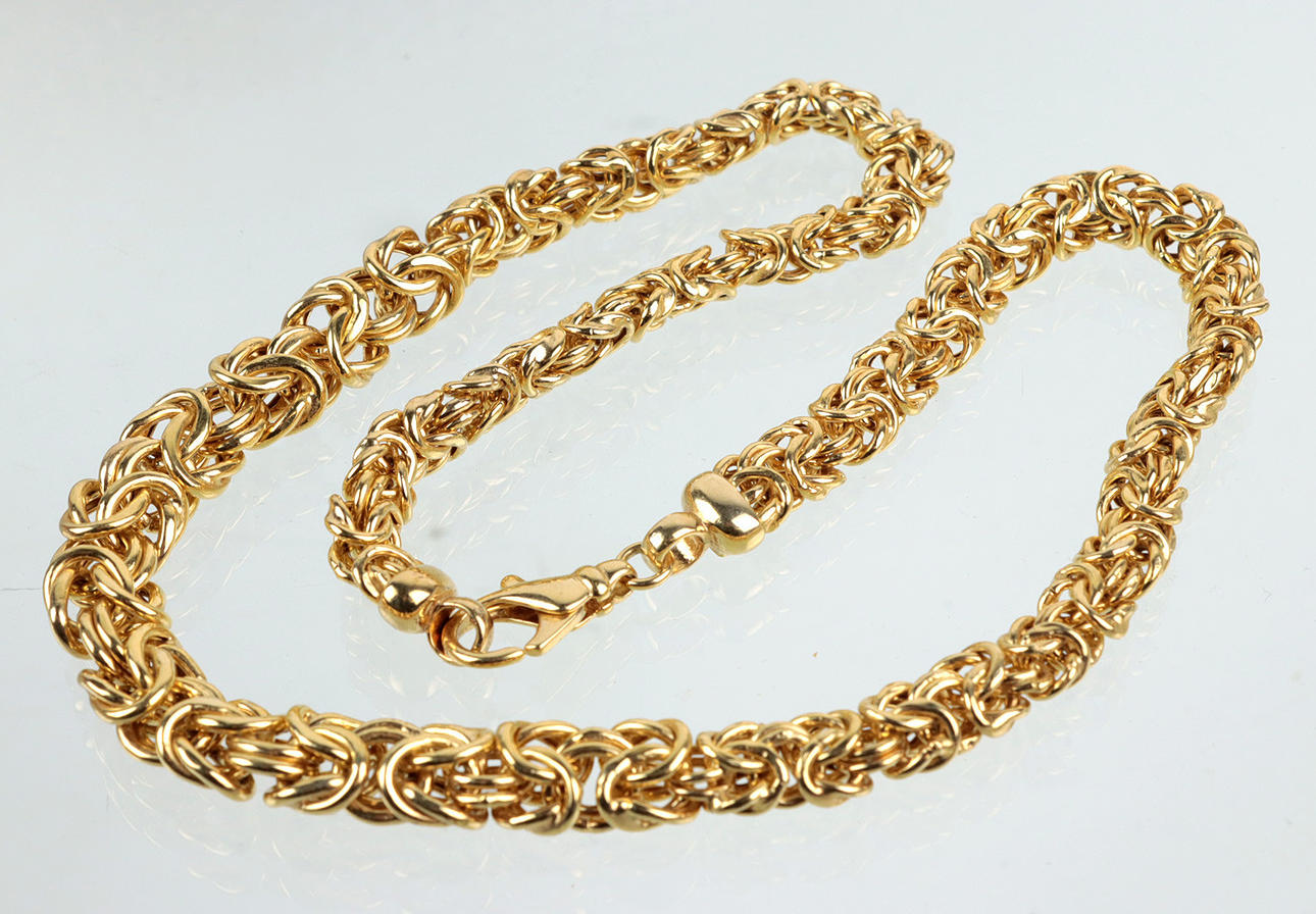 trabajado en plata 925 y con sello de Italia, completamente chapado en oro, collar llamativo en forma de cadena de rey redondeada y ligeramente aplanada sobre aprox. 8,3 a 10,3 mm de ancho, longitud con cierre de mosquetón aprox. 46 cm, peso aprox. 34,8 gramos.