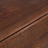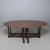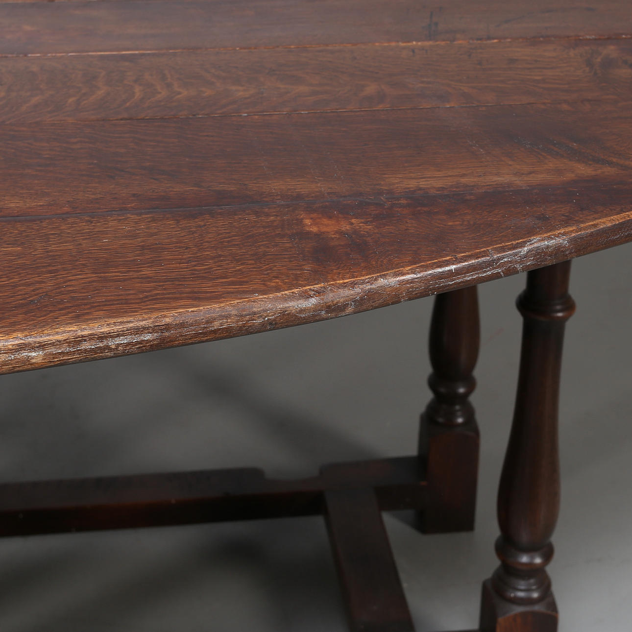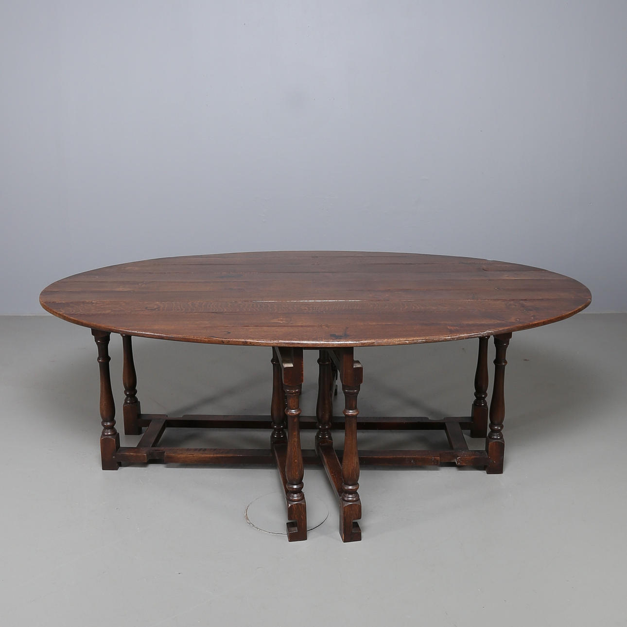 Mesa de roble teñido oscuro, tapa ovalada, patas en forma de balaustre, puertas dobles, la tapa está suelta en la base, dimensiones aproximadas 152x228 cm, altura 76 cm.