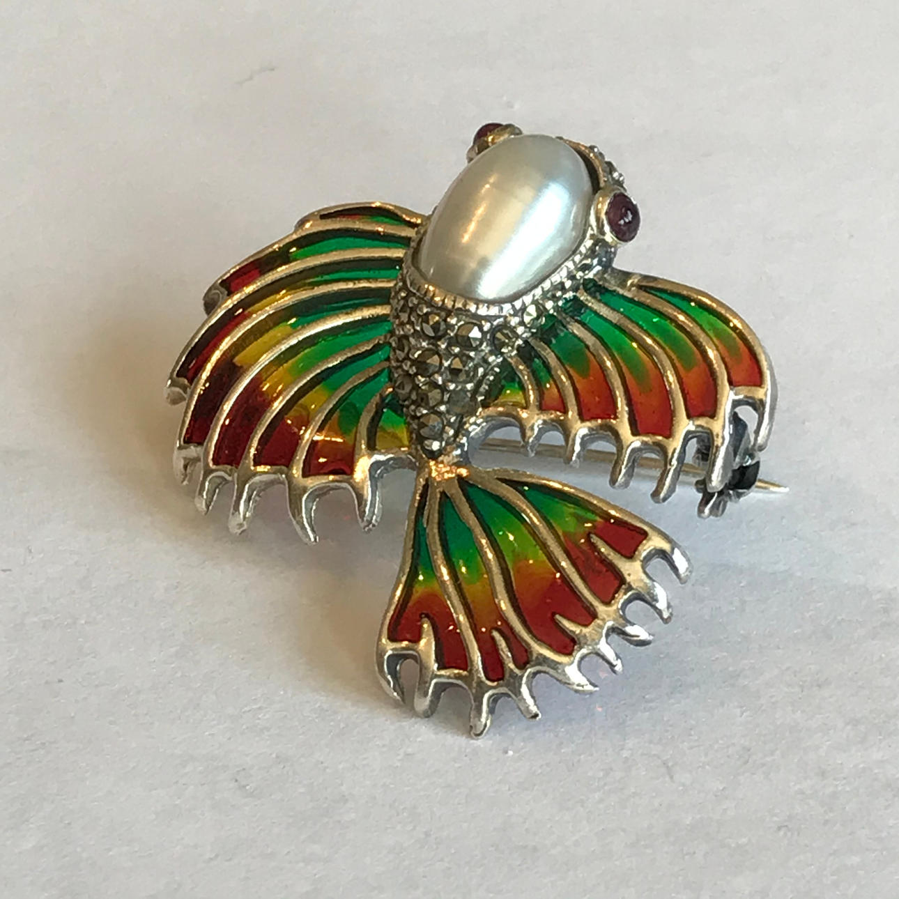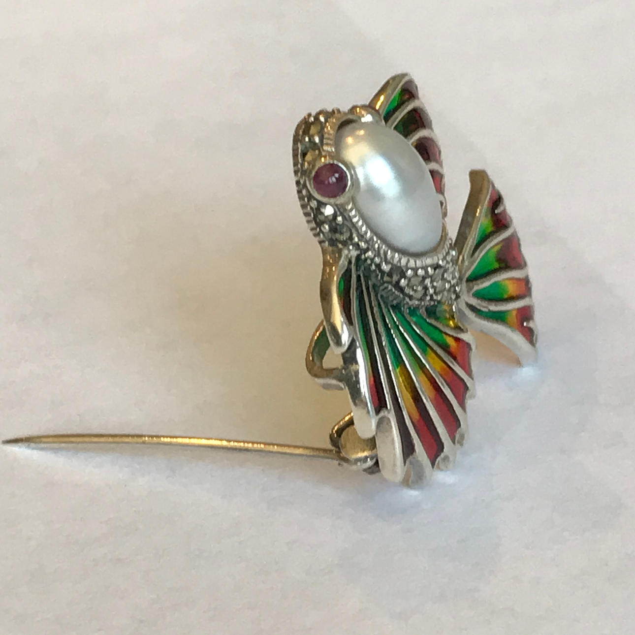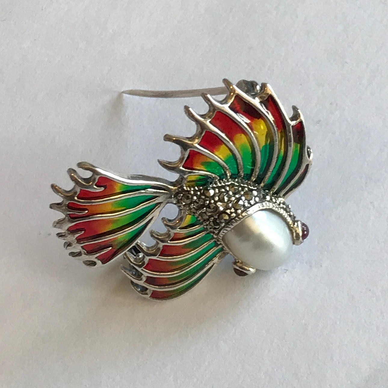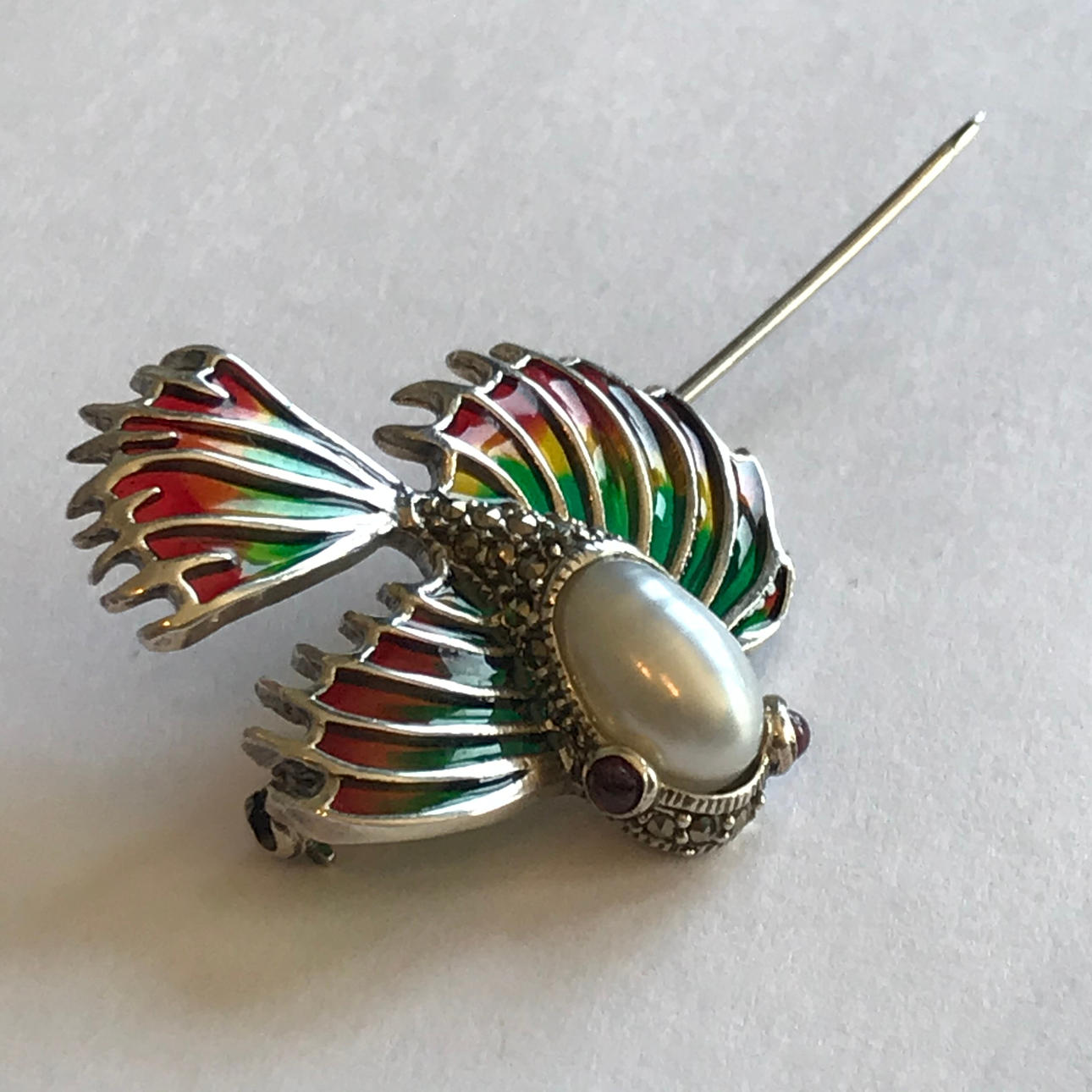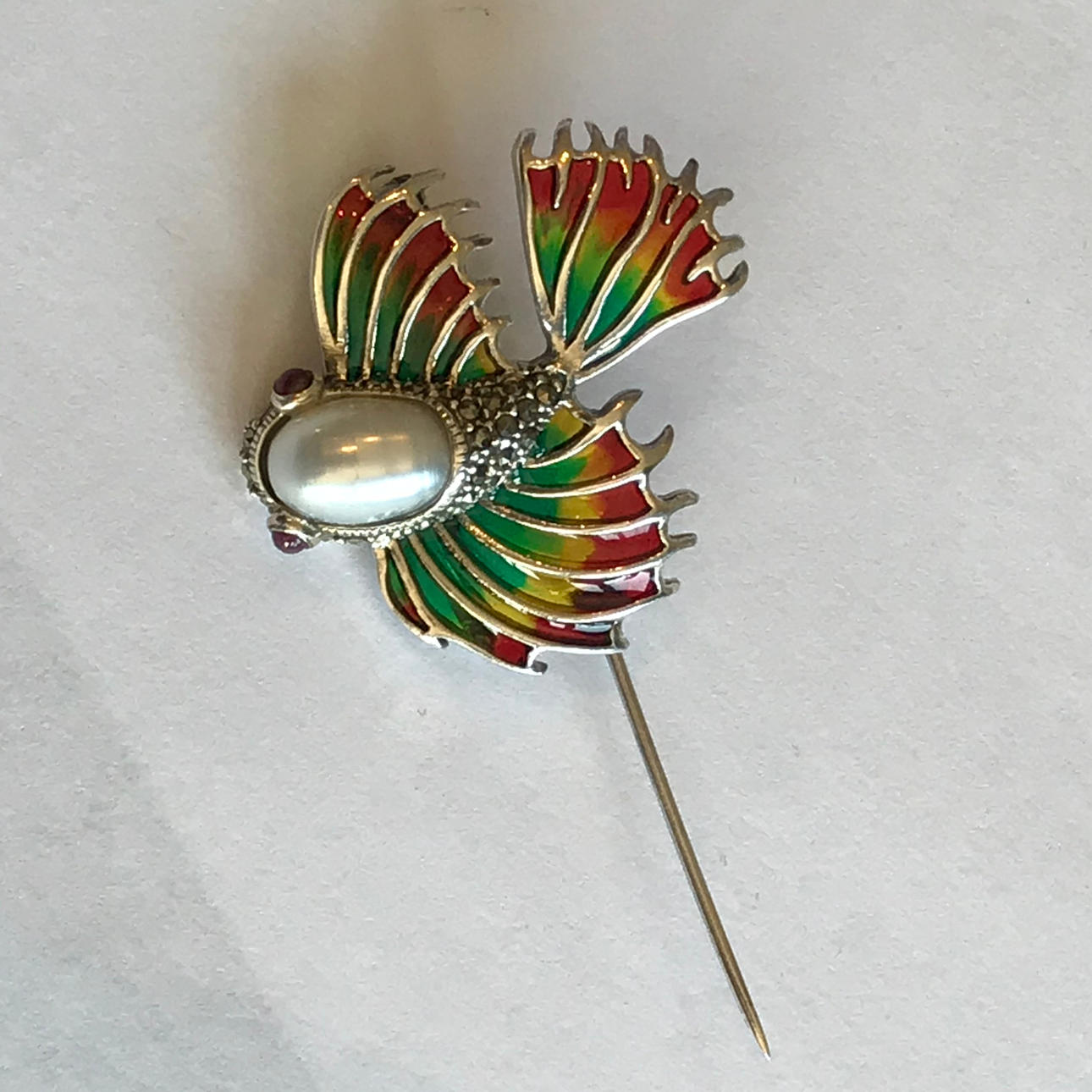 El cuerpo del pez está engastado con piedras de marcasita y las aletas están rellenas de plique a jour en colores rojo, amarillo y verde.
